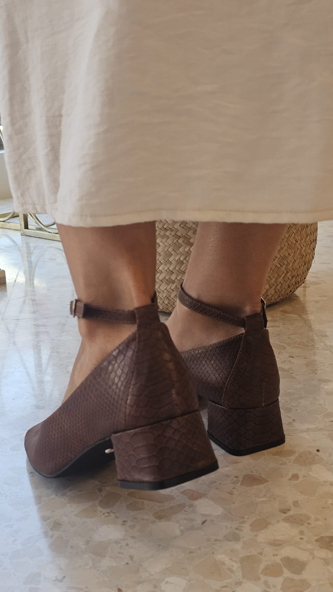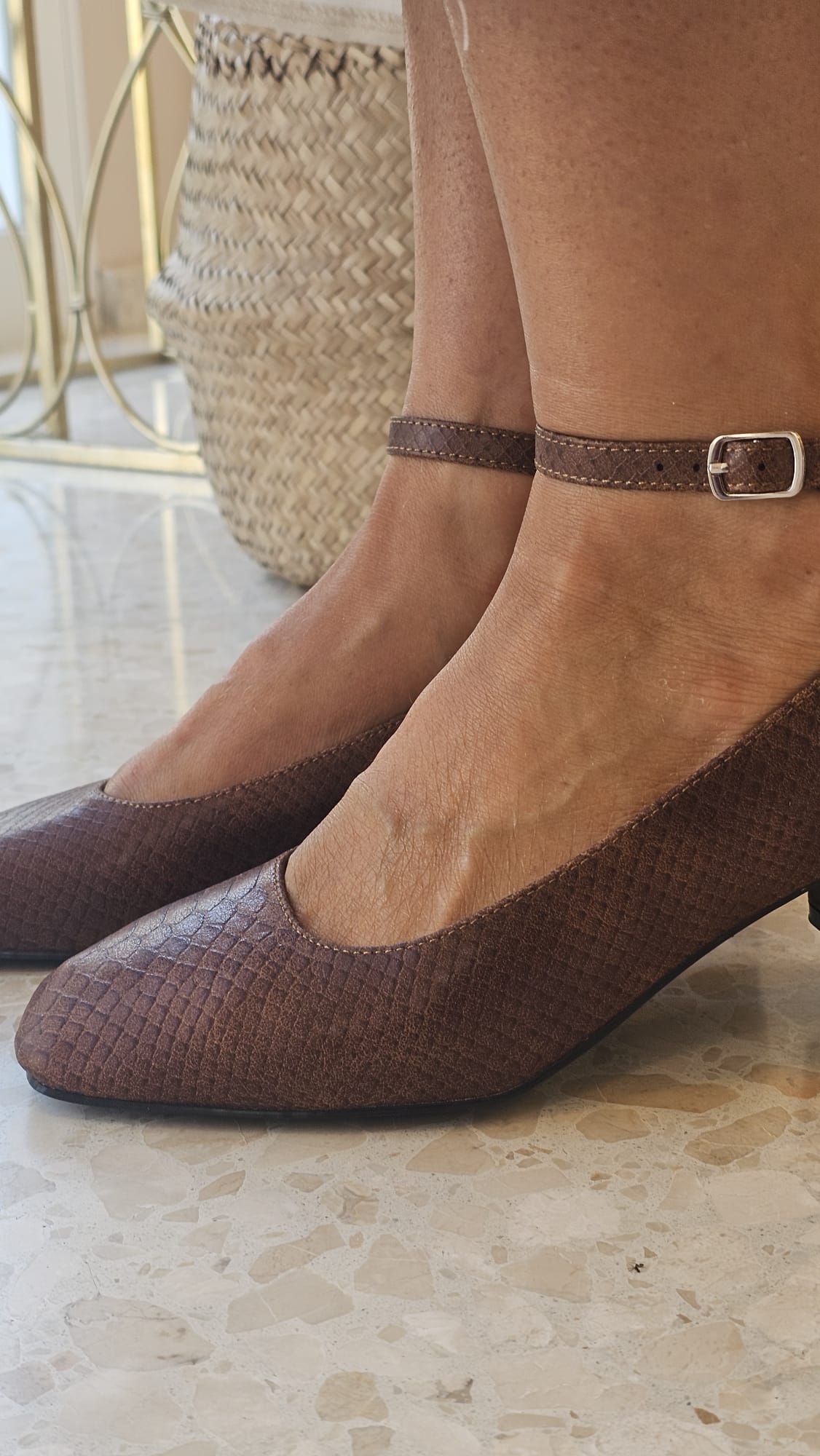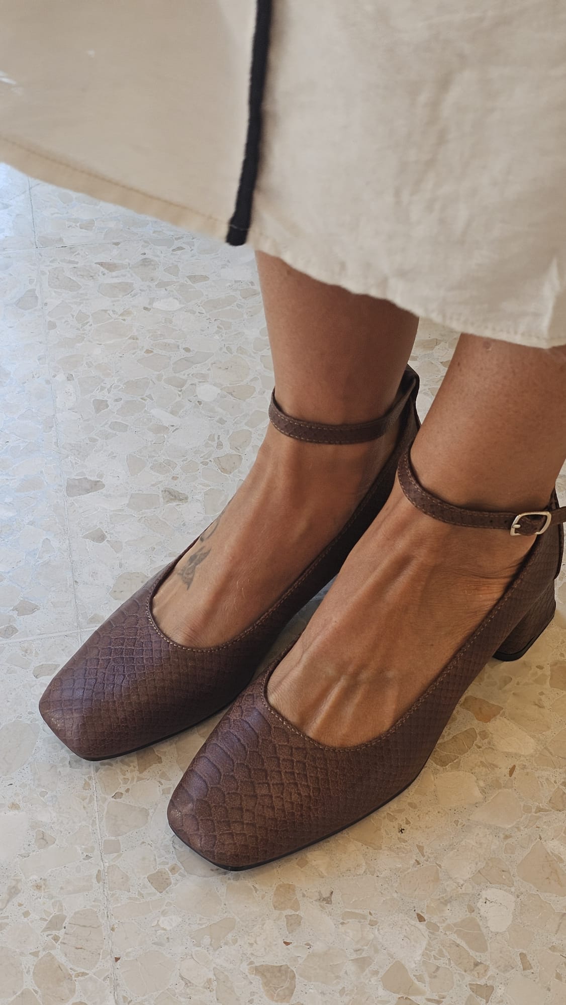 De punta cuadrangular y con un tacón cómodo de 4,5 cm, estilizan la silueta manteniendo una pisada estable y confortable. La hebilla fina que se ajusta al tobillo añade un detalle femenino y delicado, garantizando una sujeción perfecta y un aire refinado.