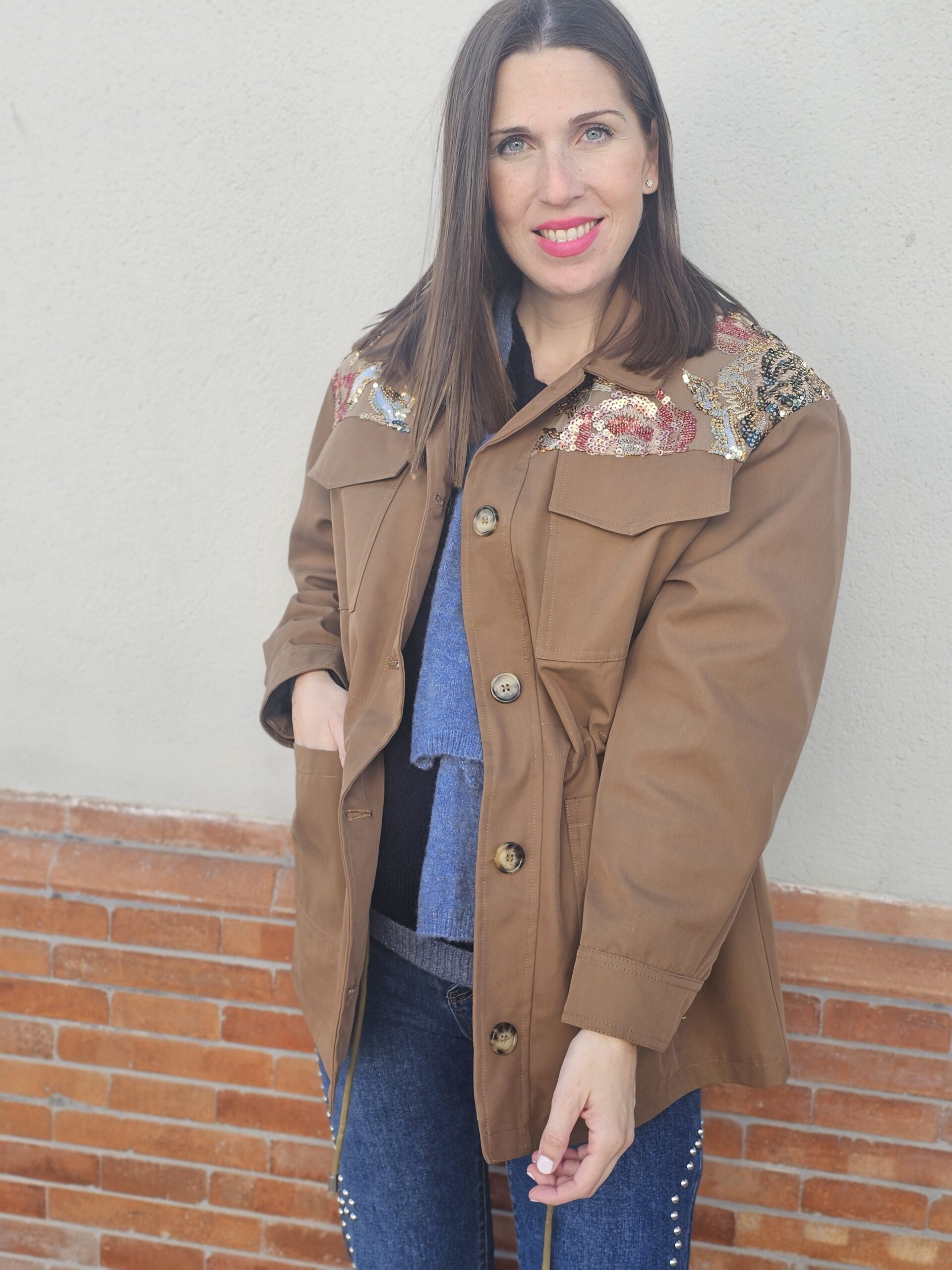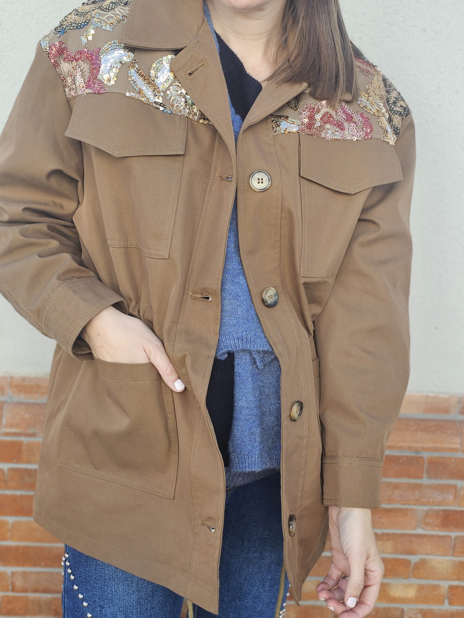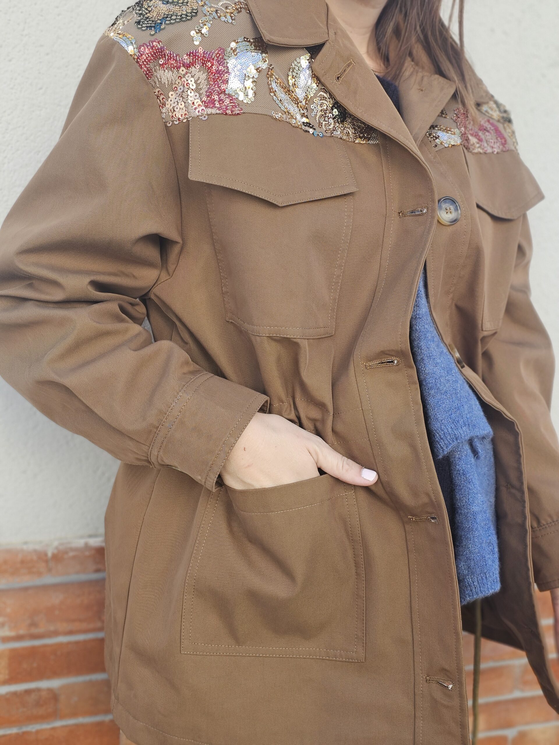 Chaqueta estilo militar en color beige, con un diseño muy especial en los hombros decorados con bordados florales en tonos azules, blancos y rosas que aportan un toque femenino y sofisticado.