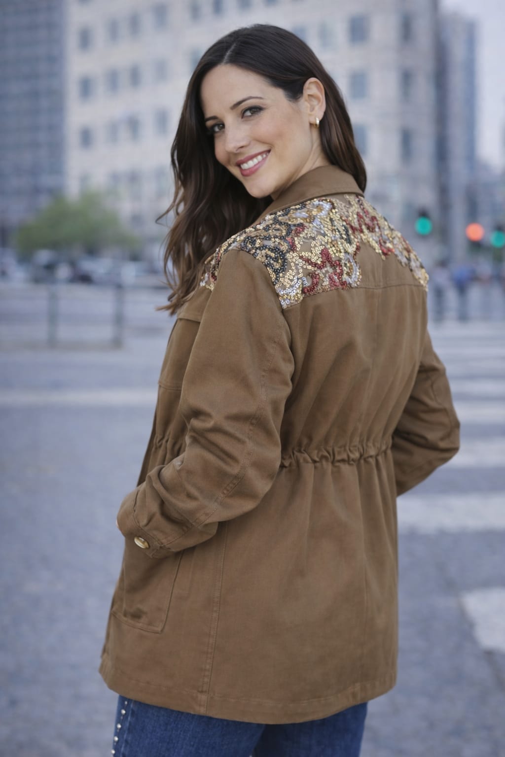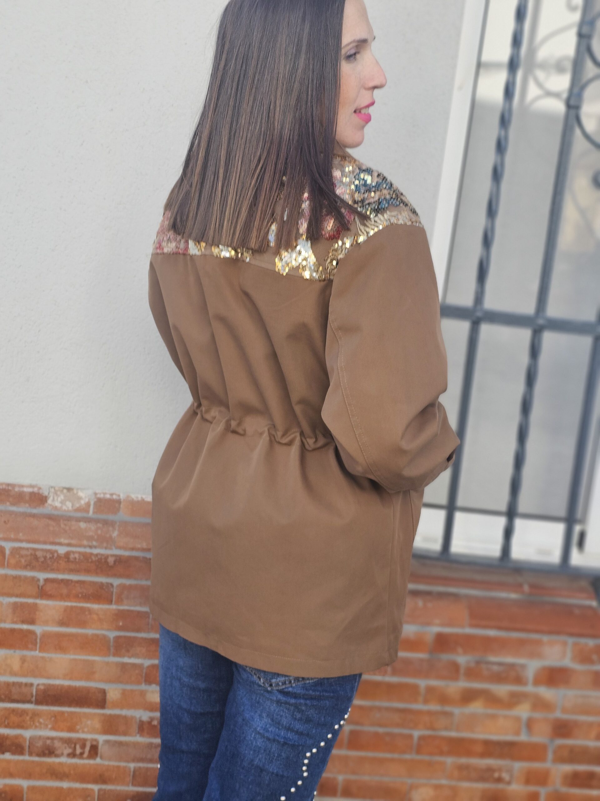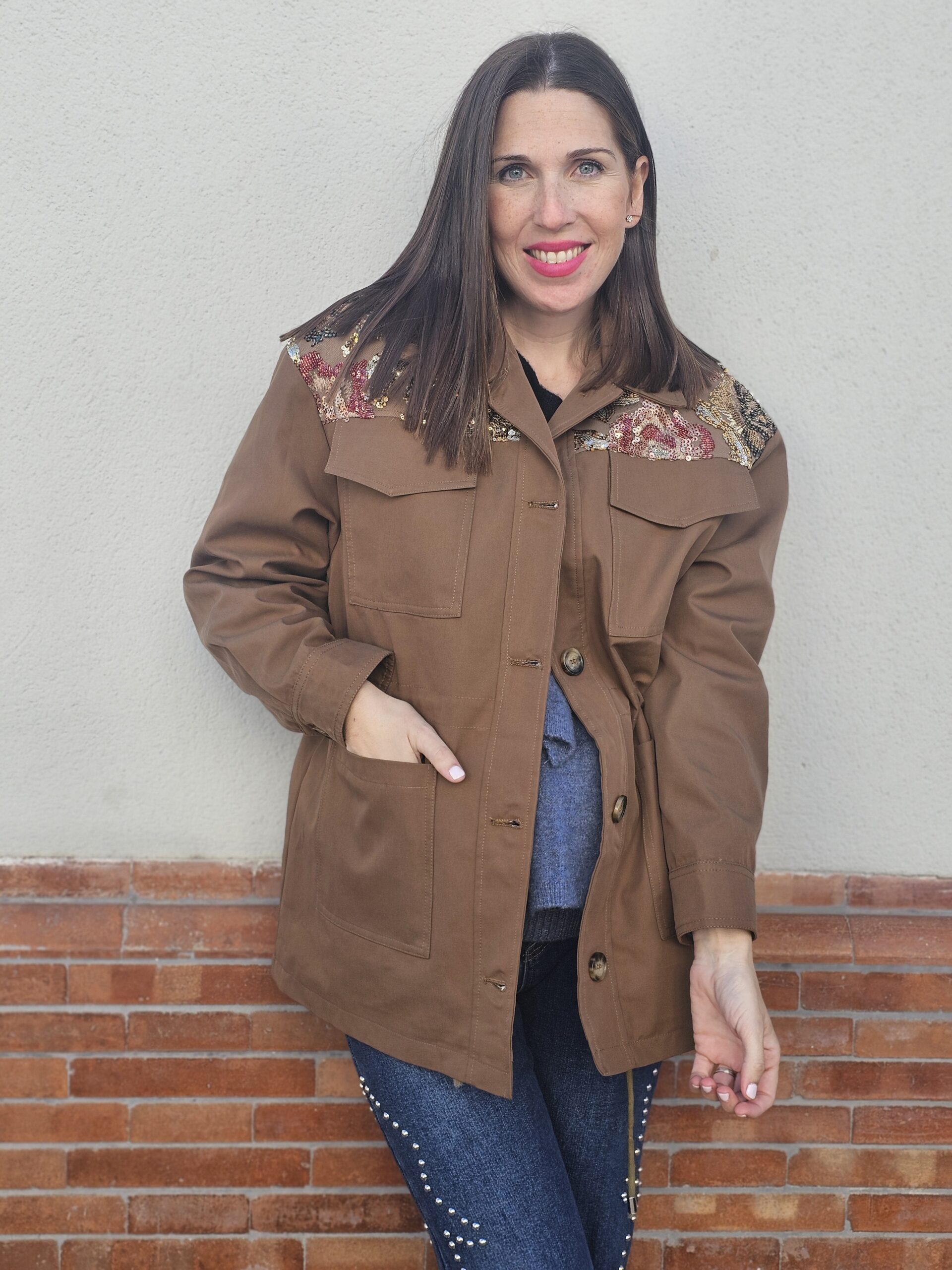 Chaqueta estilo militar en color beige, con un diseño muy especial en los hombros decorados con bordados florales en tonos azules, blancos y rosas que aportan un toque femenino y sofisticado.