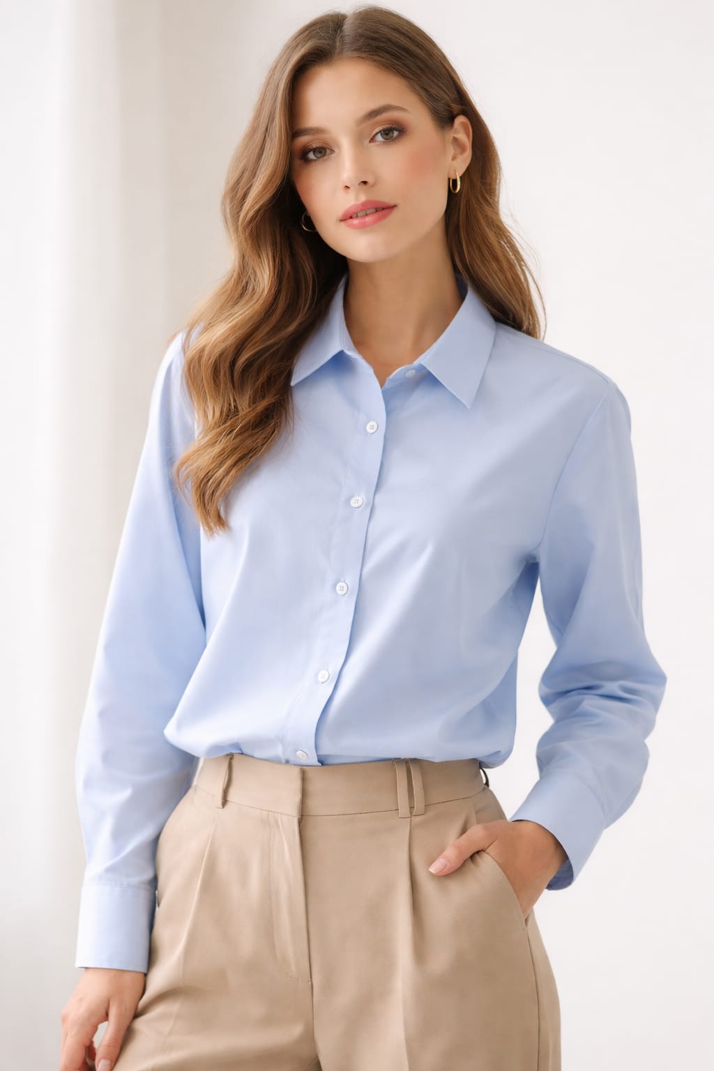 Camisa azul de estilo clásico y elegante, confeccionada en un tejido suave y ligero que aporta comodidad durante todo el día. Su diseño con cuello camisero y cierre de botones frontales la convierte en una prenda versátil y atemporal, perfecta para combinar tanto con looks formales como con conjuntos más relajados. Un básico imprescindible que nunca pasa de moda.