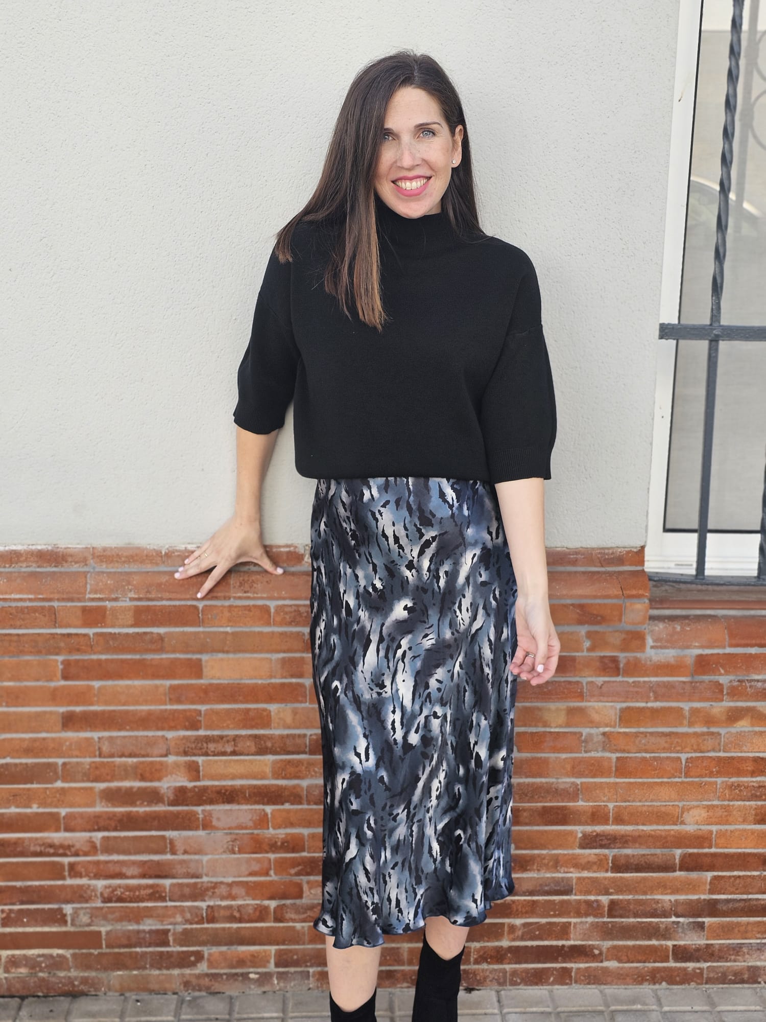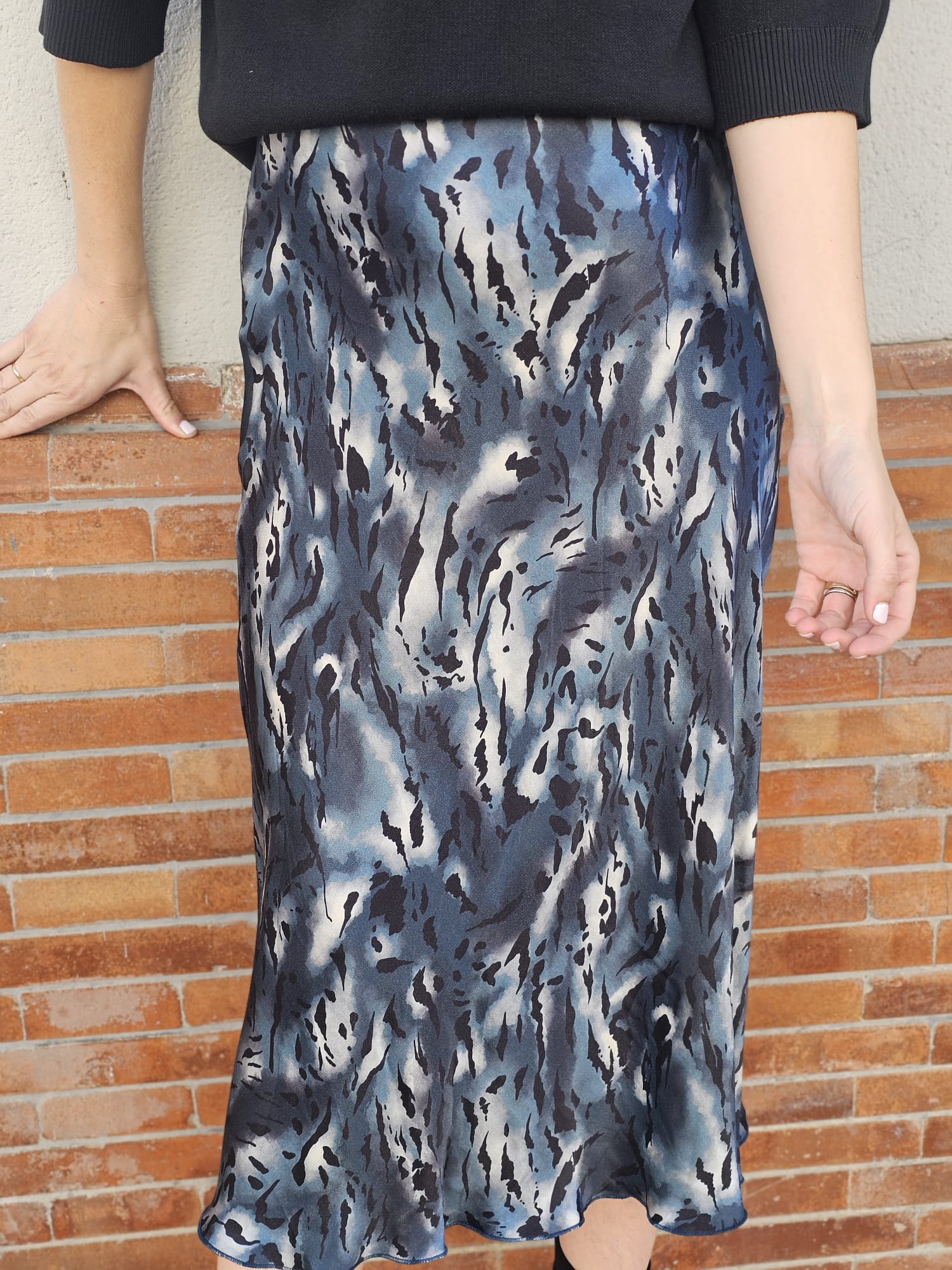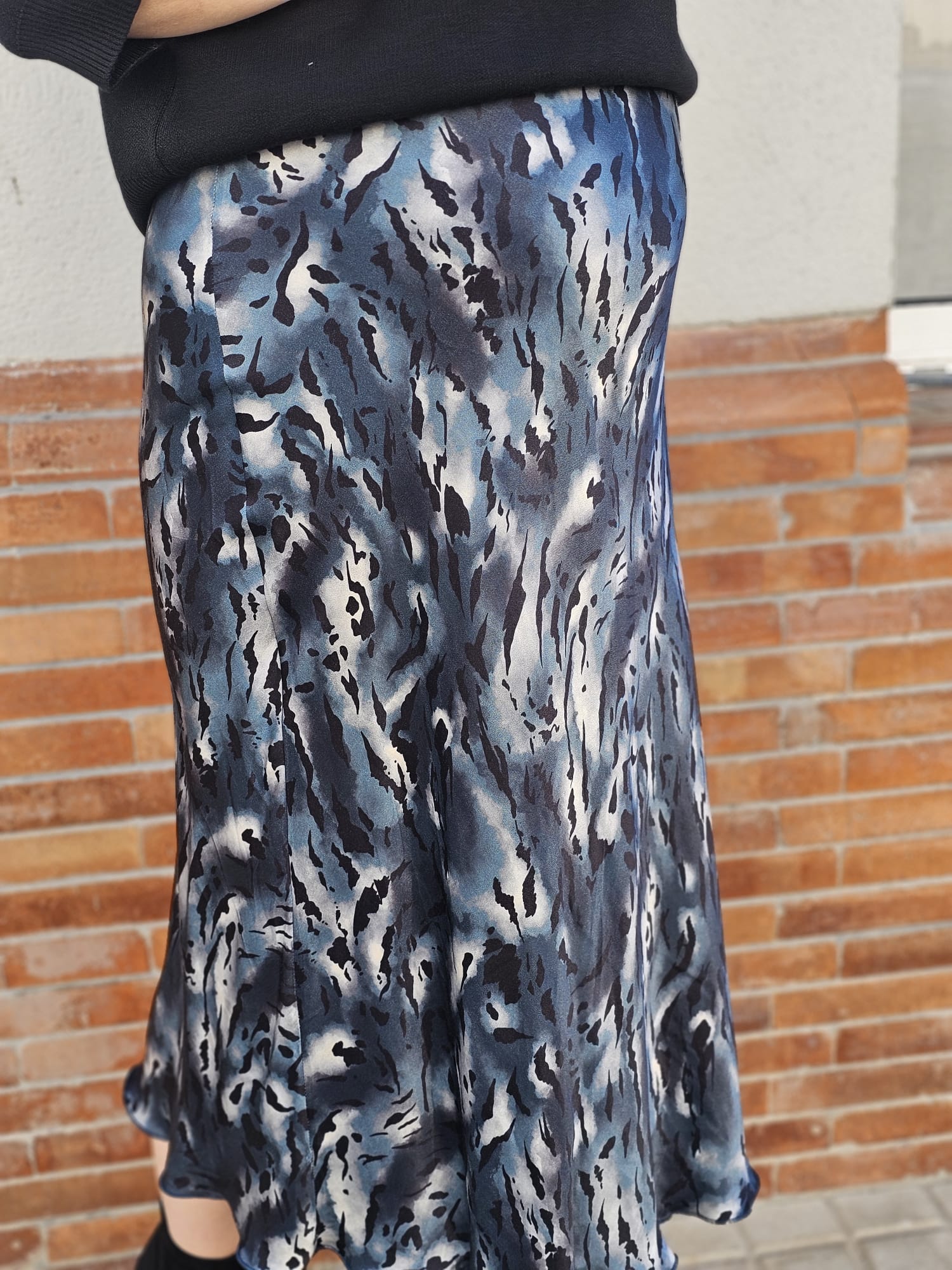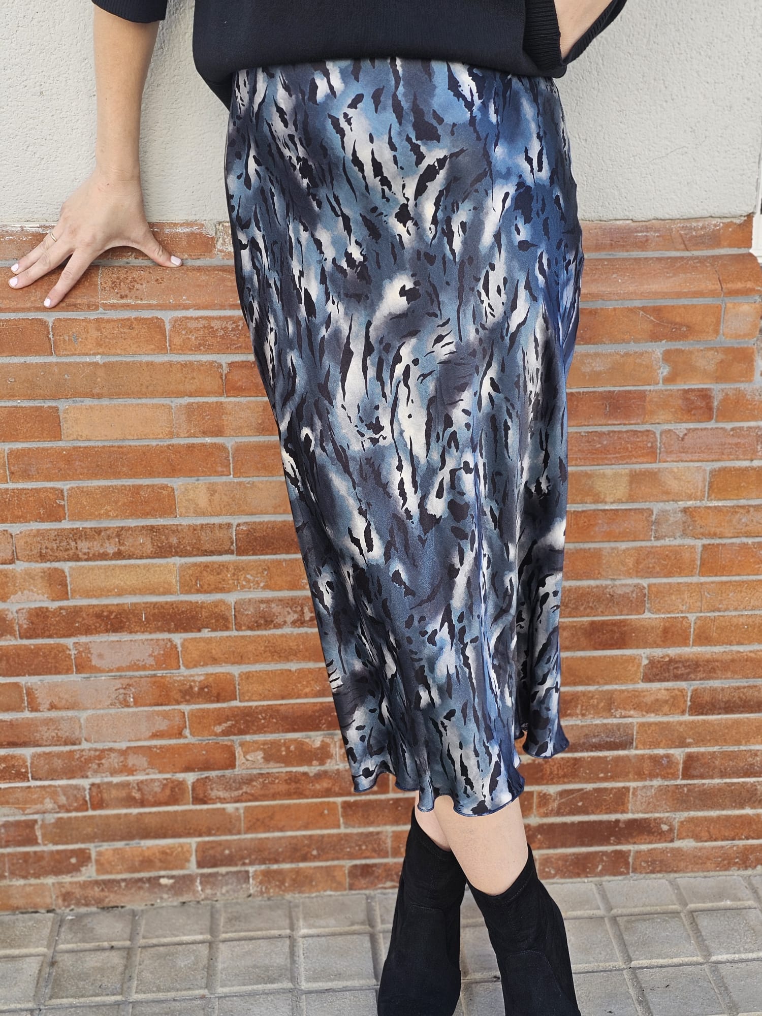 Falda midi satinada con estampado abstracto en tonos azul, gris y negro. Su tejido fluido aporta una caída elegante y favorecedora, perfecta para combinar tanto con botines como con deportivas. Una prenda versátil y sofisticada que añade un toque moderno a cualquier look.
