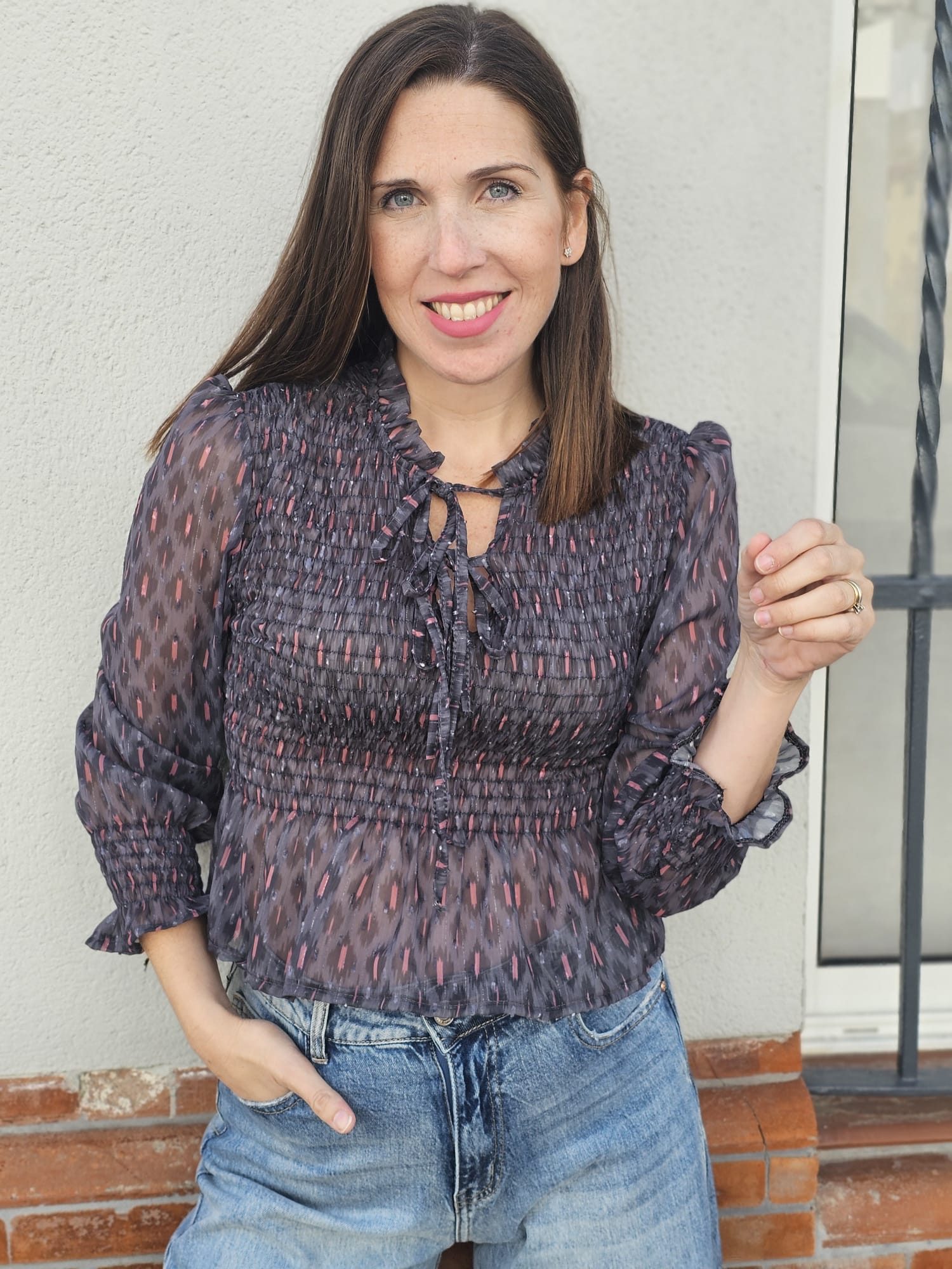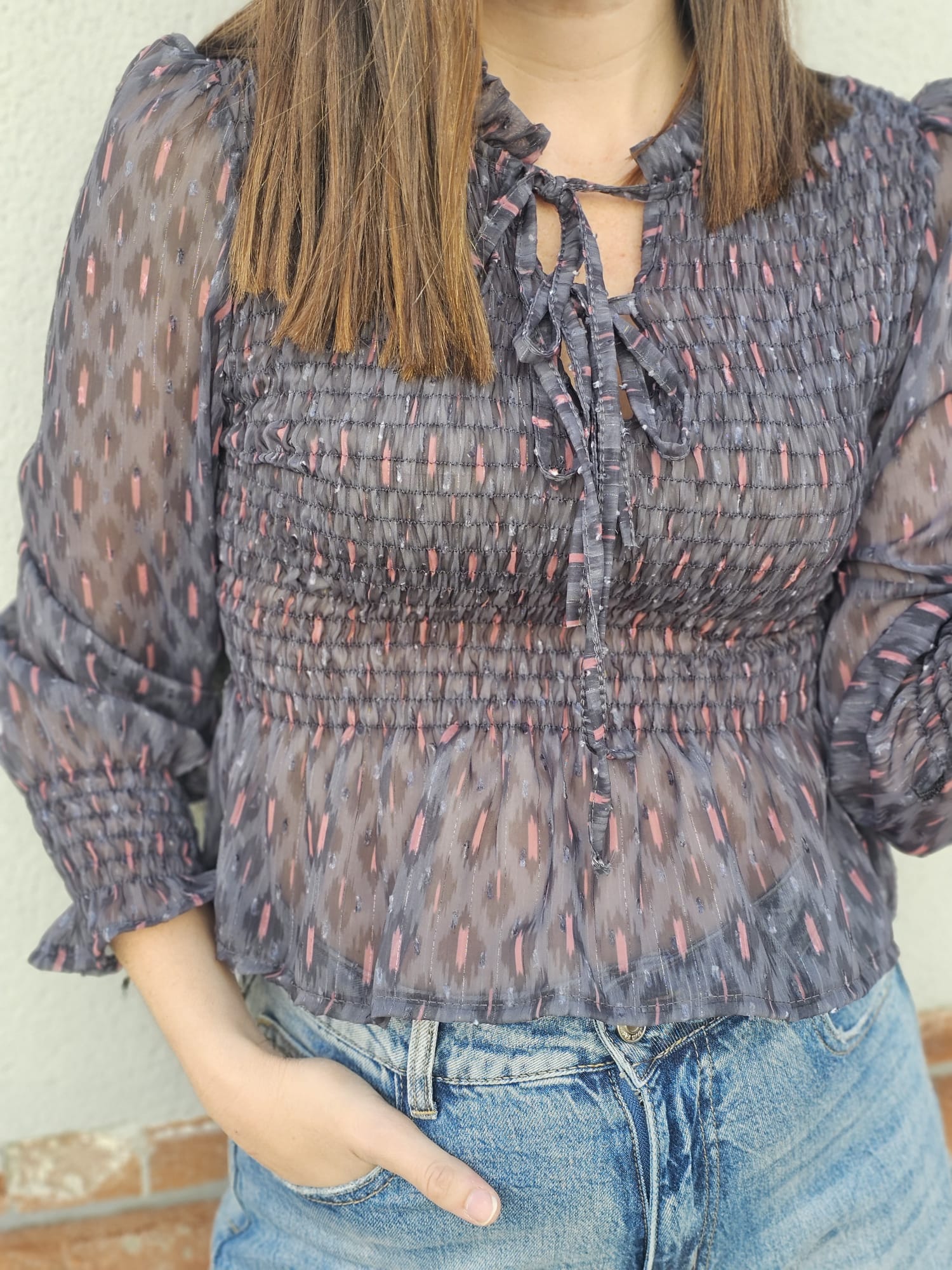 Blusa en tono gris con estampado de inspiración étnica en color rosa. Confeccionada en un tejido ligero y vaporoso, destaca por su diseño fruncido en el cuerpo y puños, que realza la silueta con comodidad y estilo. Su cuello redondo con pequeños volantes añade un toque femenino y sofisticado. Una prenda versátil y elegante, perfecta para combinar tanto con vaqueros como con faldas o pantalones de vestir.