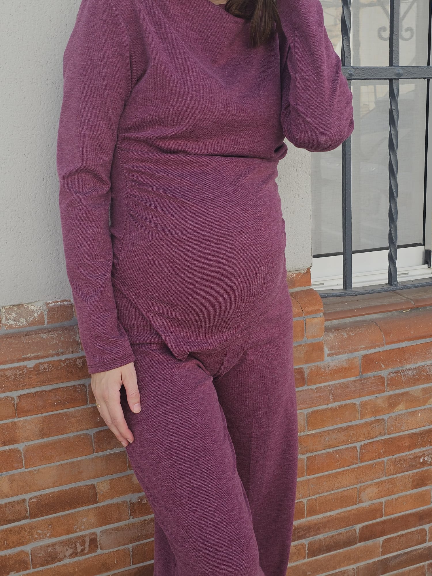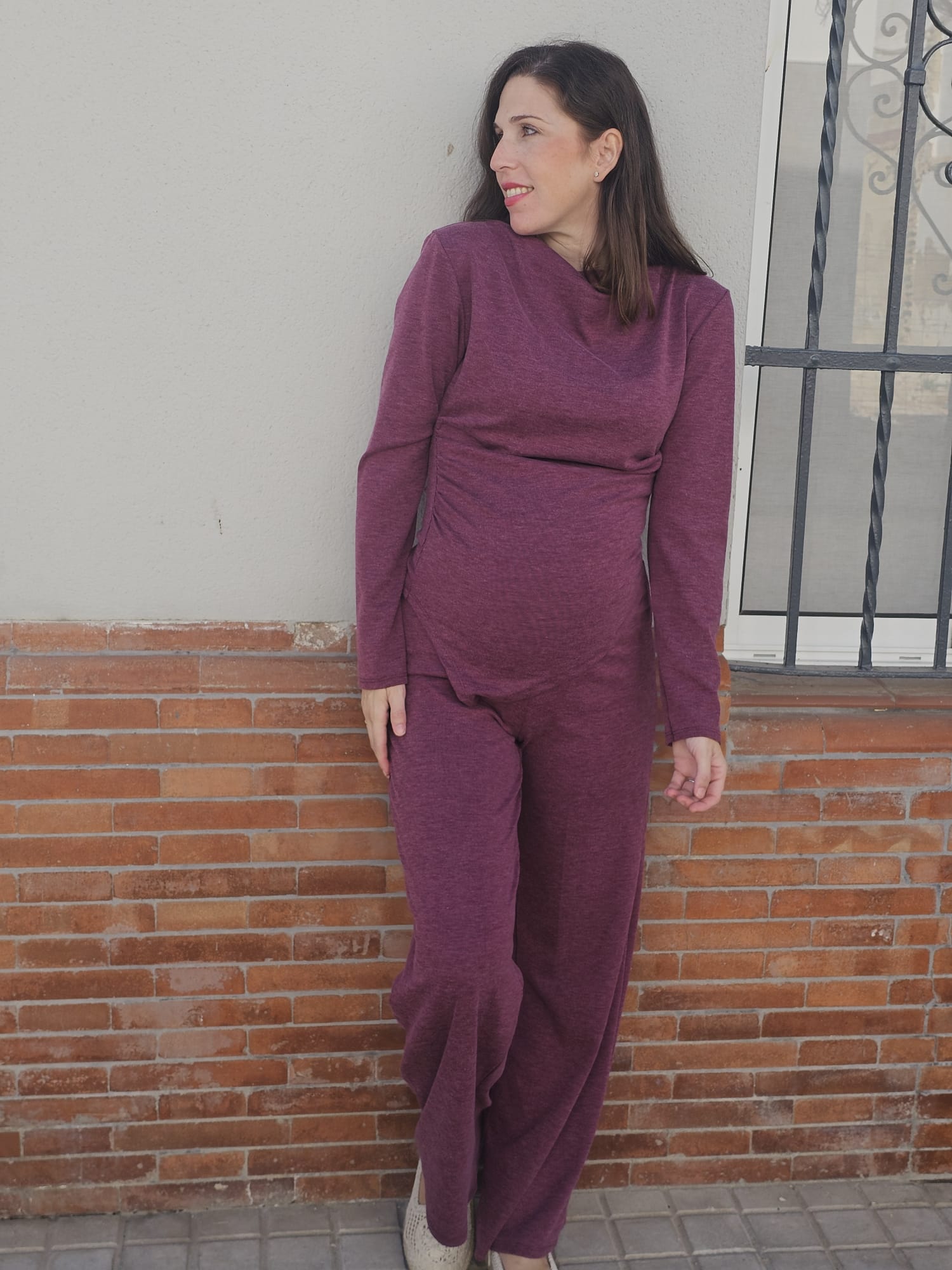 Conjunto de top y pantalón en color burdeos, confeccionado en una mezcla de poliéster, viscosa y elastán que aporta suavidad, comodidad y una caída impecable. El top de manga larga se adapta con elegancia al cuerpo, mientras que el pantalón ofrece un ajuste favorecedor y versátil. Un conjunto sofisticado, cómodo y práctico, ideal para el día a día o para crear un look pulido con el mínimo esfuerzo.