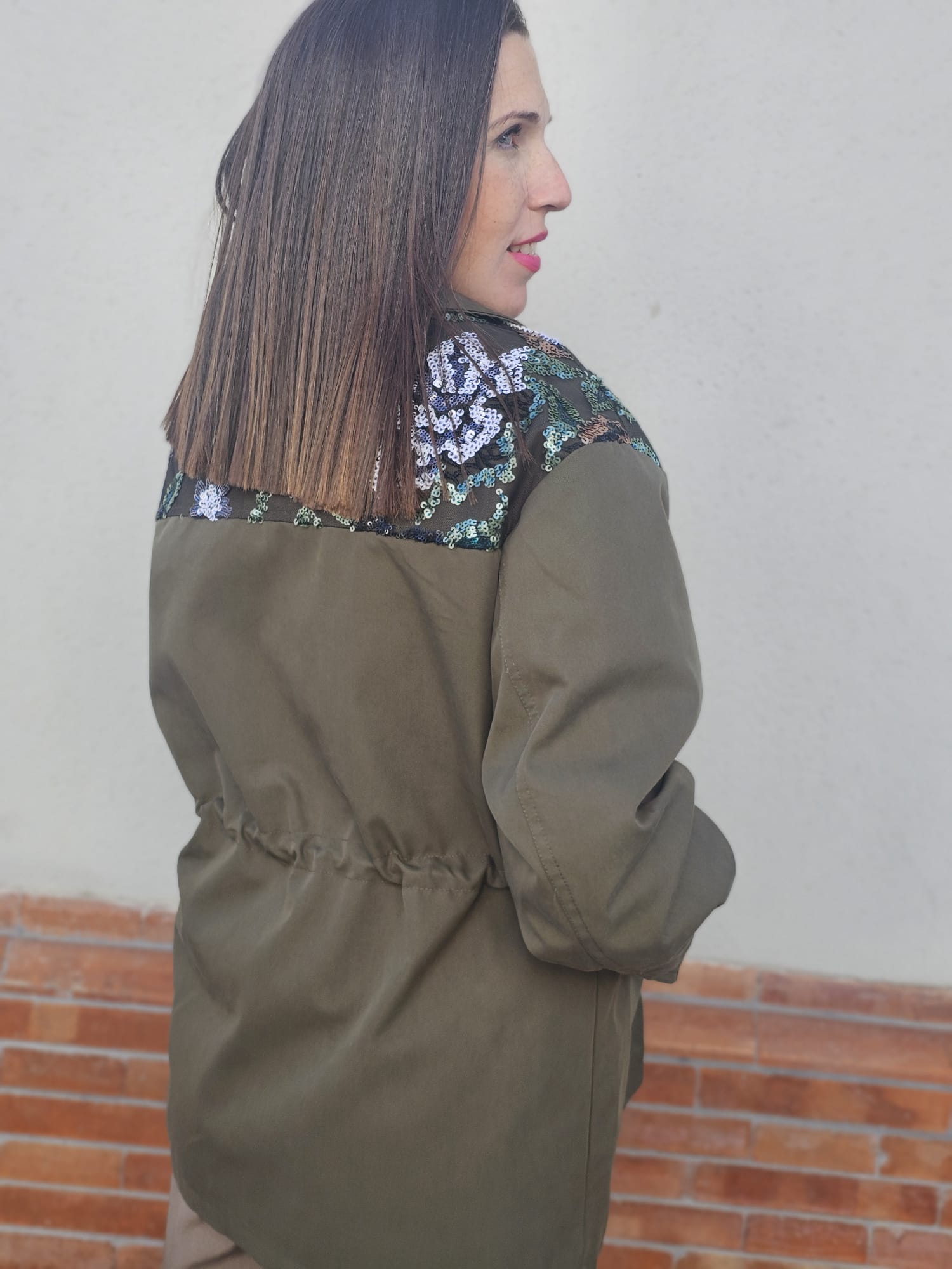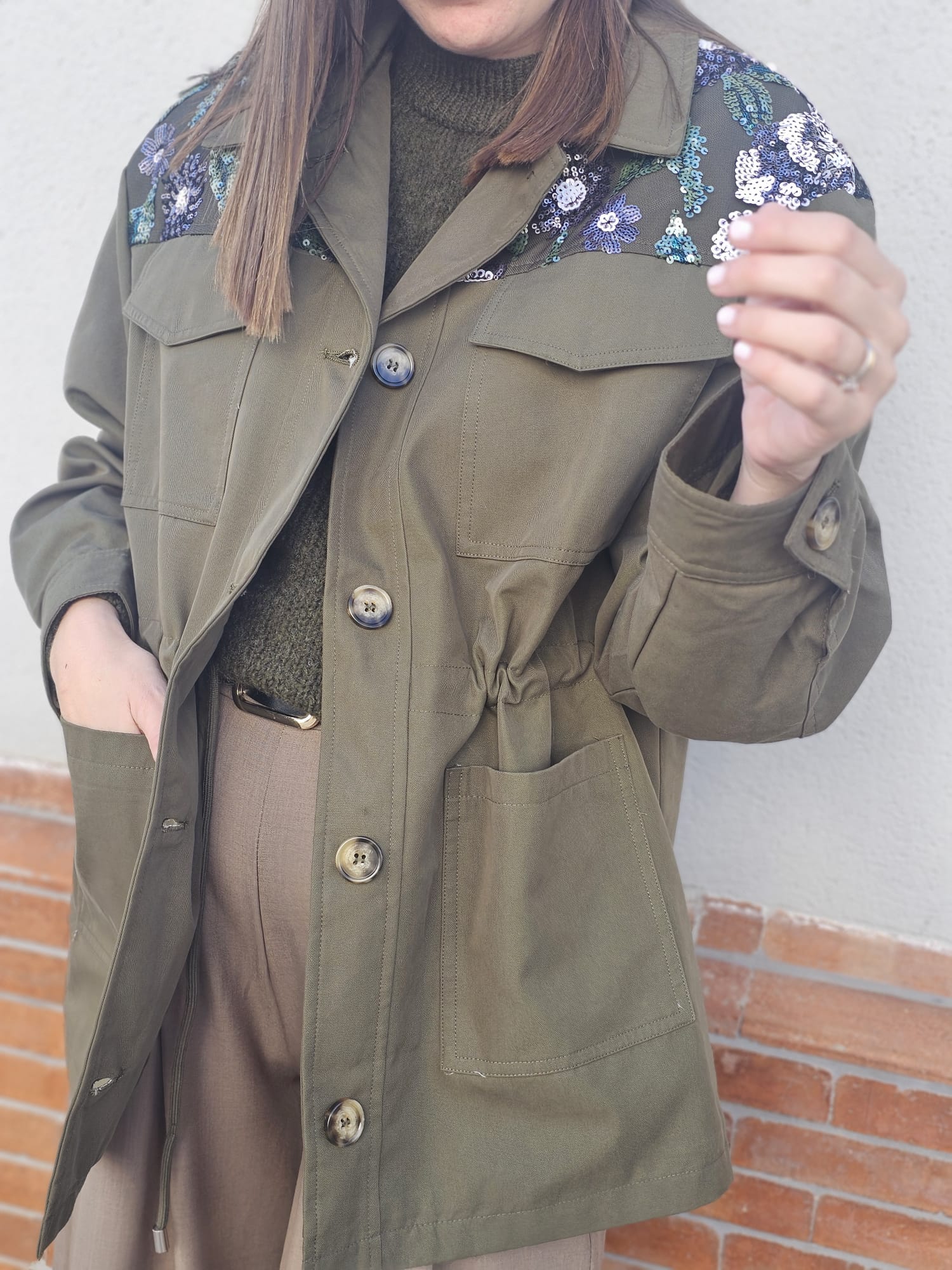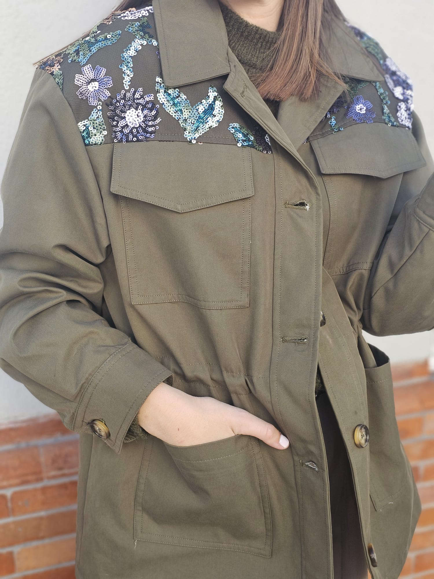 Chaqueta estilo militar en color verde caqui, con un diseño muy especial en los hombros decorados con bordados florales en tonos azules, blancos y verdes que aportan un toque femenino y sofisticado.
