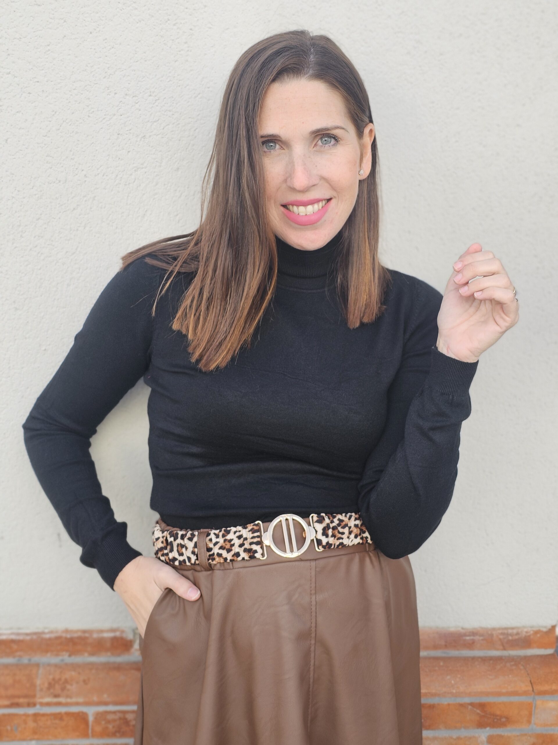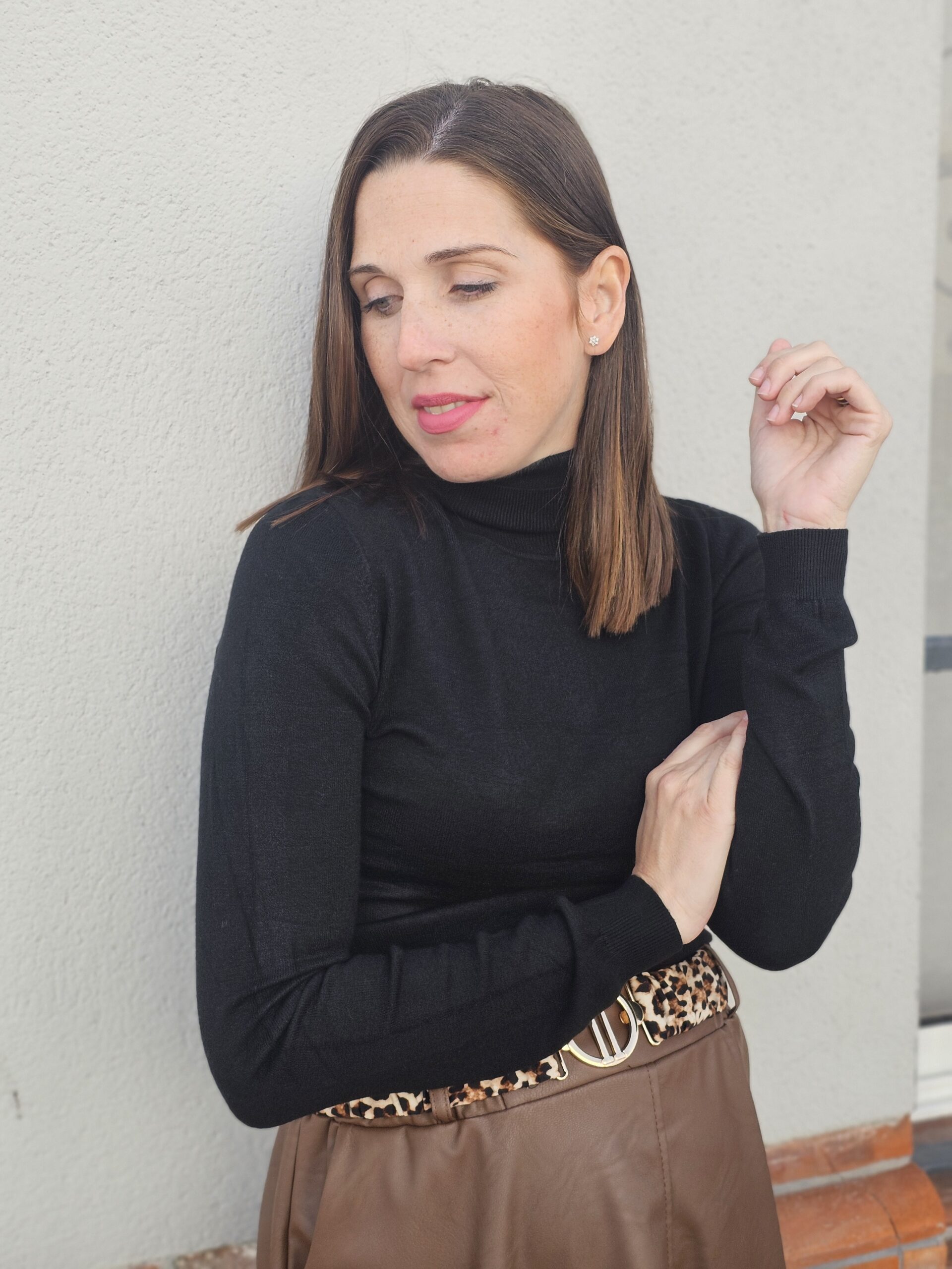 Jersey ajustado en color negro, de tejido suave y elástico que se adapta perfectamente al cuerpo realzando la silueta. Presenta cuello vuelto, ideal para los días más fríos, aportando calidez y un aire elegante. Una prenda básica y versátil, perfecta para combinar con faldas, pantalones o chalecos y crear looks cómodos y sofisticados.