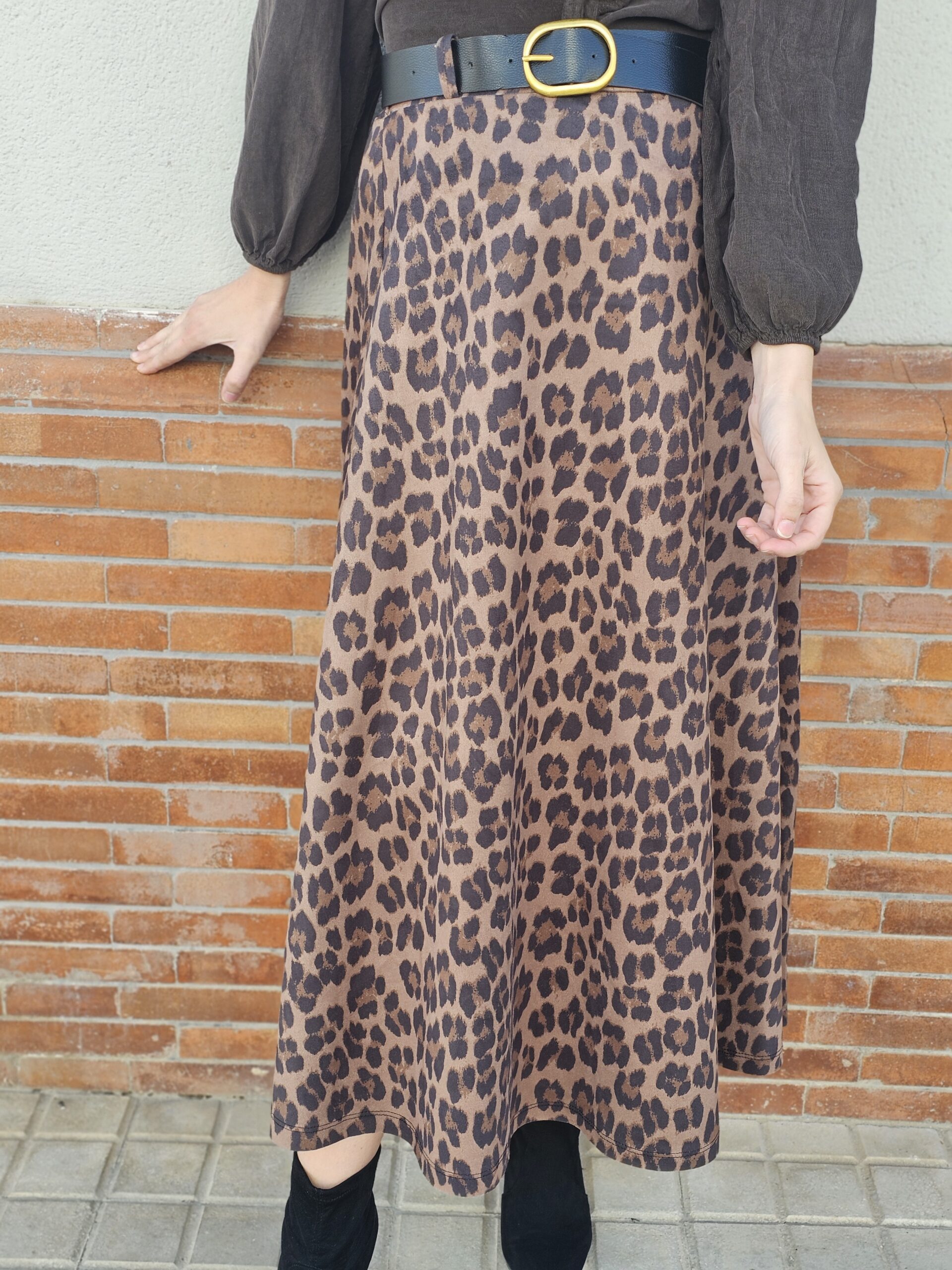 Falda larga con estampado de leopardo, de tejido ligero y con un bonito movimiento al andar. Lleva cinturón negro que se ajusta a la cintura y aporta un toque de contraste y estilo. Una prenda versátil y favorecedora, ideal para combinar con camisas, blusas o jerséis, perfecta para looks tanto casuales como más sofisticados.