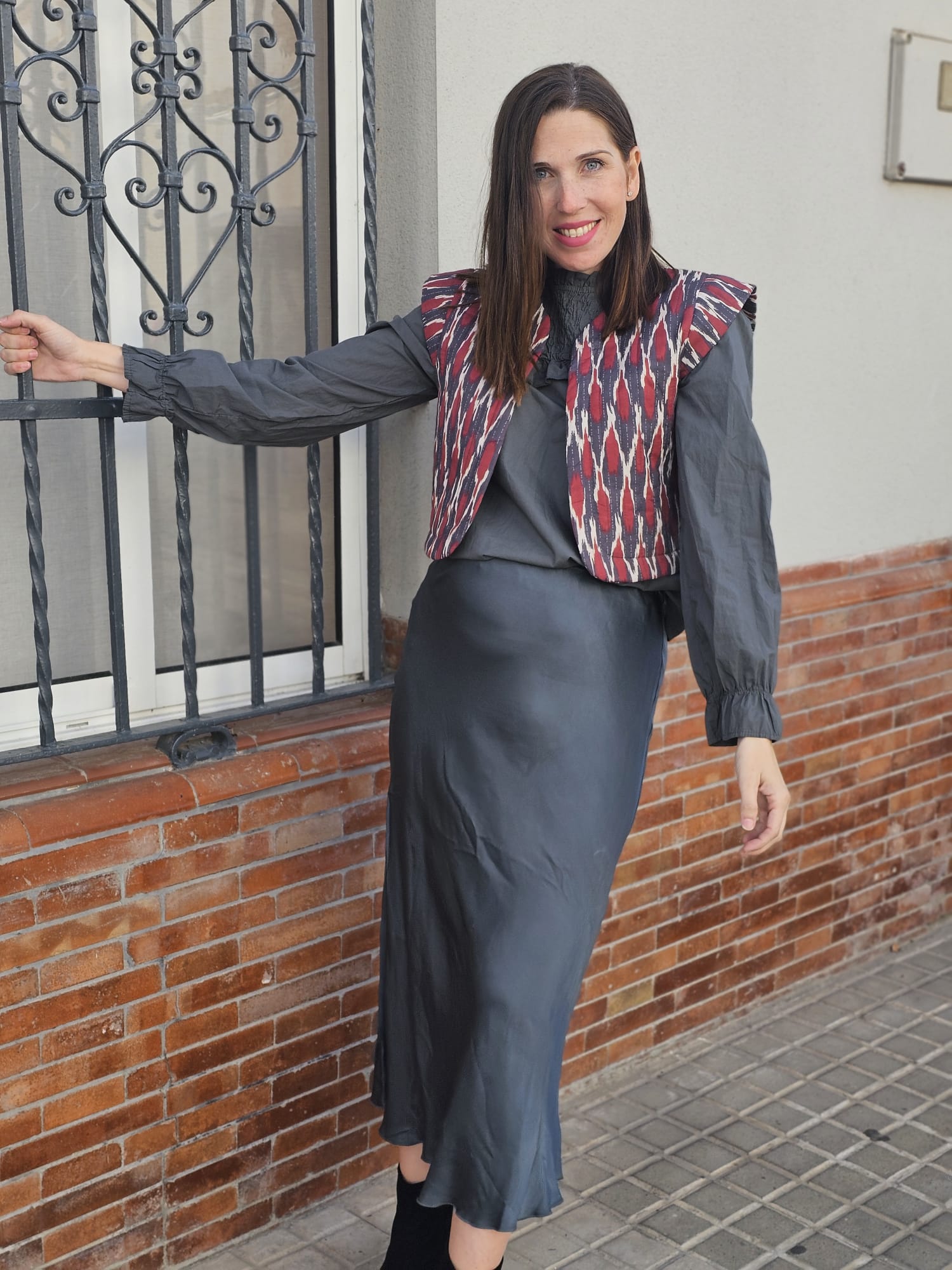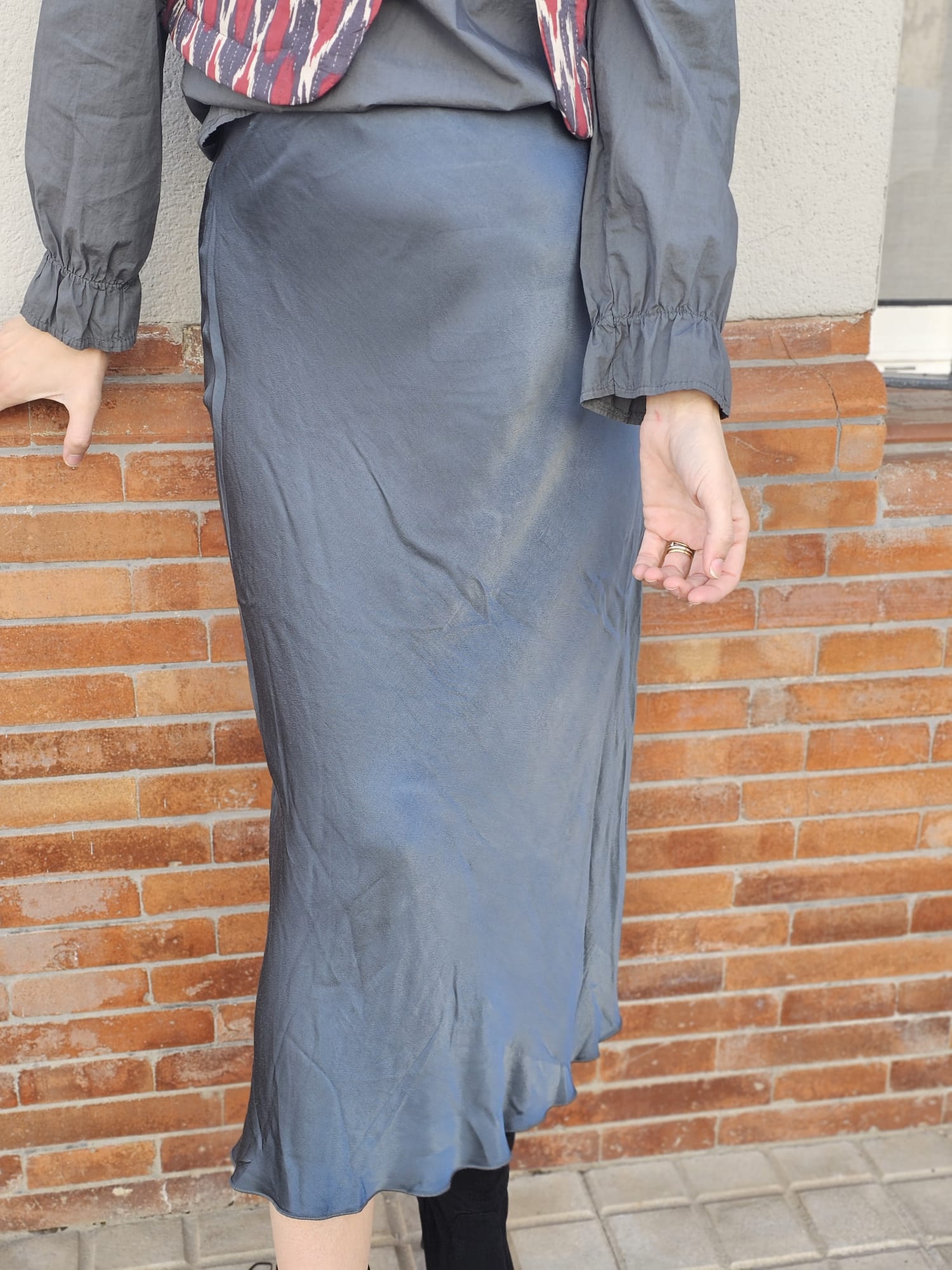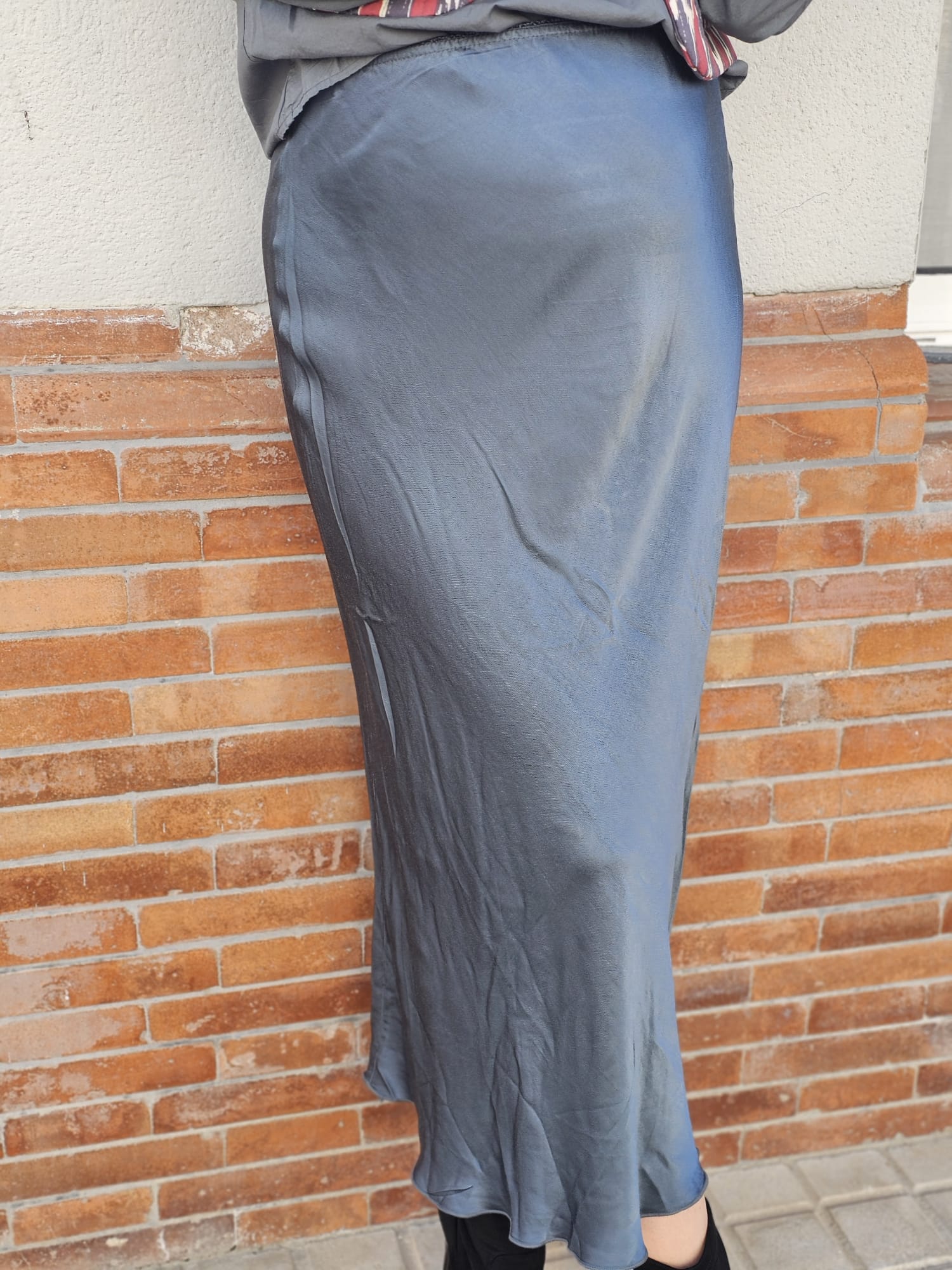Falda midi de satén en tono azul, con caída elegante y acabado suave. Perfecta para looks sofisticados y femeninos, ideal para ocasiones especiales o para darle un toque chic a tu día a día.