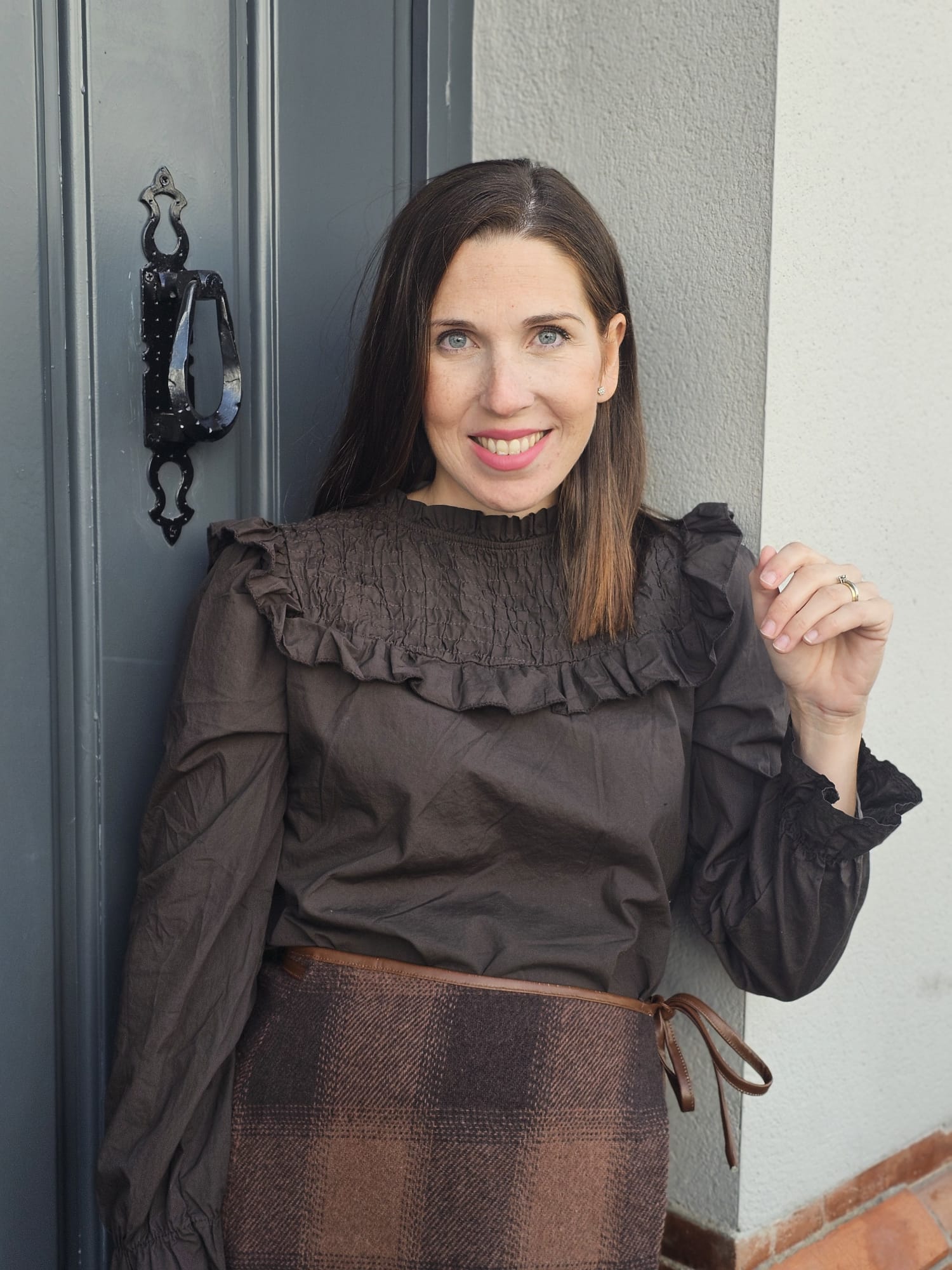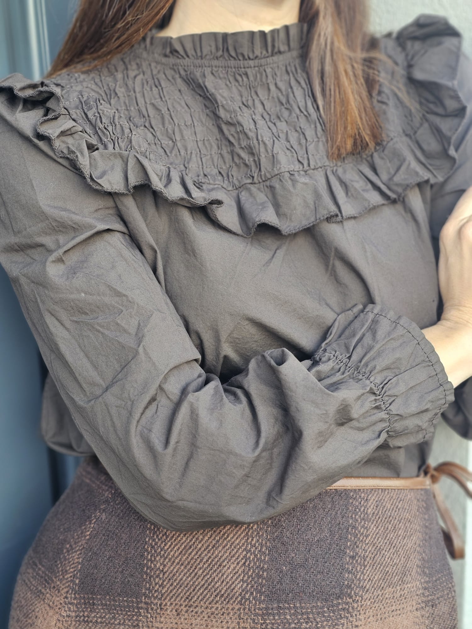 Blusa en tono marrón con volante en el pecho y cuello alto fruncido. Un diseño elegante y femenino, ideal para el día a día o para ocasiones especiales.