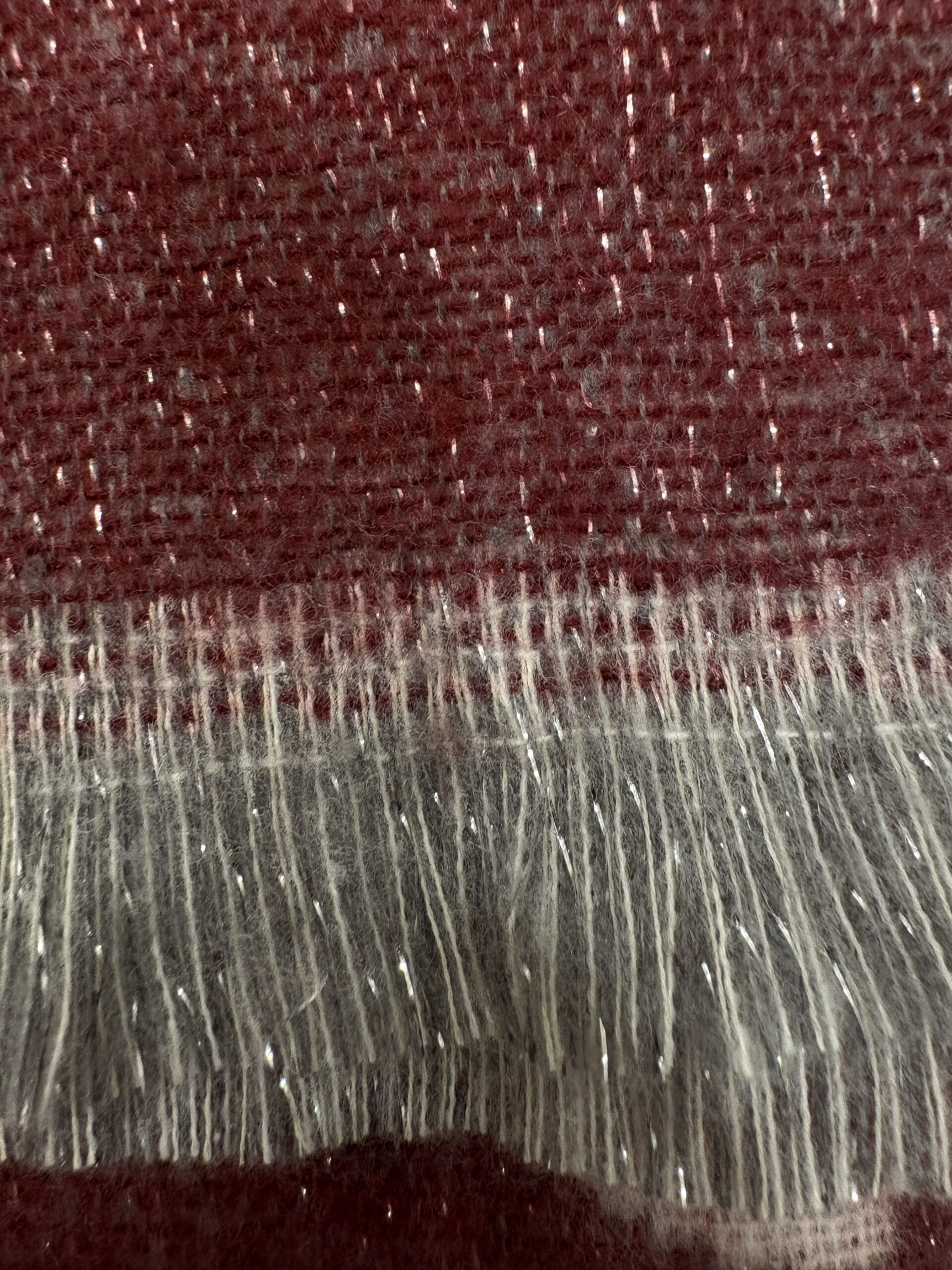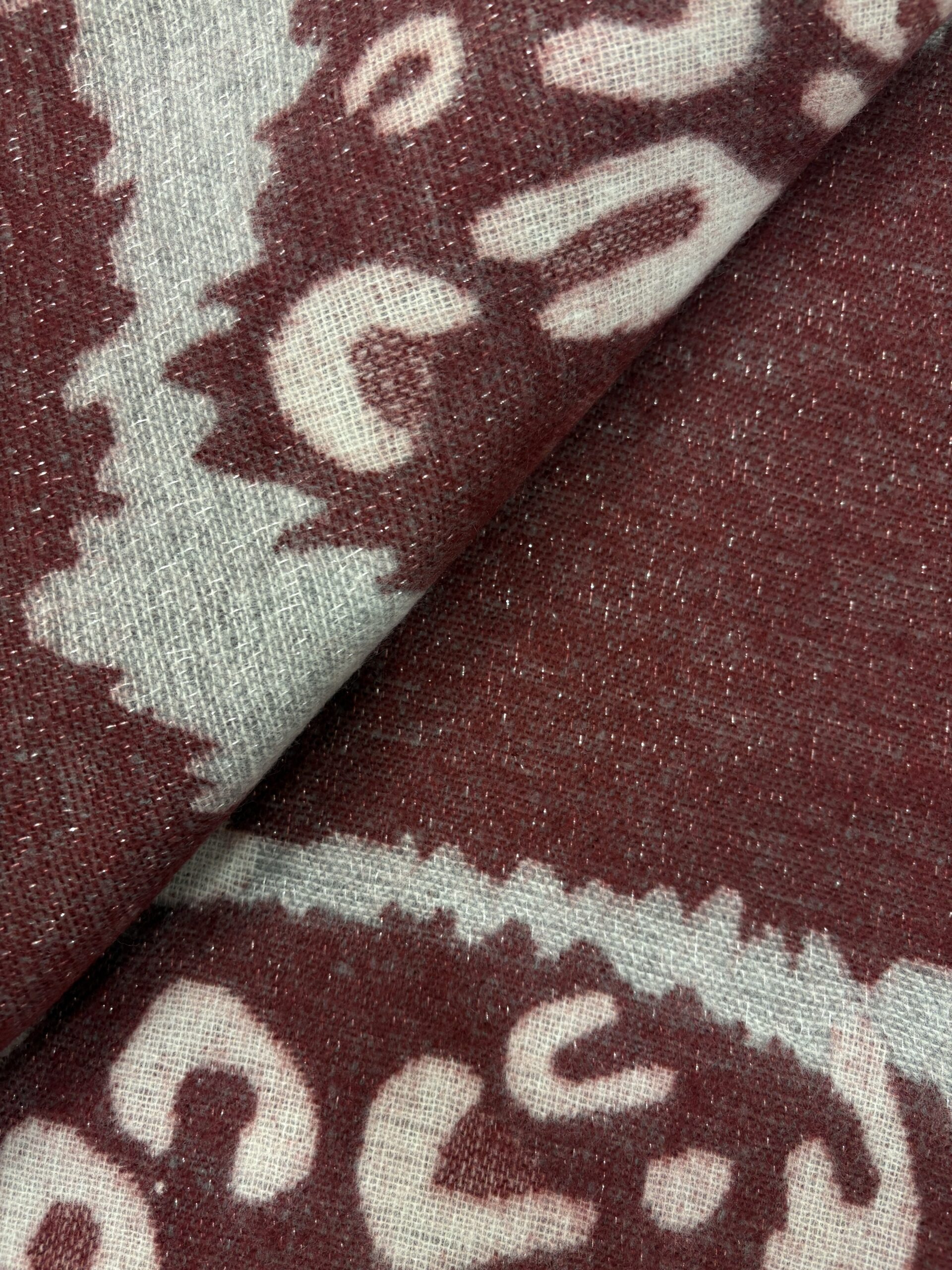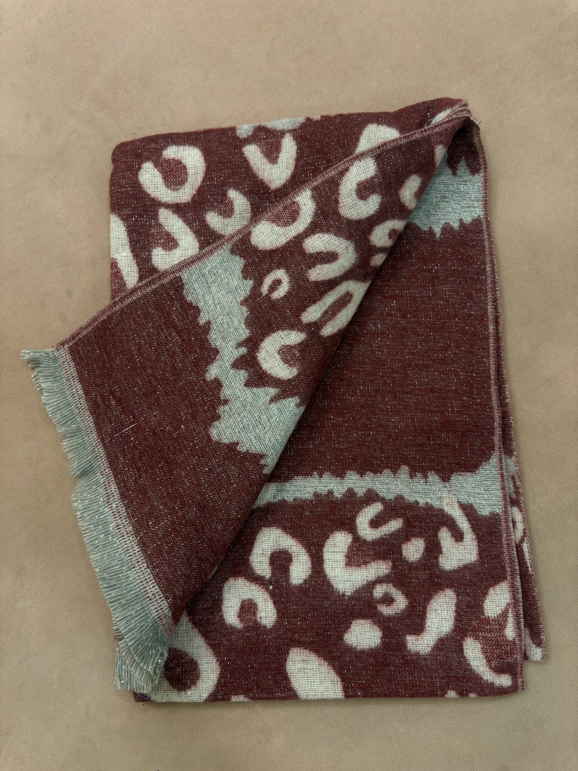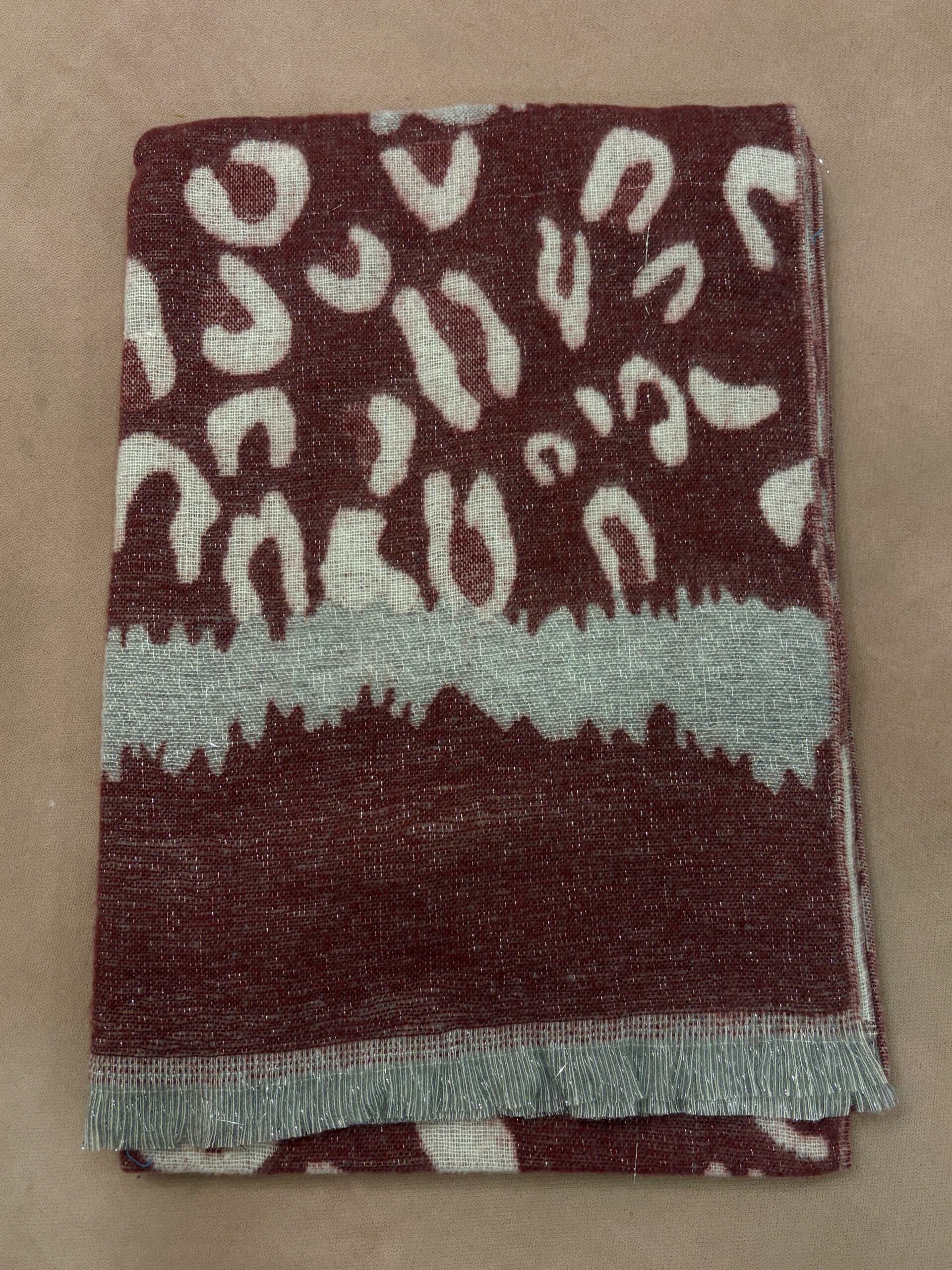 Bufanda burdeos con estampado de leopardo, elegante y con un toque de brillo gracias a los sutiles hilos plateados que la recorren. Su diseño combina sofisticación y estilo, aportando luz y personalidad a cualquier look. Rematada con delicados flecos en los extremos, es el accesorio perfecto para dar un aire chic y moderno a tus outfits de invierno.