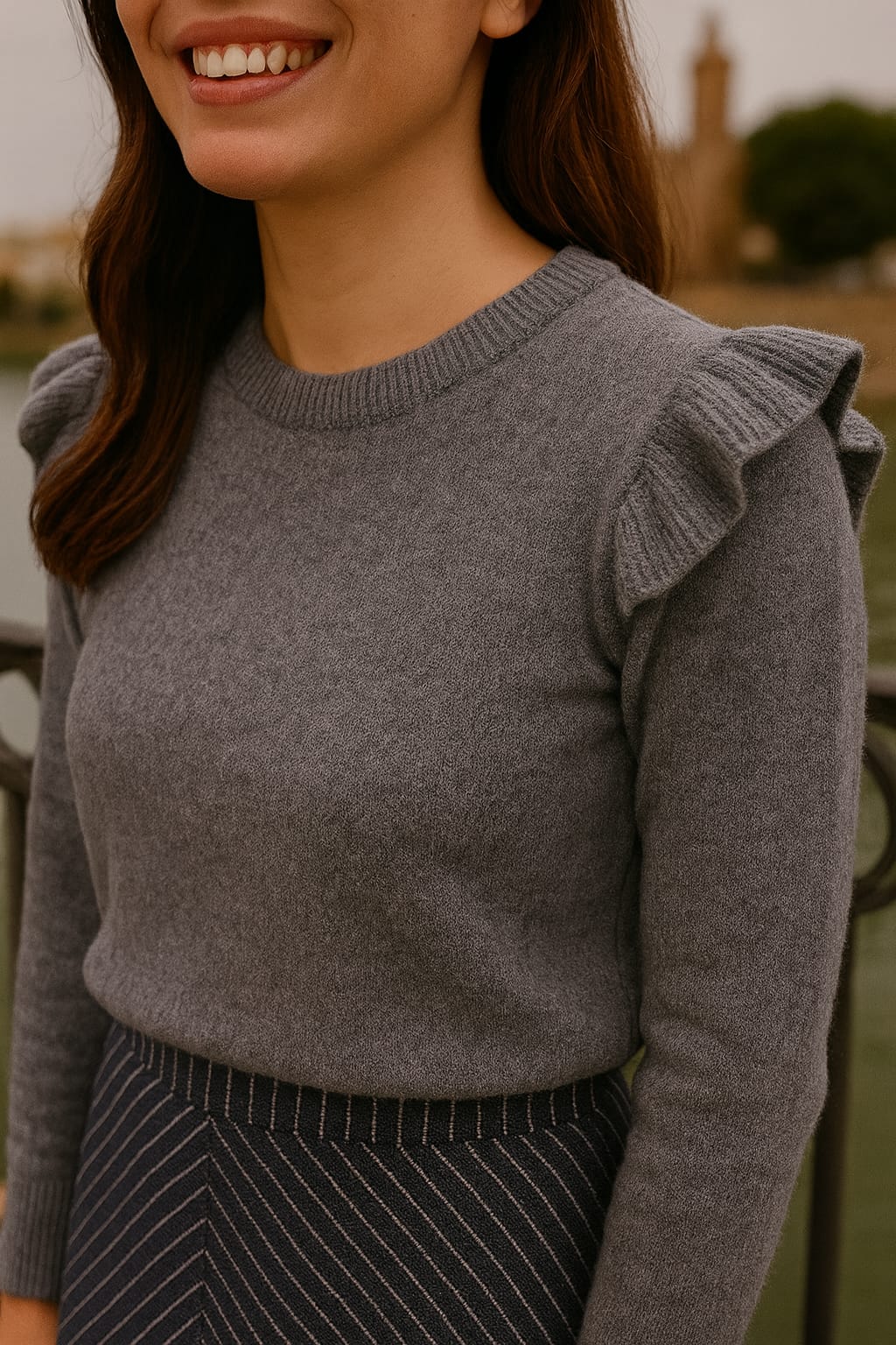 Jersey gris de manga larga con delicados volantes en cada hombro, aportando un toque femenino y sofisticado. Suave, cómodo y perfecto para elevar cualquier look diario.
