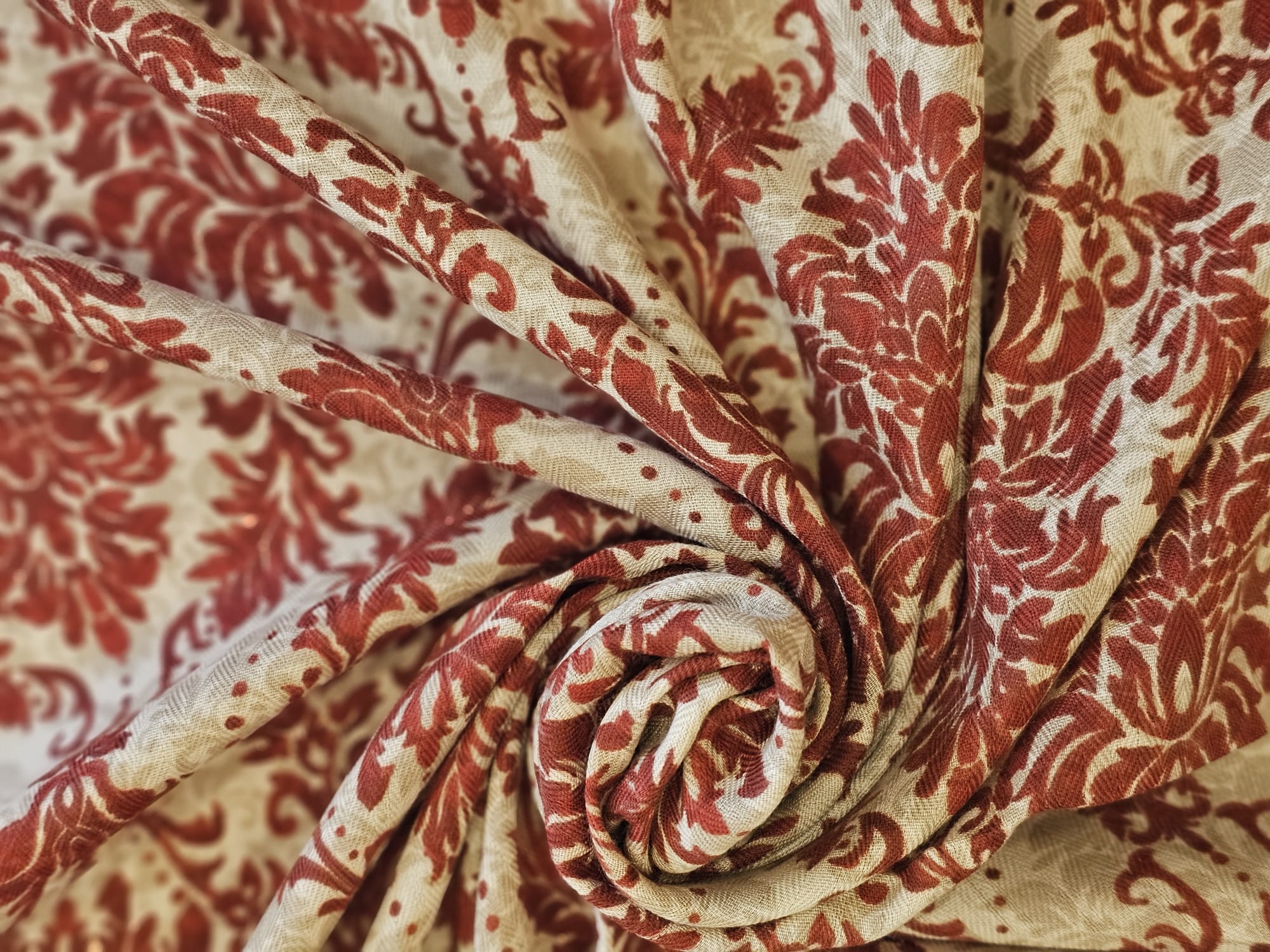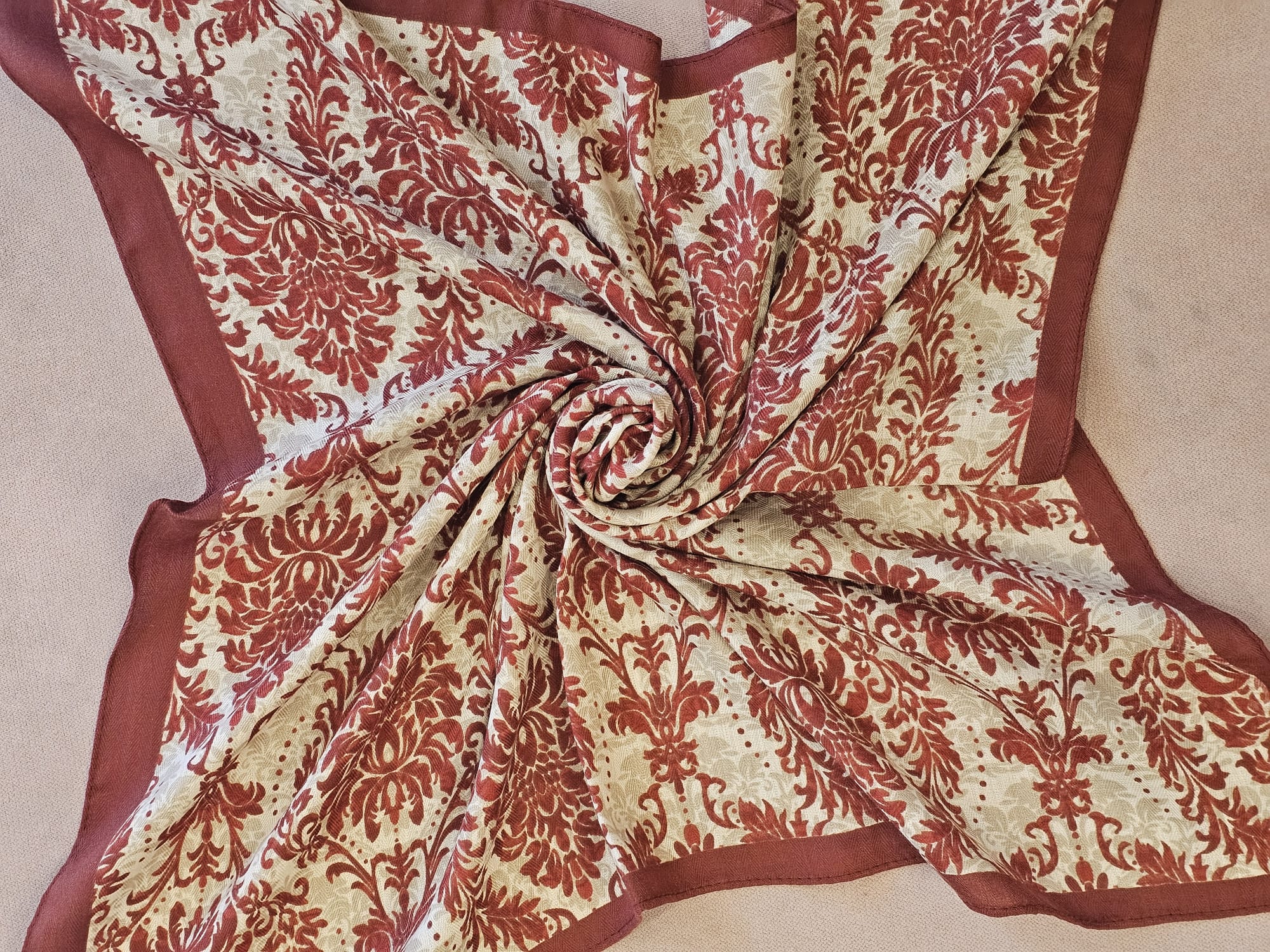 Bufanda ligera con estampado rococó en tonos beige y burdeos, rematada con un borde burdeos. Perfecta para dar un toque original y elegante a tus looks diarios.