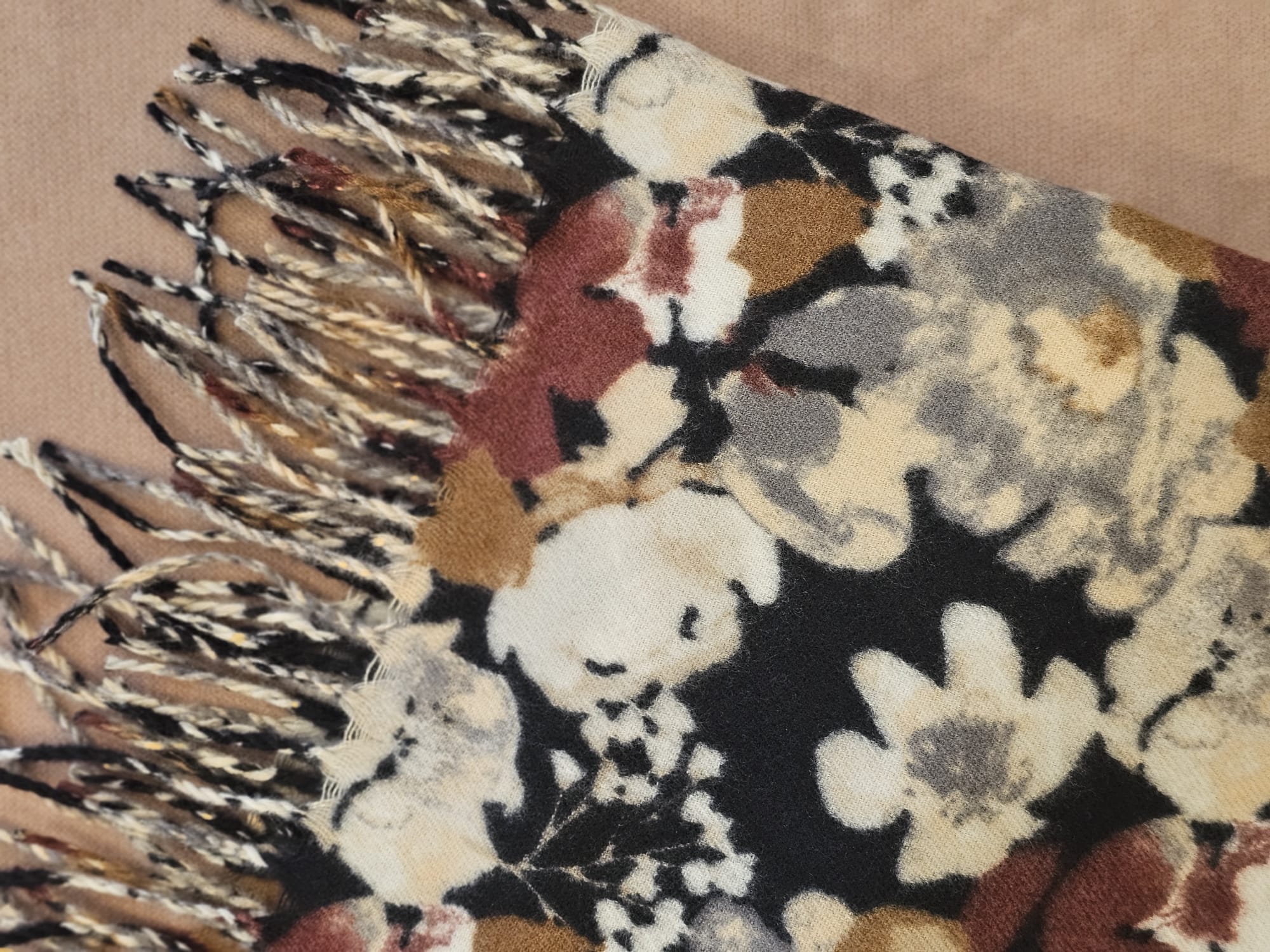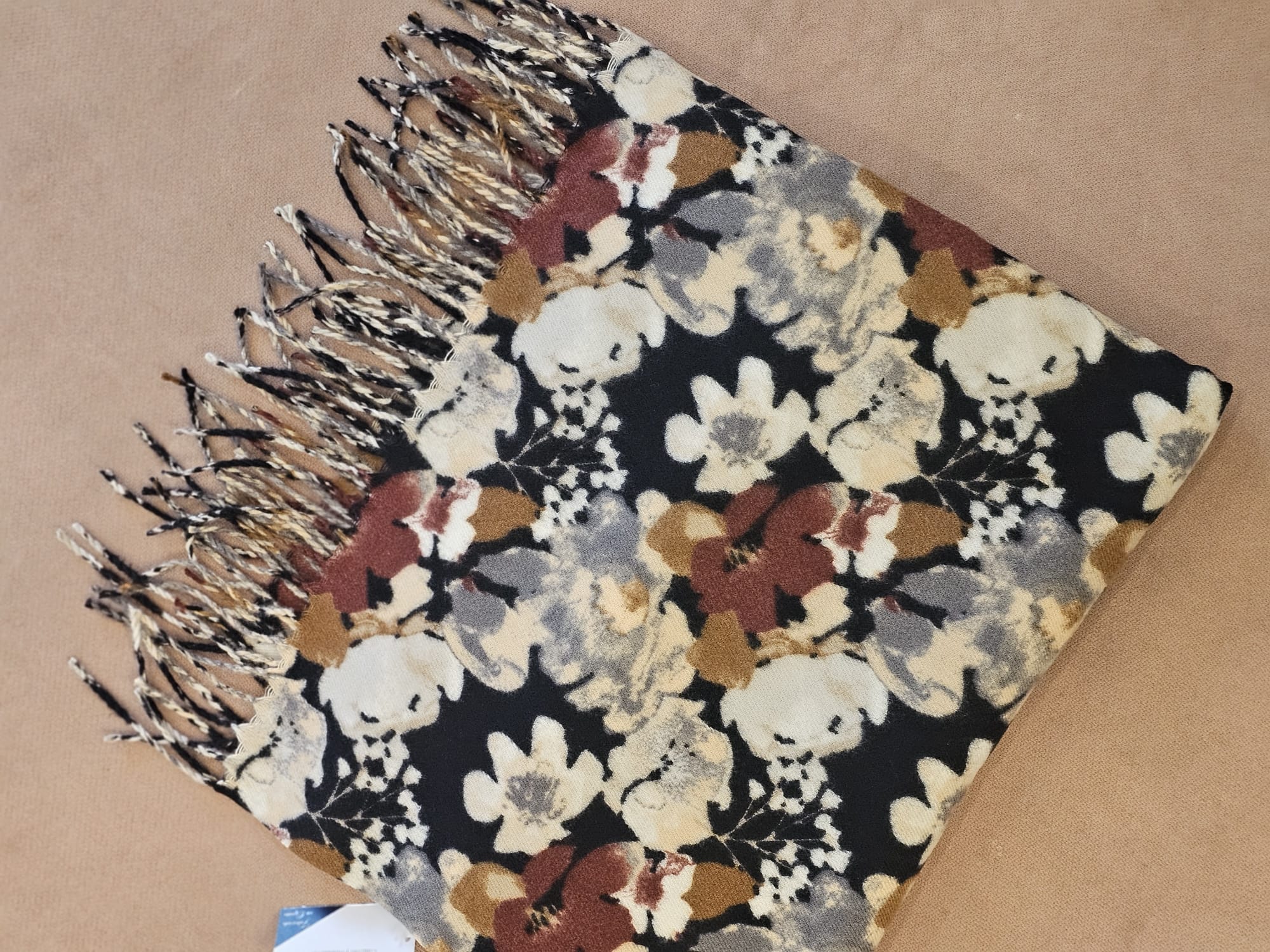 Bufanda ligera con estampado geométrico en tonos tierra, negro, beige, gris y caldera, rematada con un borde de flecos. Perfecta para dar un toque original y elegante a tus looks diarios.
