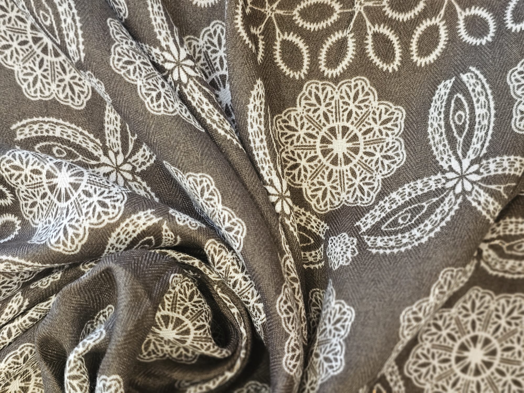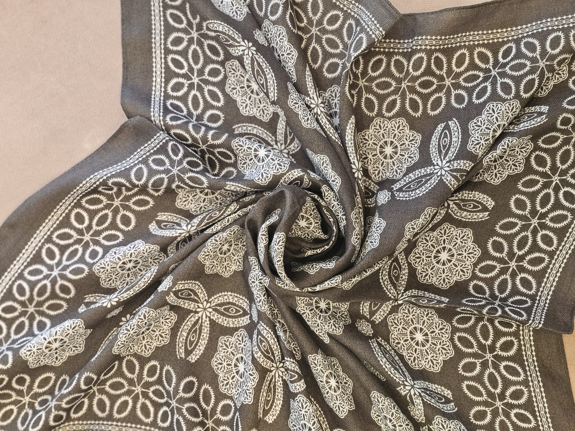 Bufanda ligera con estampado geométrico y florales en tonos tierra, gris y beige. Perfecta para dar un toque original y elegante a tus looks diarios.
