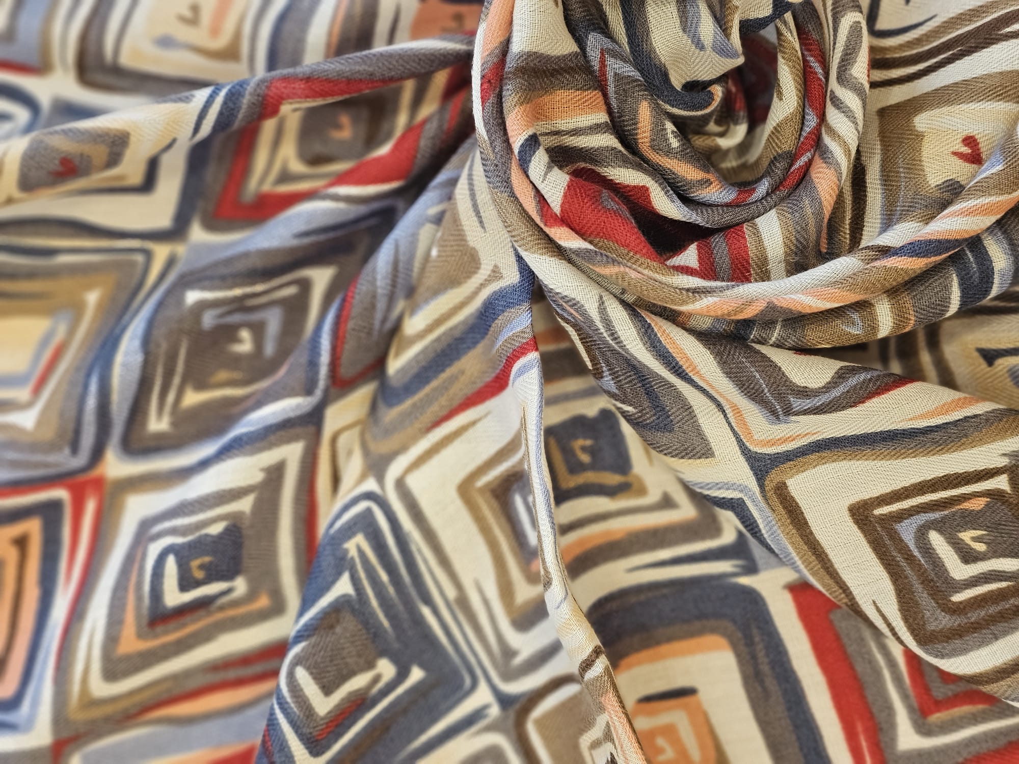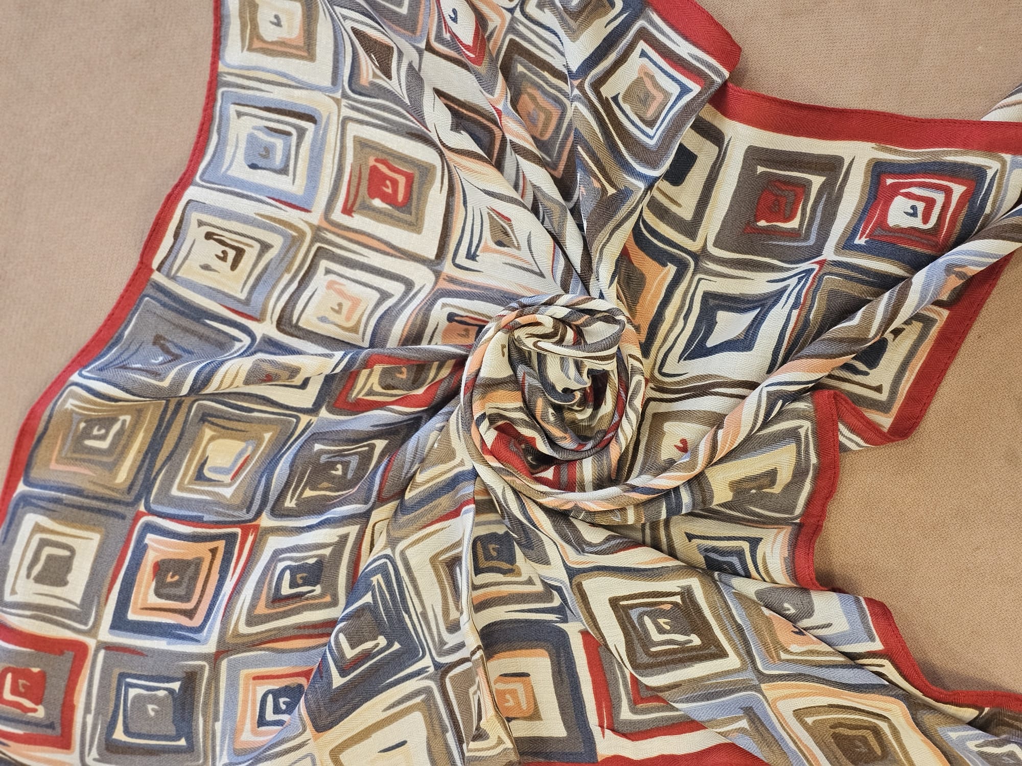 Bufanda ligera con estampado geométrico en tonos tierra, azul y burdeos, rematada con un borde rojo. Perfecta para dar un toque original y elegante a tus looks diarios.