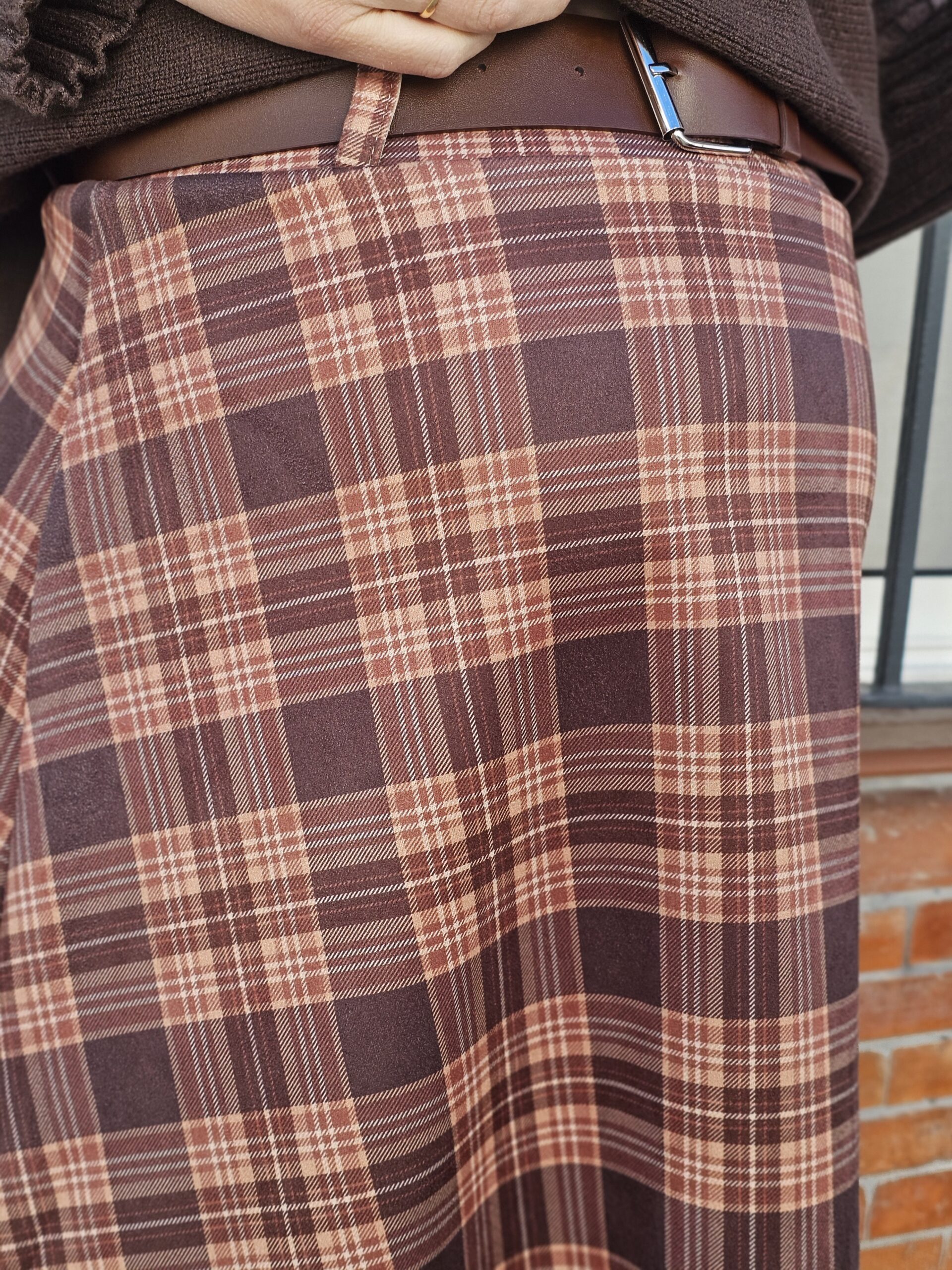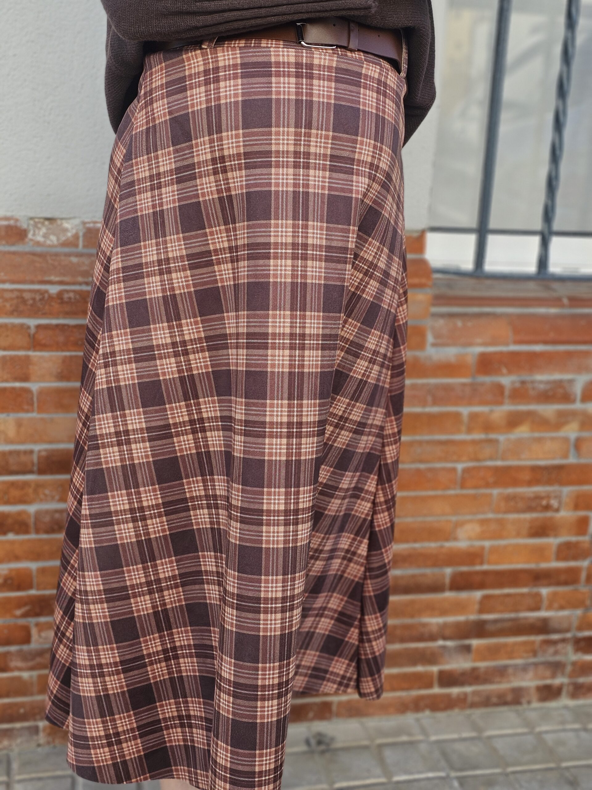 Falda midi de cuadros en tonos marrones y teja, con caída fluida y talle cómodo. Perfecta para looks de otoño con estilo.
