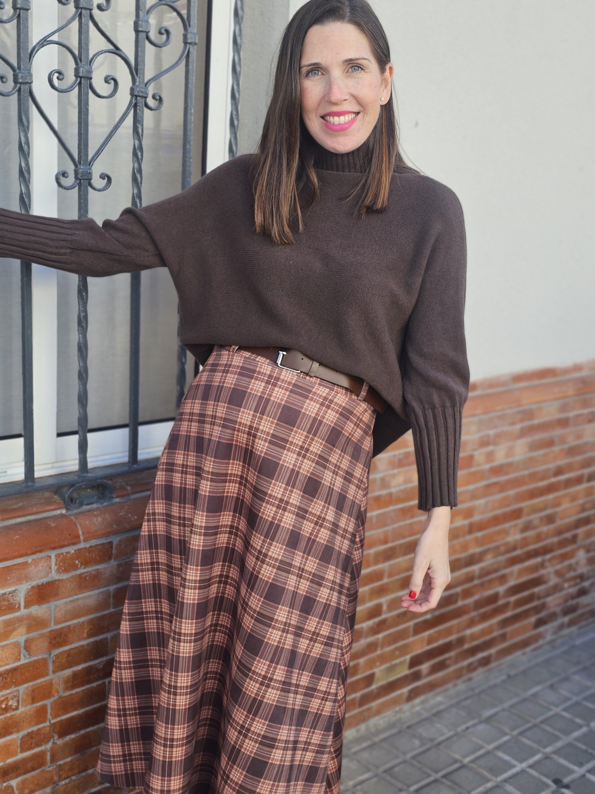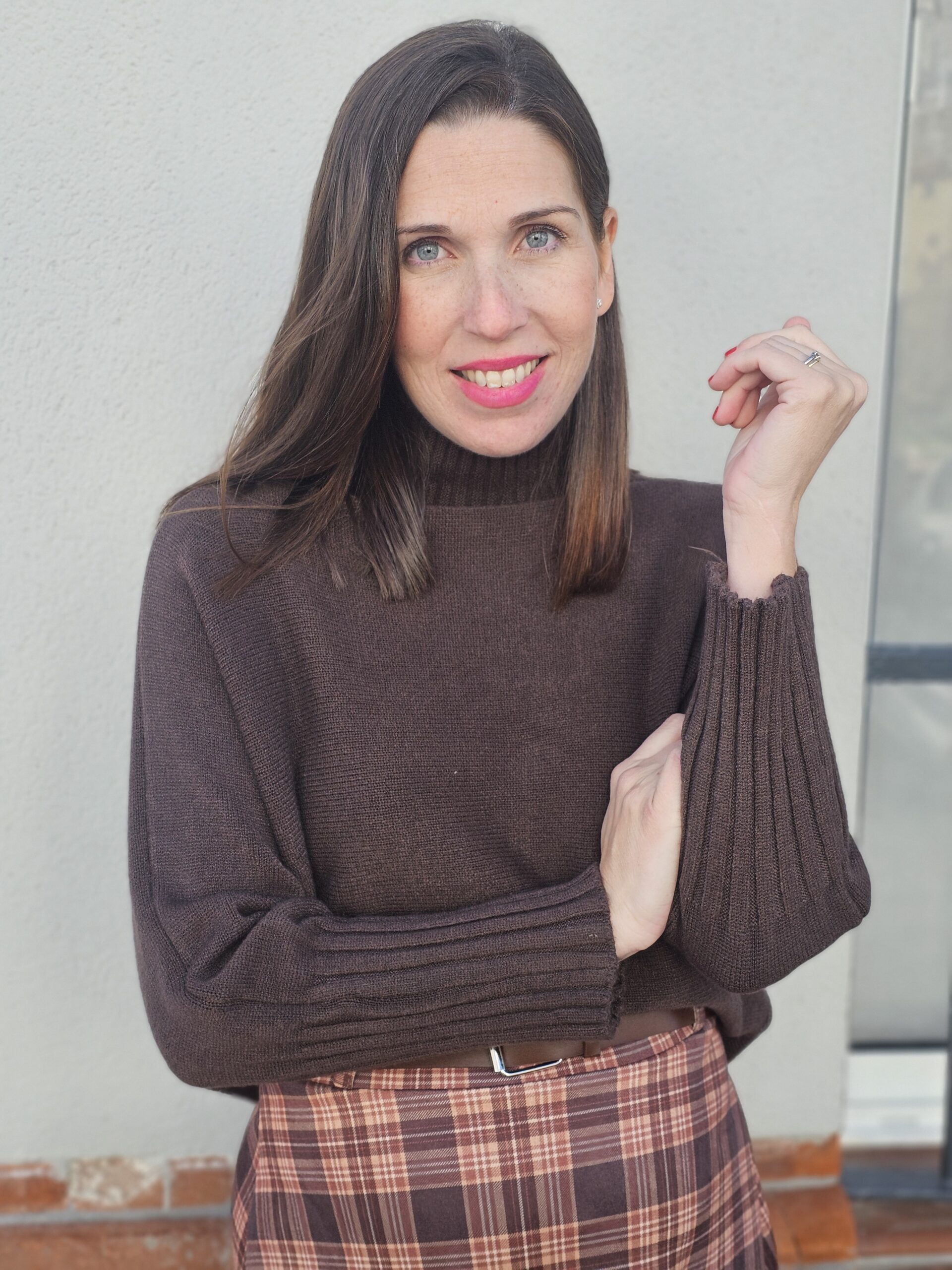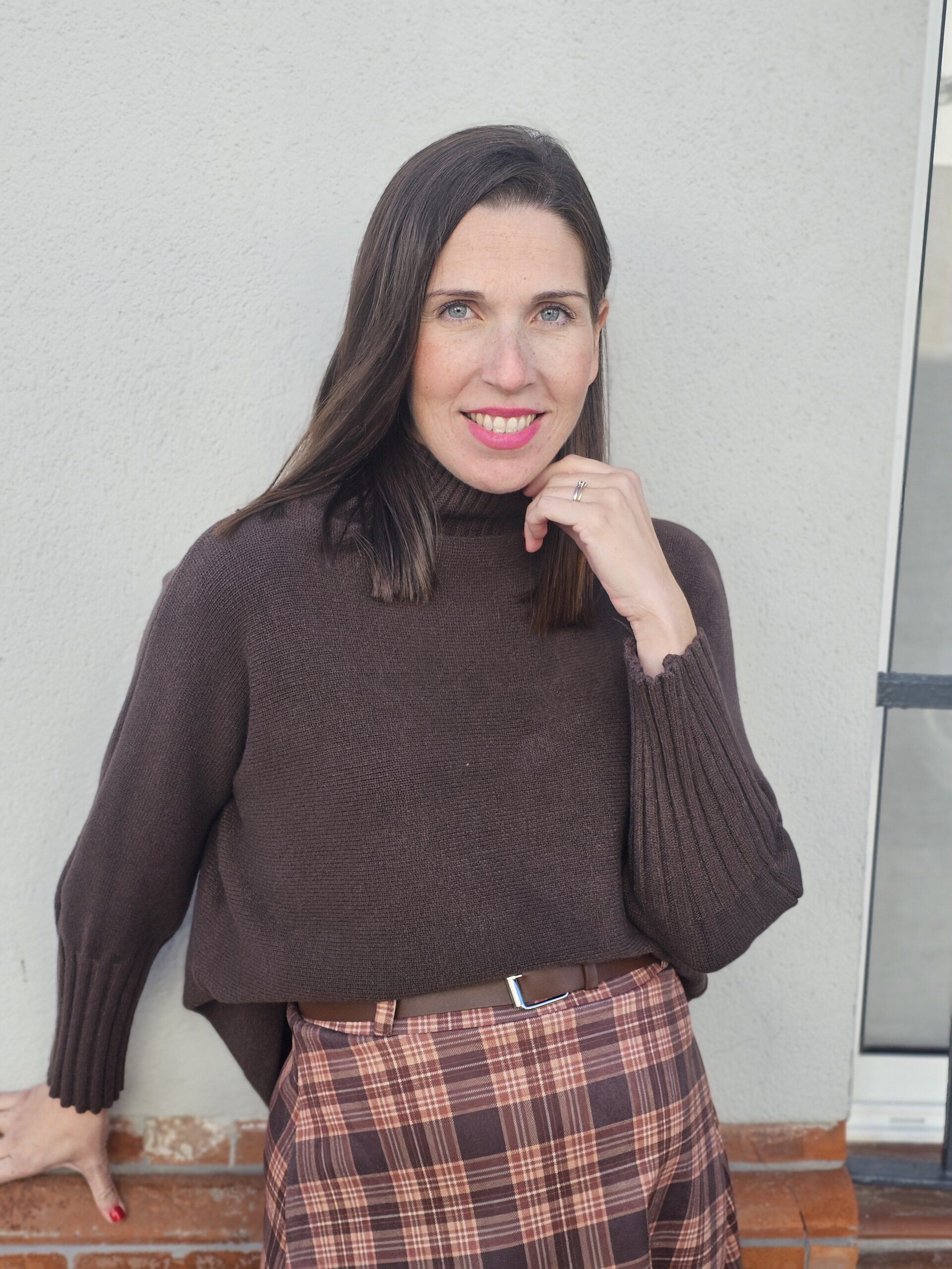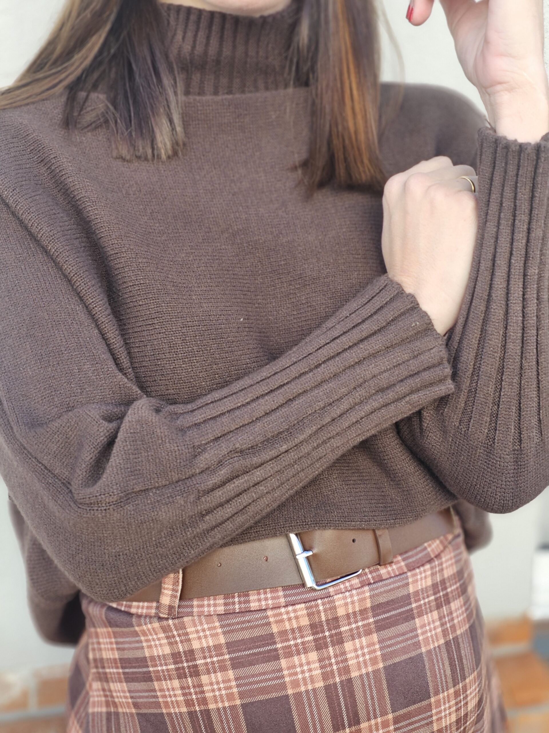 Jersey de punto fino en color marrón chocolate con cuello alto y mangas acanaladas. Suave, elegante y perfecto para el día a día.