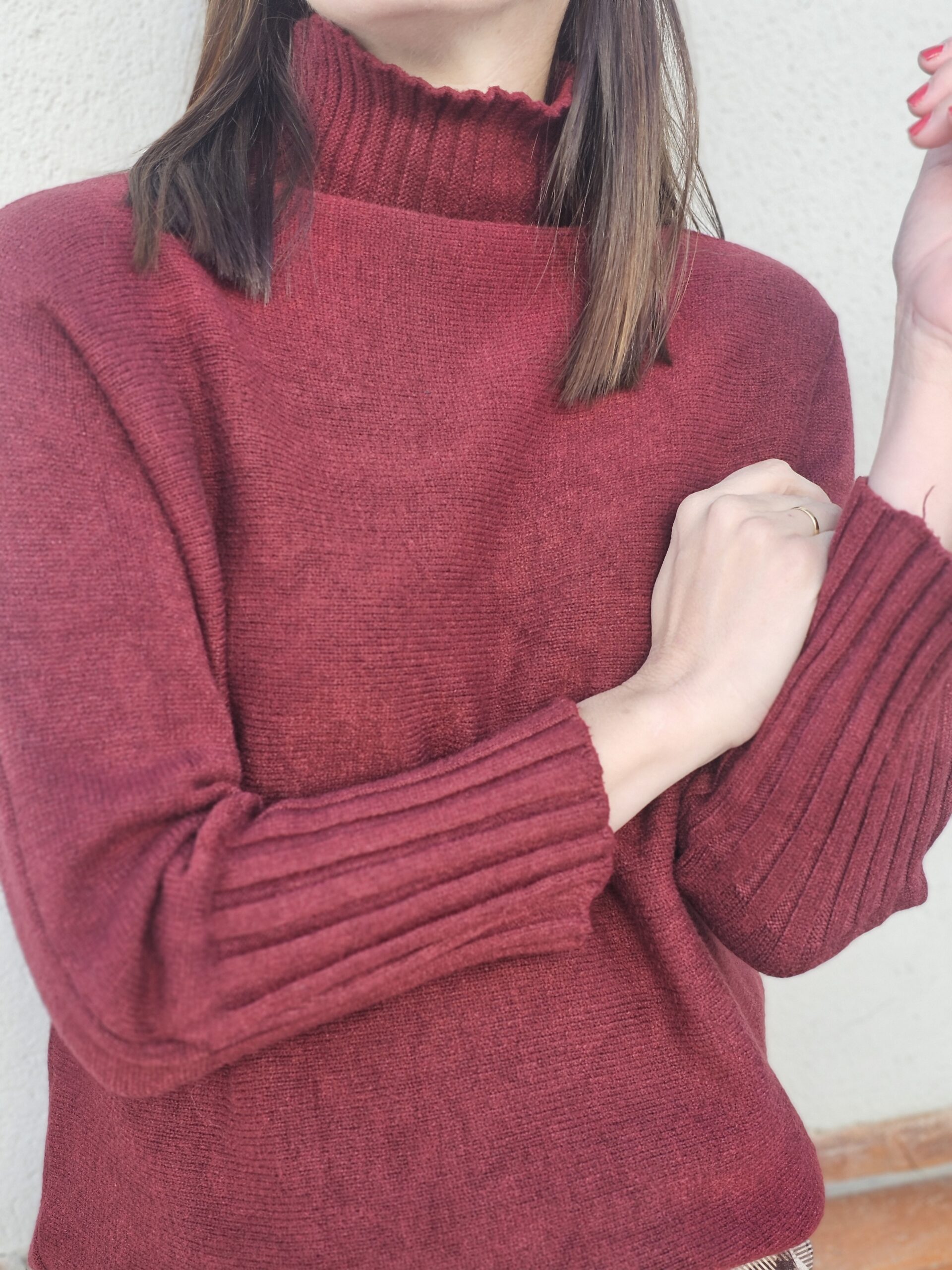 Jersey burdeos de estilo cálido y elegante, confeccionado en un punto suave y agradable al tacto. Presenta un diseño clásico y versátil, ideal para el día a día, aportando un toque de color sofisticado a cualquier look. Perfecto para combinar tanto con pantalones como con faldas y crear conjuntos llenos de estilo esta temporada.