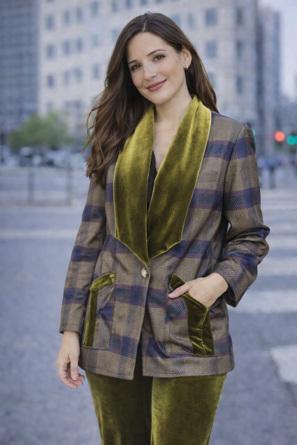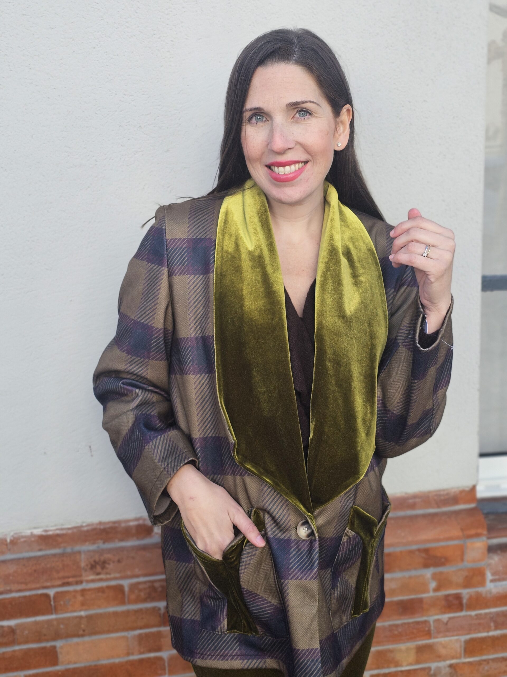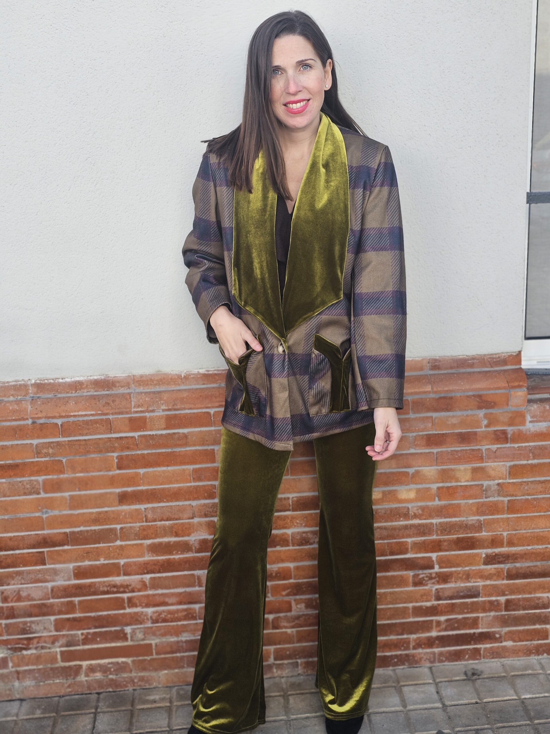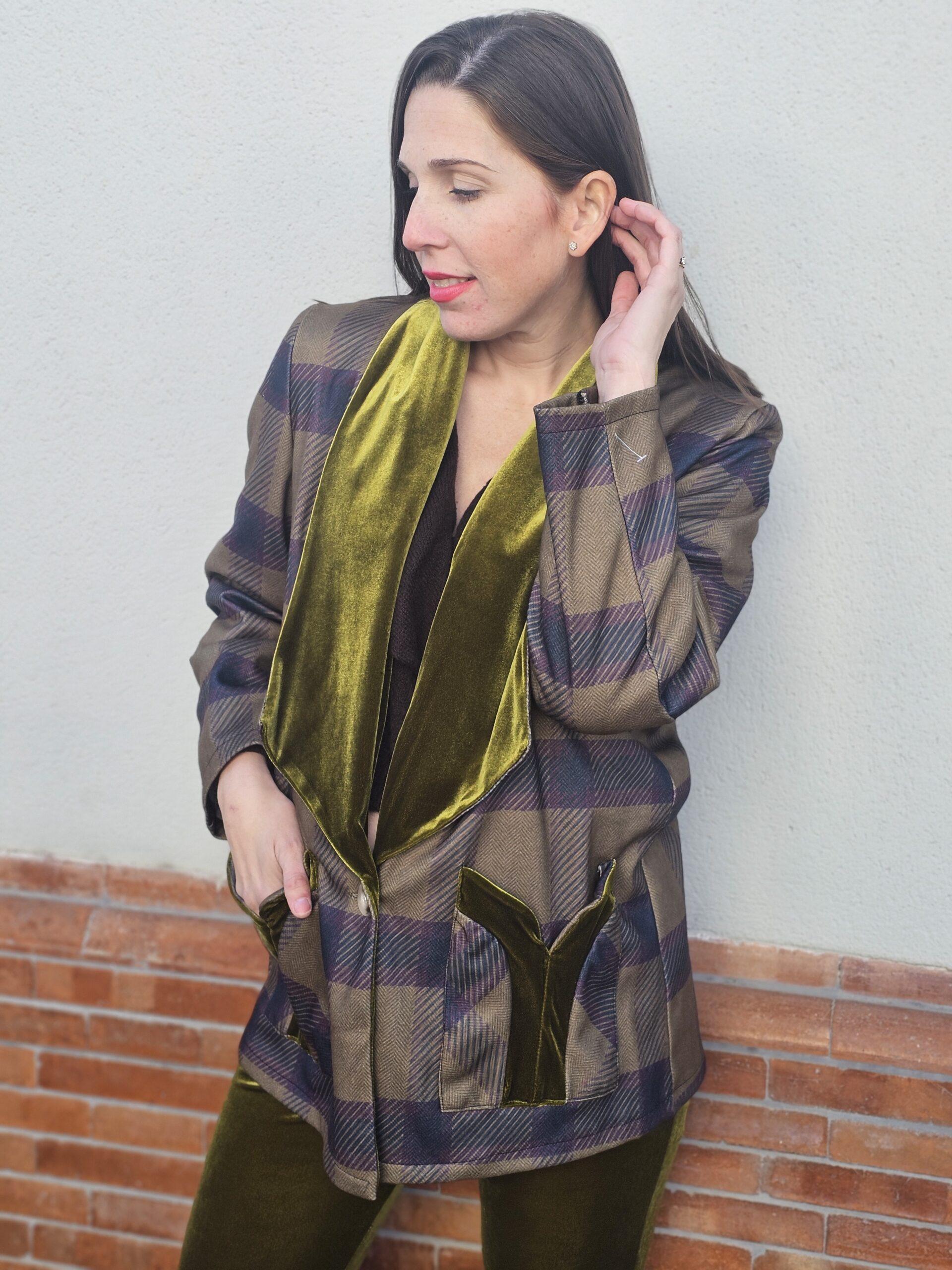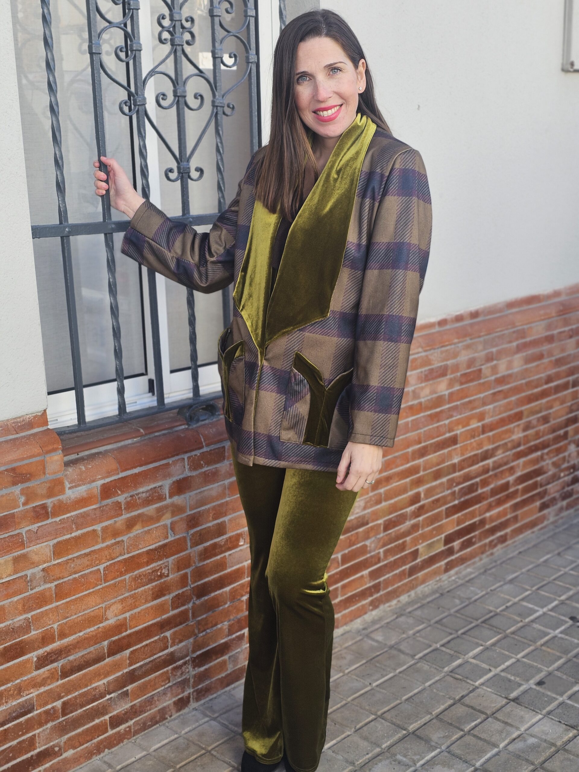 Americana de cuadros en tonos tierra con detalles en terciopelo verde oliva. Solapa amplia y bolsillos decorativos que aportan un toque elegante y distintivo. Un diseño único, sofisticado y perfecto para elevar cualquier look esta temporada.
