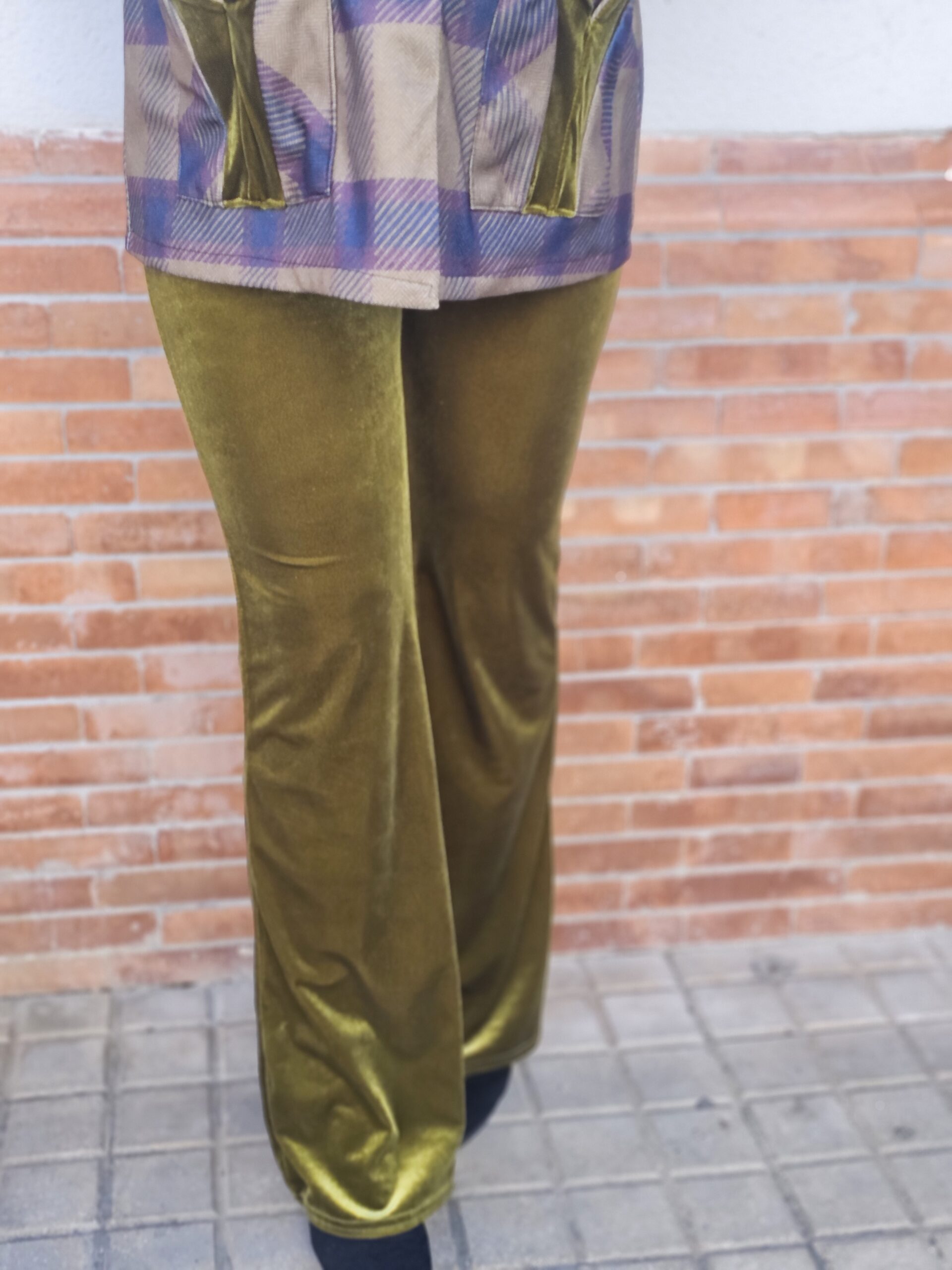 Pantalón de terciopelo con caída suave y tacto aterciopelado en tono verde olivo. Diseño estilizado con ligera campana que alarga la figura. Cómodo, elegante y perfecto para looks invernales con un toque sofisticado.