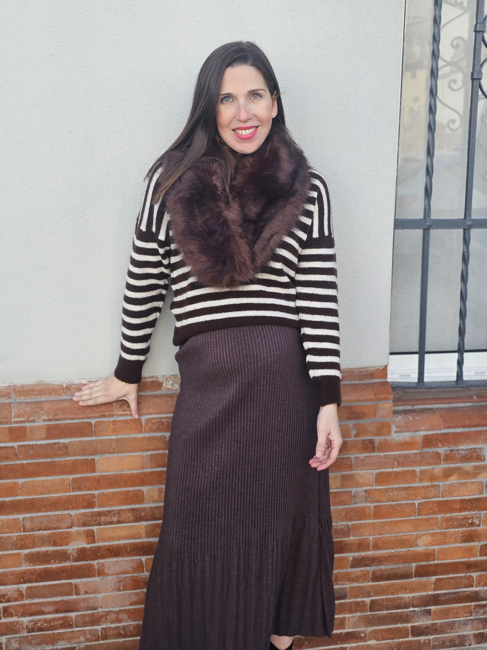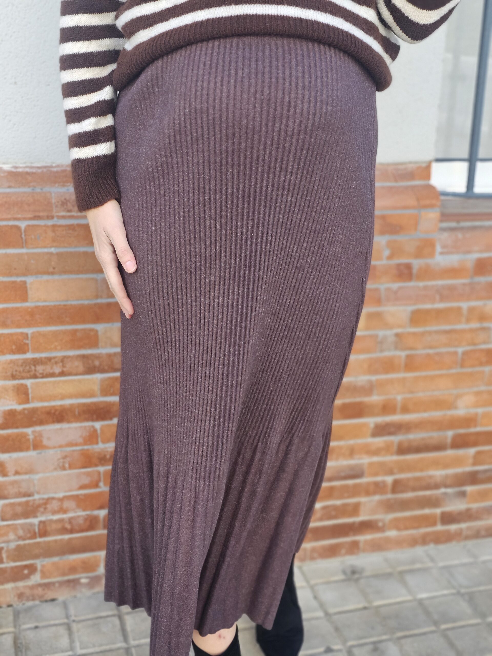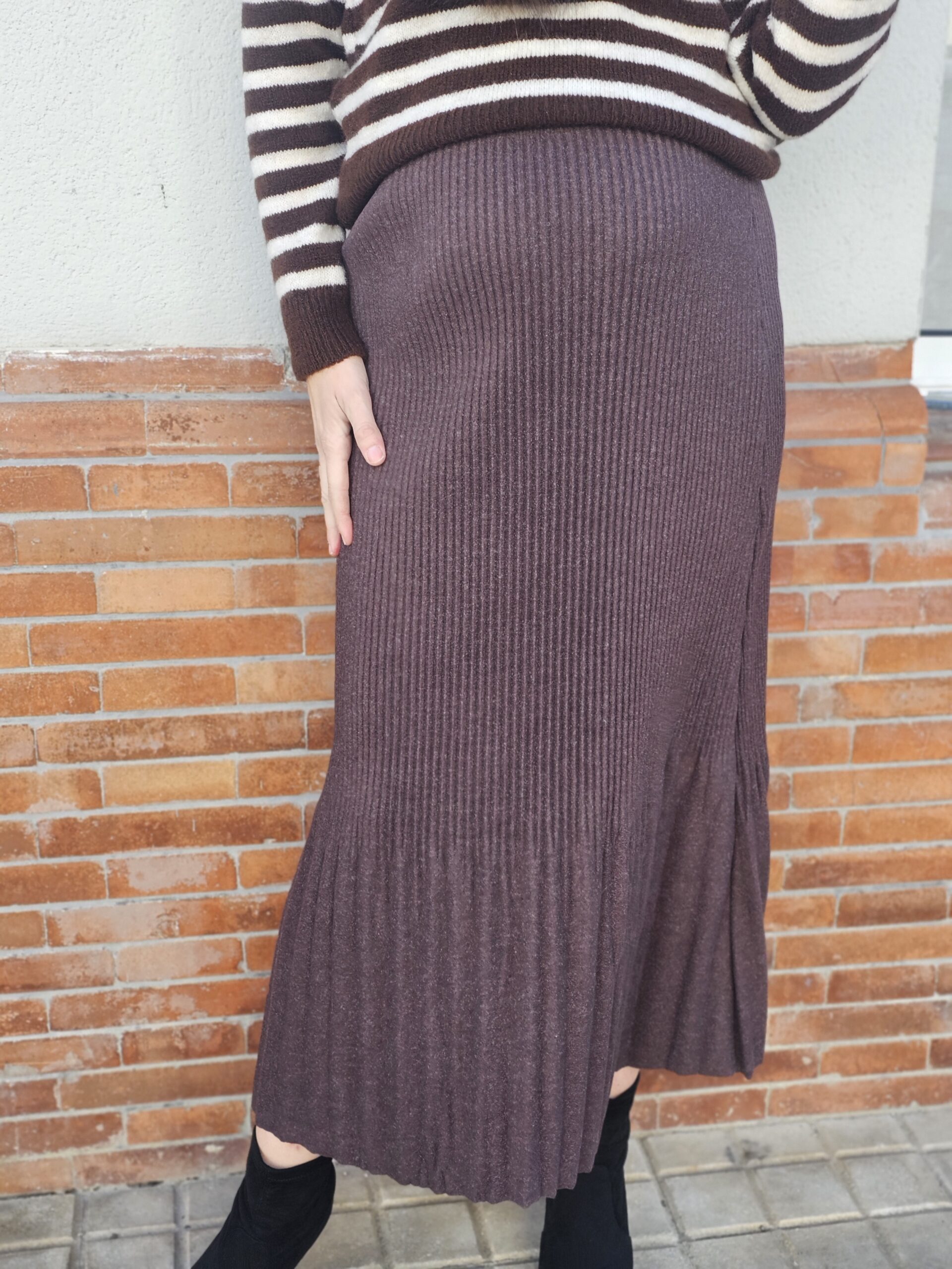 Falda midi marrón plisada, elegante y versátil, perfecta para elevar cualquier look. Su tejido con caída suave y pliegues definidos aporta movimiento y un estilo muy femenino. La cintura cómoda realza la silueta y permite combinarla fácilmente con blusas, jerseys o tops más casual. Ideal para el día a día o para eventos en los que quieras un toque sofisticado sin esfuerzo.