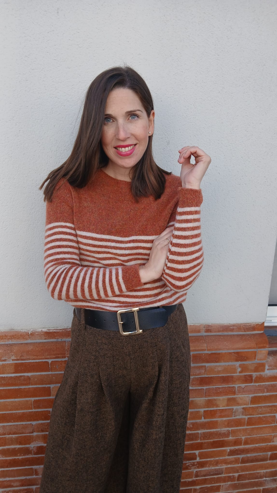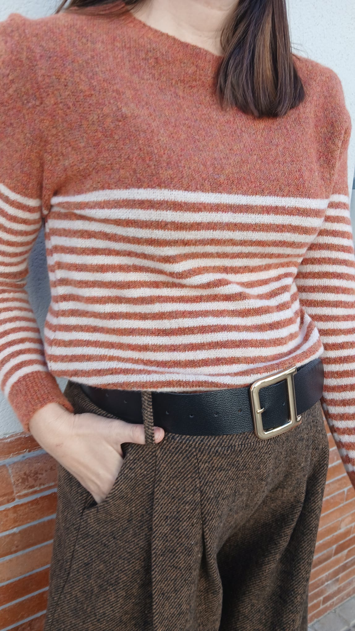 Jersey de rayas en tono caldera, suave y muy cálido, con diseño bicolor y textura esponjosa que aporta un toque actual y favorecedor. Ideal para combinar con pantalones de pinza, faldas y looks de diario.