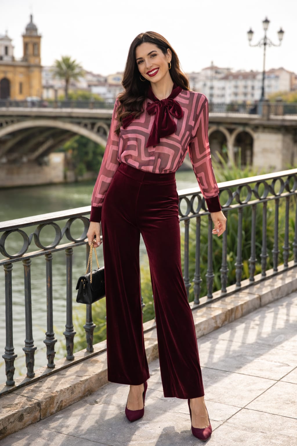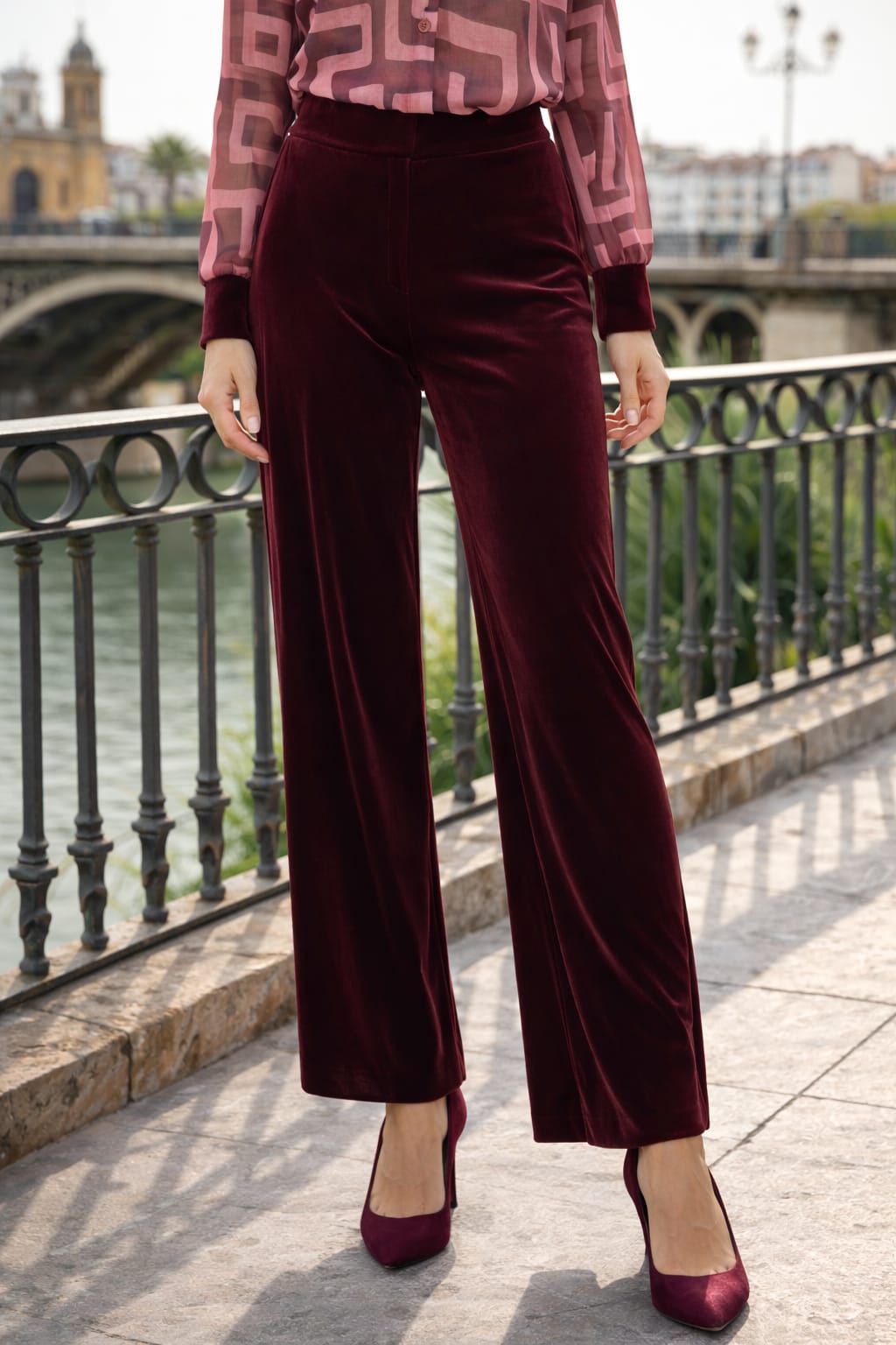 Pantalón de terciopelo burdeos de tiro alto y pernera recta. Su tejido suave y con caída aporta comodidad y un acabado elegante, ideal para combinar tanto en looks de ocasión como en estilismos más especiales.