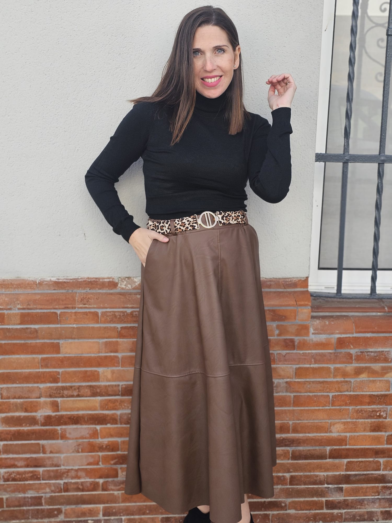 Falda de cuero marrón con cinturón de leopardo incluido, una combinación perfecta de elegancia y carácter. Su diseño favorecedor y el contraste del cinturón aportan un toque moderno y sofisticado, ideal para elevar cualquier look.