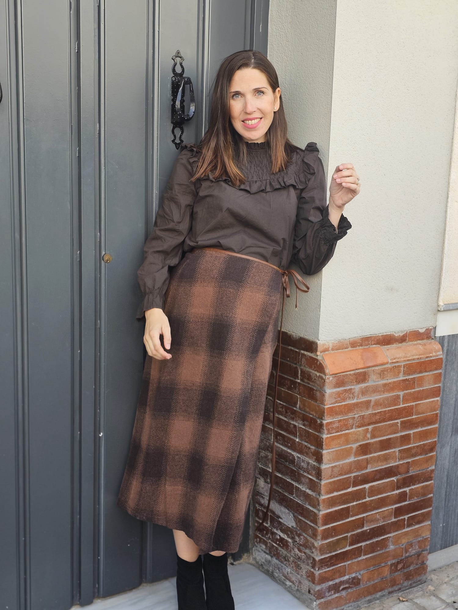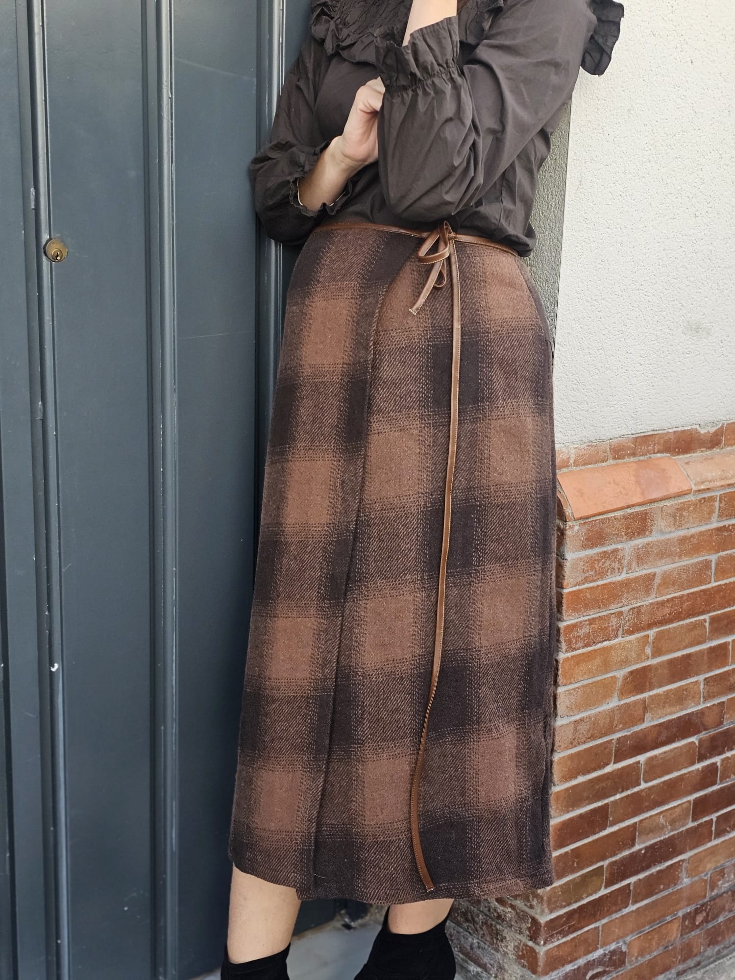 Falda de cuadros marrón anudada, de diseño femenino y favorecedor. Su cierre anudado en la cintura aporta un toque especial y ajustable, ideal para crear looks elegantes o casuales con un aire cálido y actual.