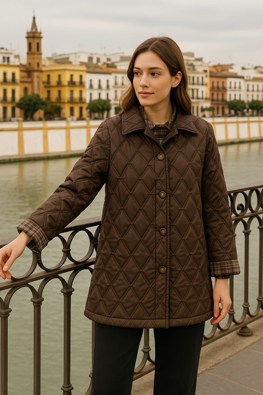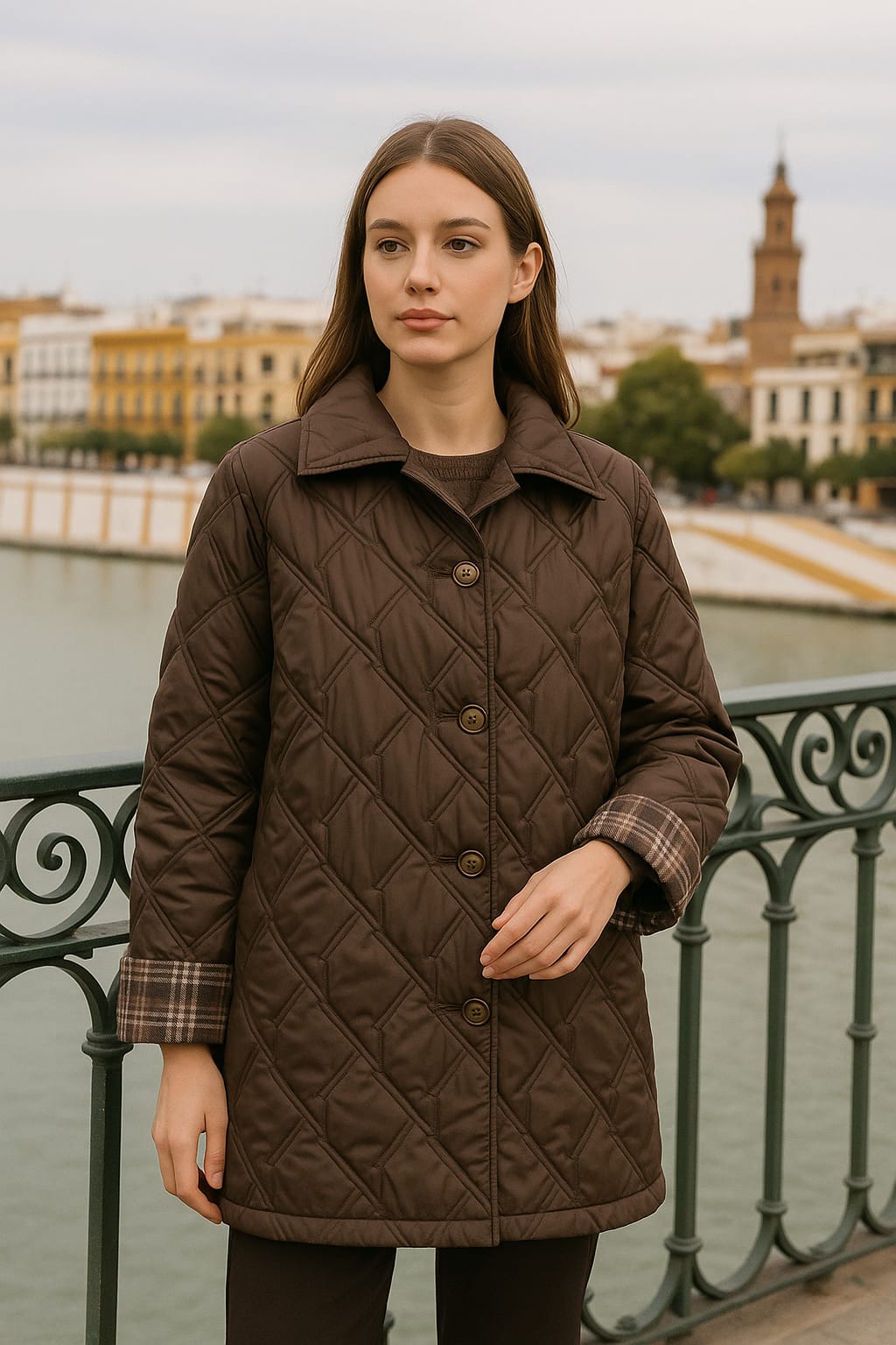 Abrigo acolchado marrón de estilo elegante y versátil, con originales puños de cuadros que aportan un toque distintivo. Cálido y ligero, ideal para los días fríos sin renunciar al estilo. Perfecto para combinar tanto con looks casuales como más arreglados.