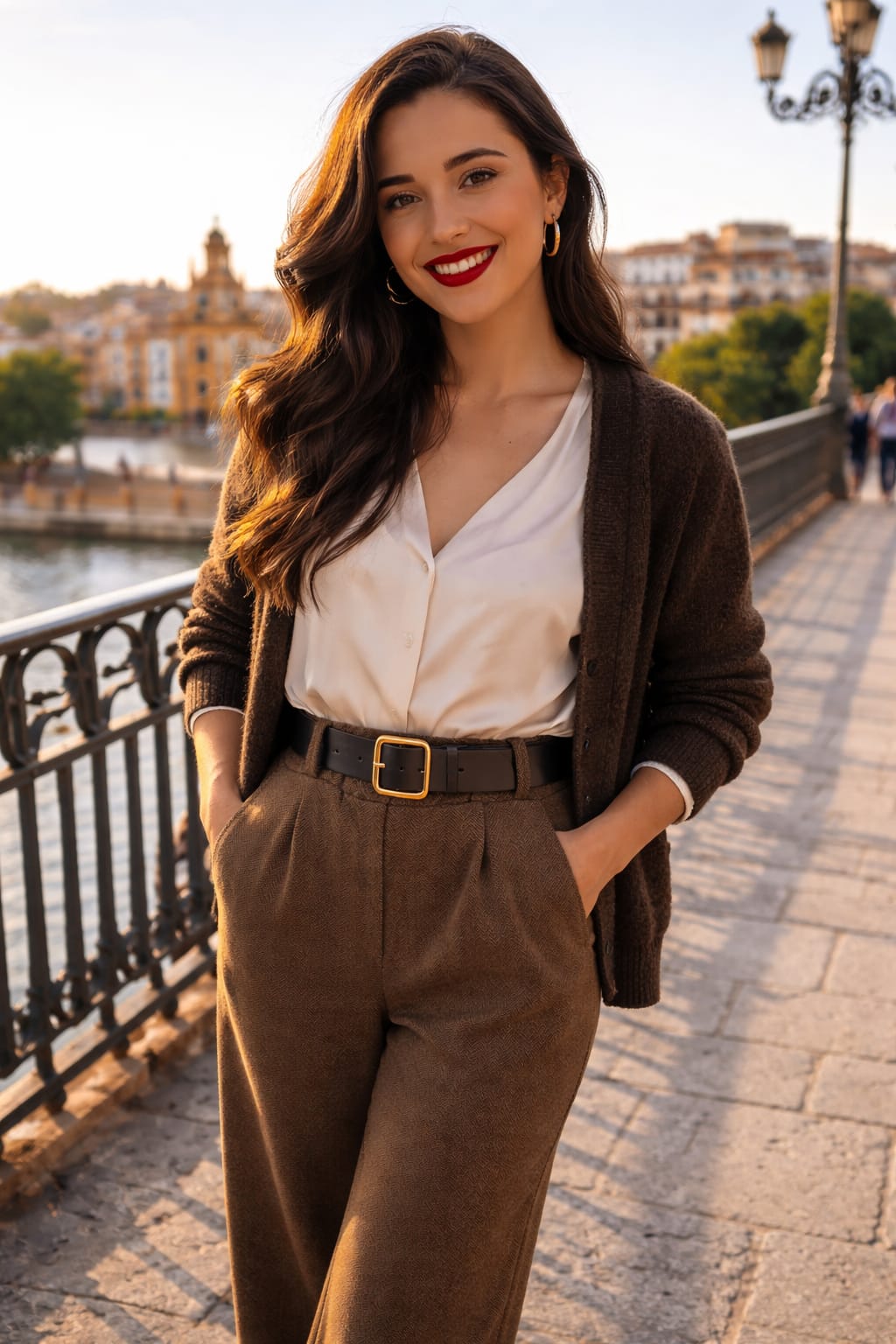 Pantalón de corte recto en tono marrón con tejido de espiga. Diseño de cintura alta con pinzas delanteras, bolsillos laterales y cinturón a contraste con hebilla dorada. Elegante, cómodo y perfecto tanto para looks diarios como para ocasiones más especiales.