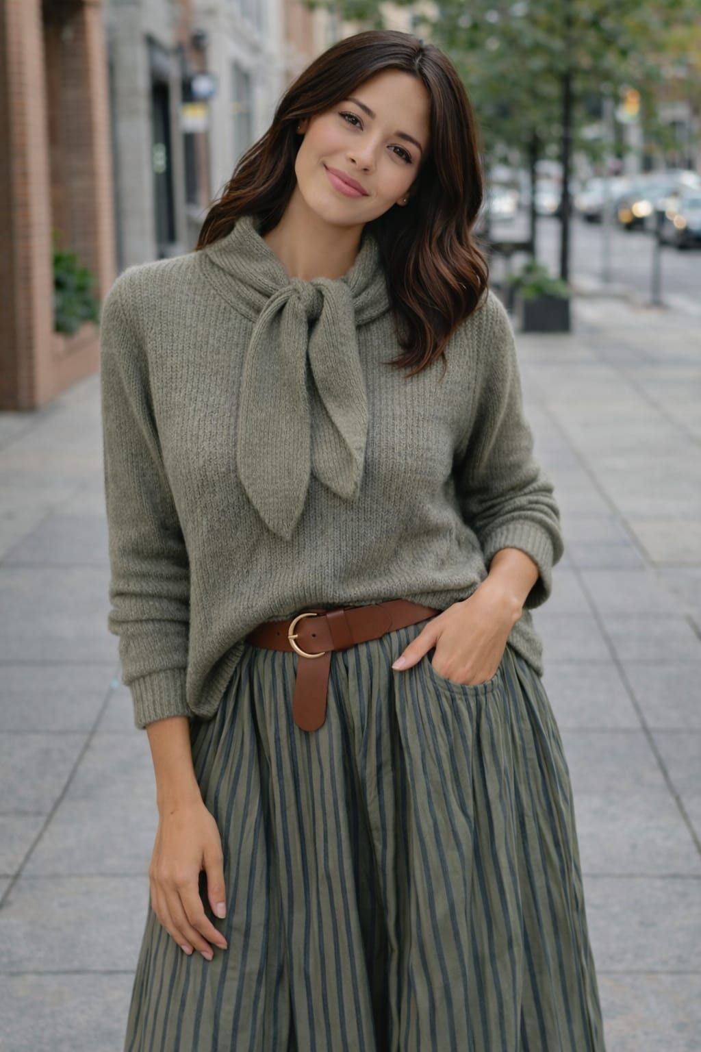 Jersey de punto suave en color gris, con cuello lazada que aporta un toque femenino y elegante. Cómodo y ligero, ideal para combinar con faldas o pantalones y crear looks versátiles para el día a día.