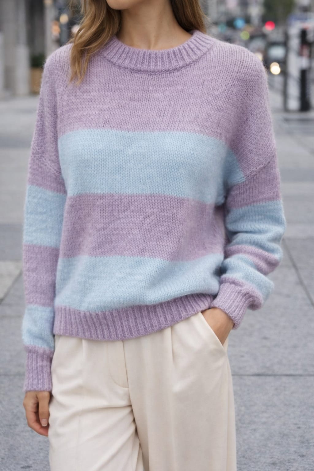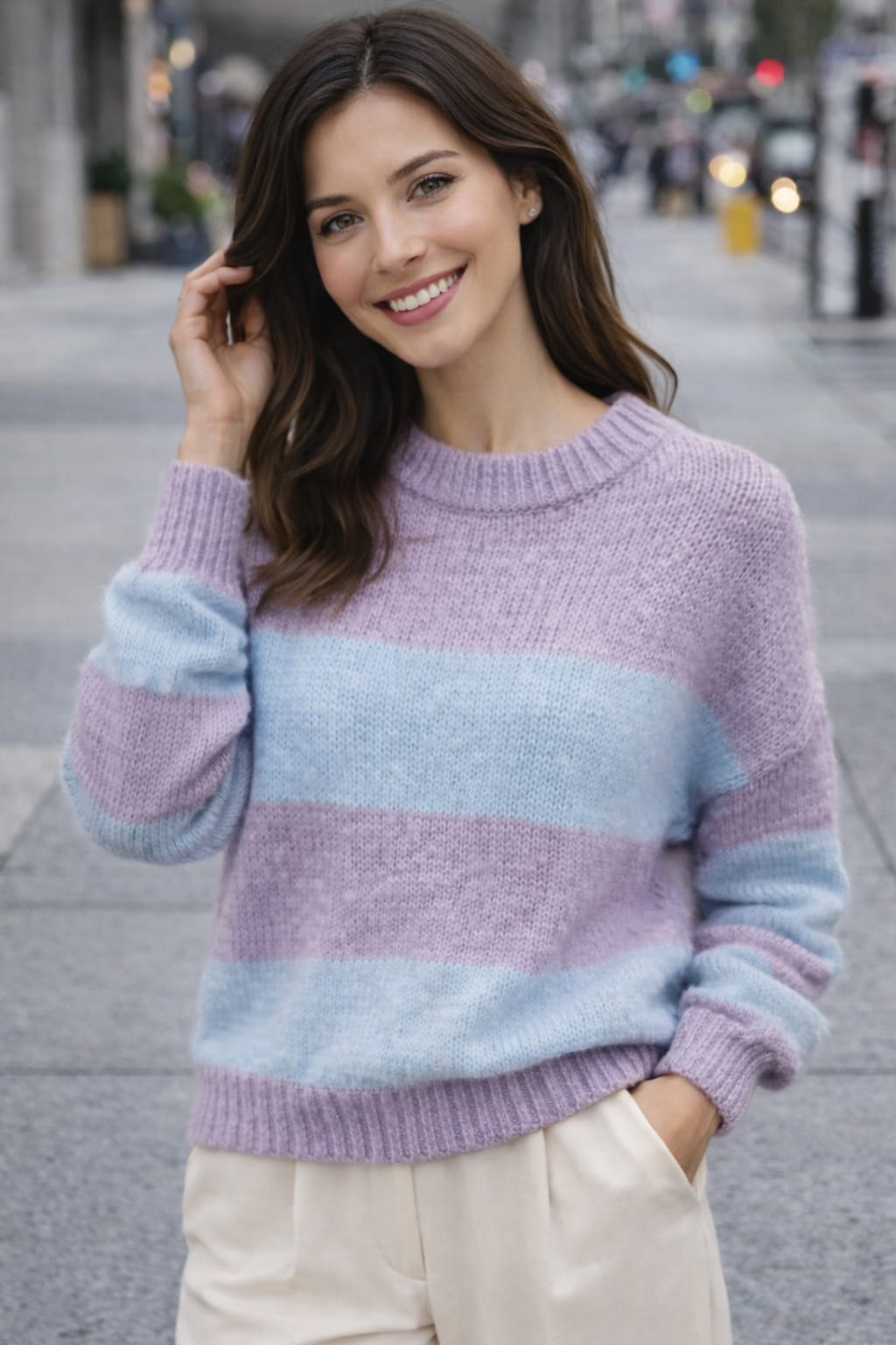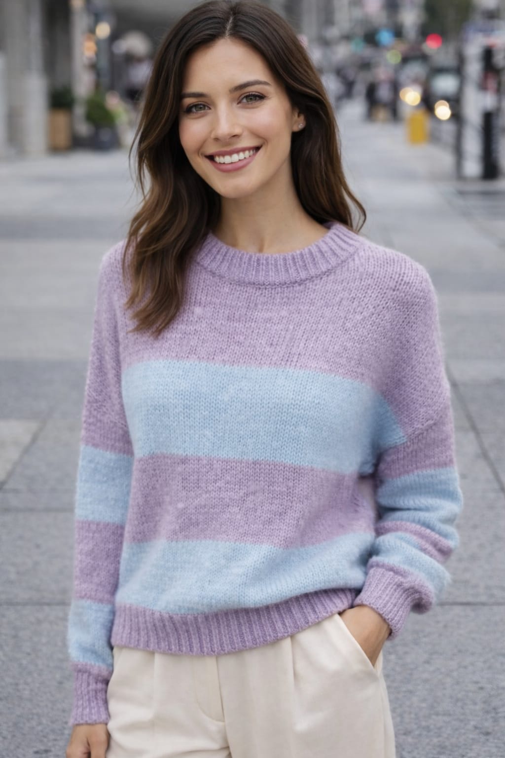 Jersey de punto suave a rayas en tonos malva y celeste, con cuello redondo y puños en malva. Diseño cómodo y favorecedor, de tacto agradable y caída ligera. Perfecto para aportar un toque de color a tus looks diarios