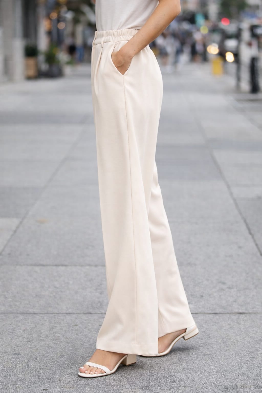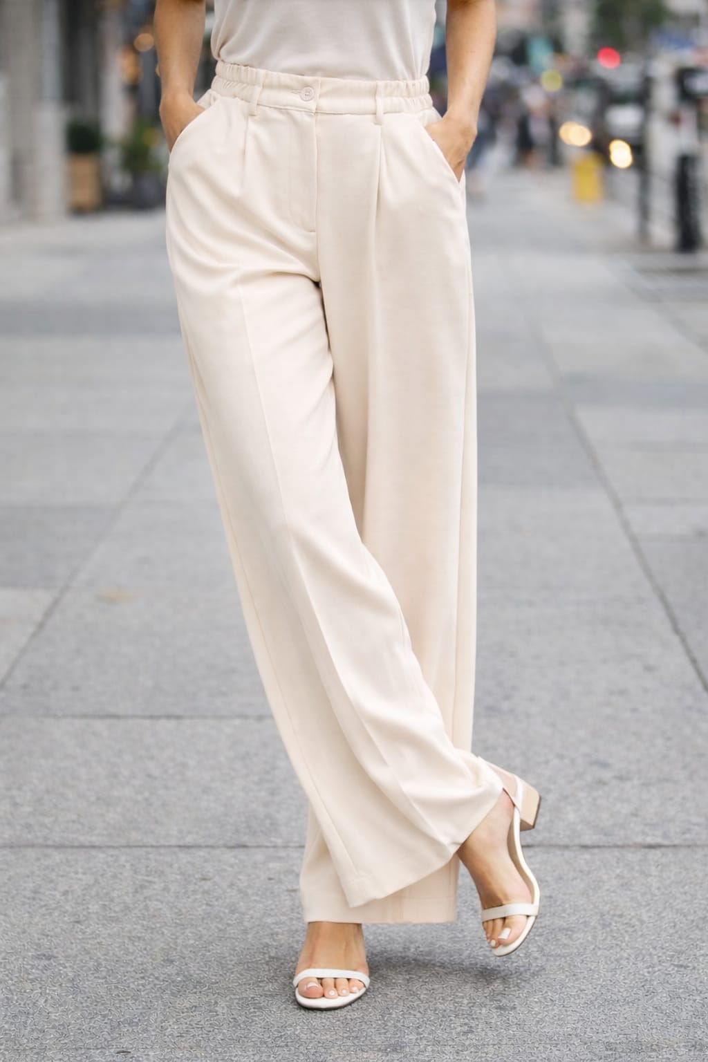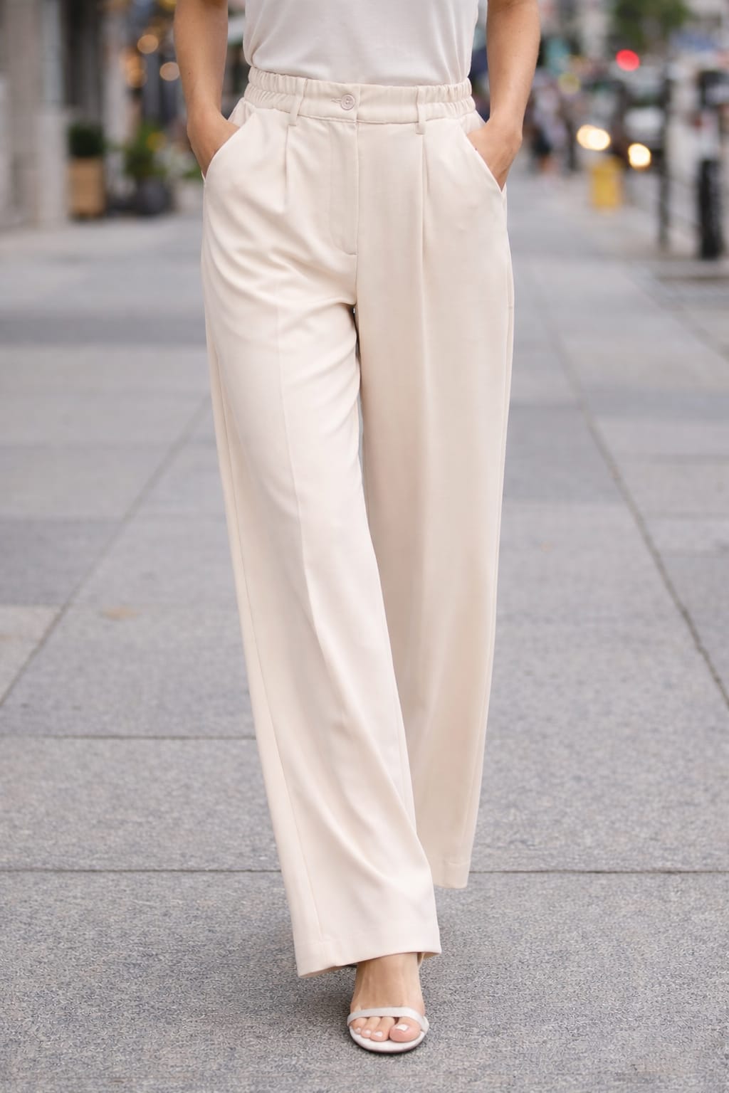 Pantalón palazzo en color beige clarito / blanco roto, de caída fluida y tacto suave. Cintura elástica con botón frontal que aporta comodidad sin perder elegancia. Un básico imprescindible, ideal para looks frescos y sofisticados.