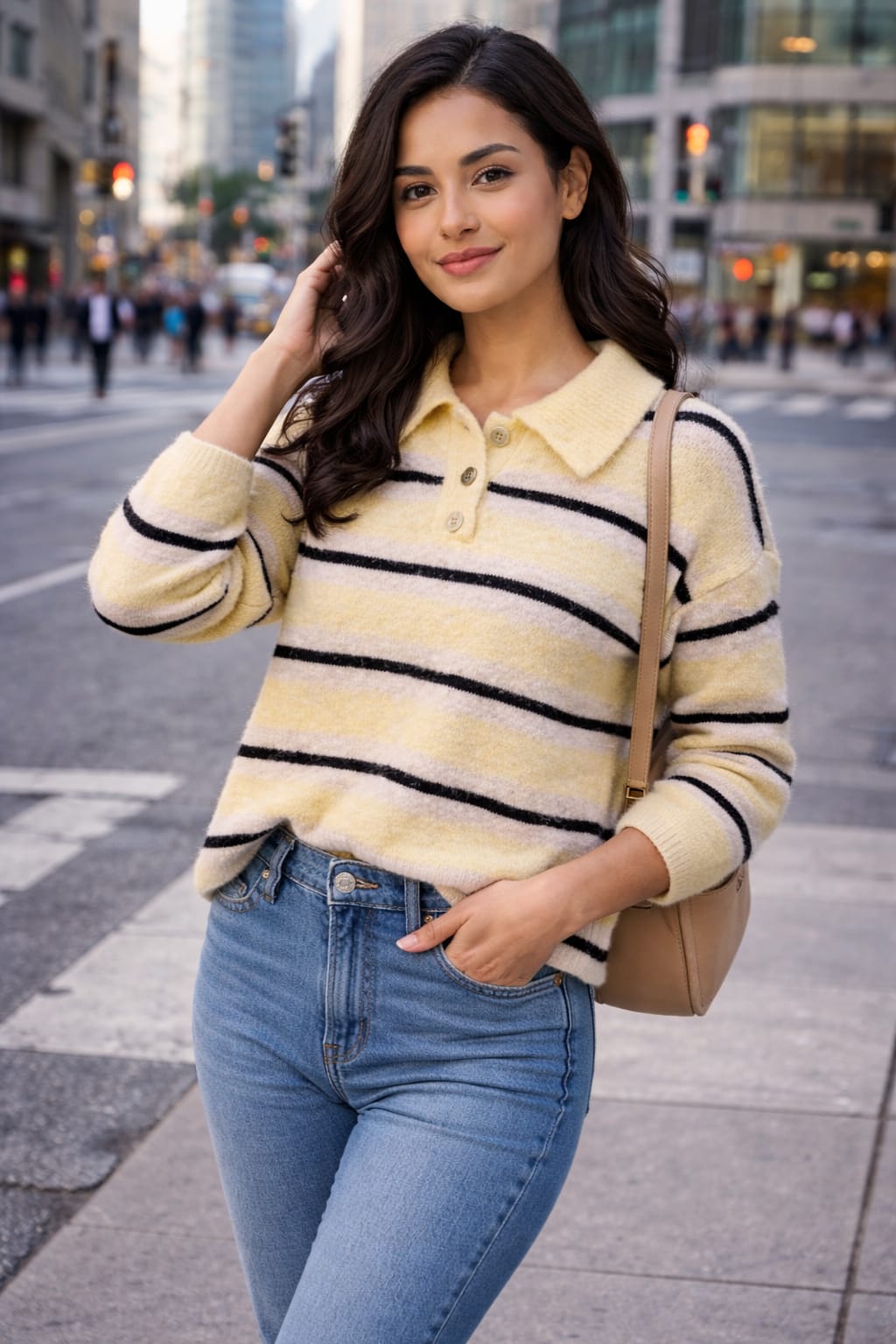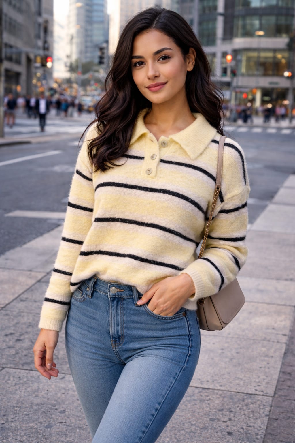 Chaleco de punto suave con rayas en tonos pastel, cuello camisero y cierre frontal con tres botones tipo nudo. Cómodo, ligero y muy favorecedor, ideal para darle un toque dulce y actual a tus looks diarios.