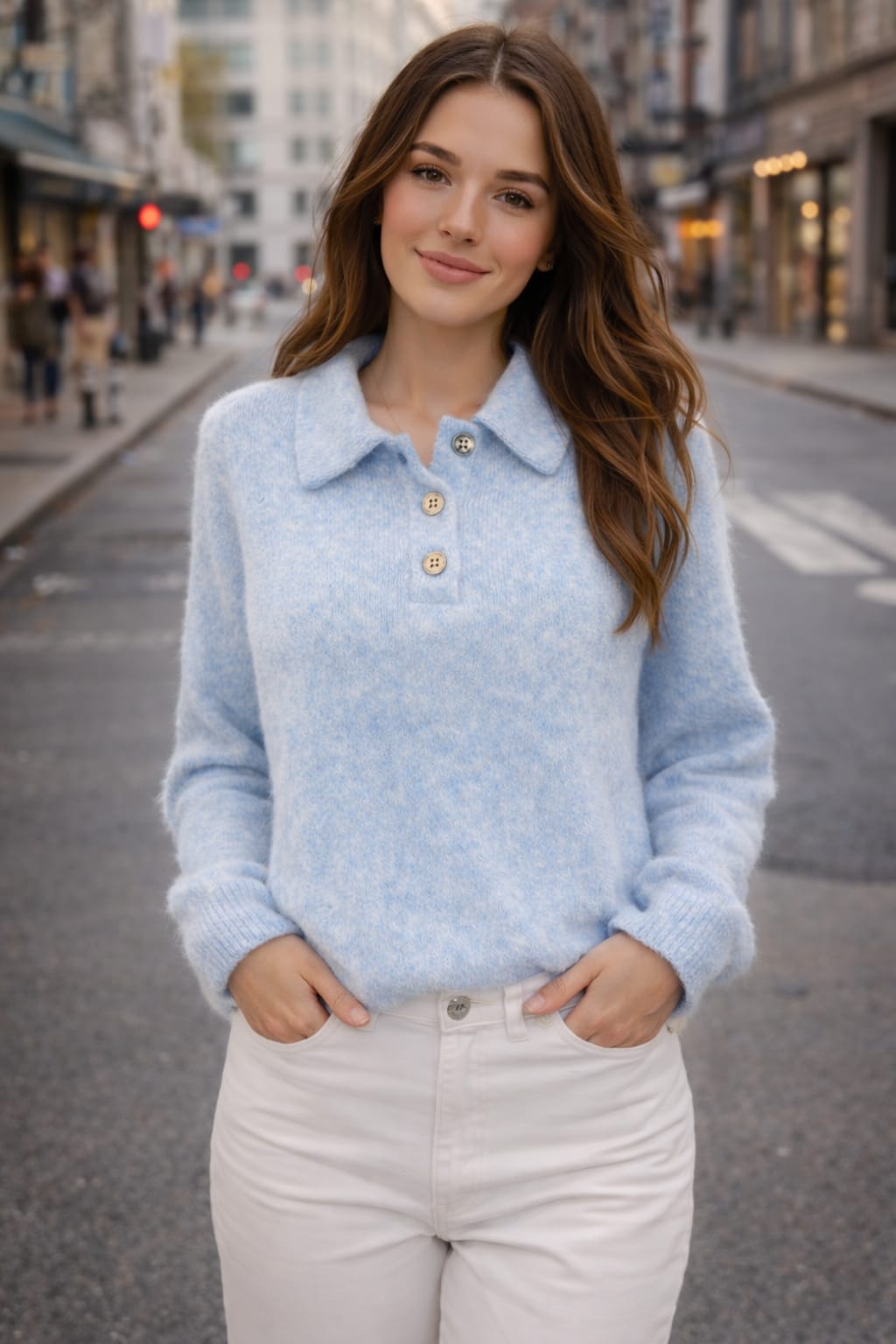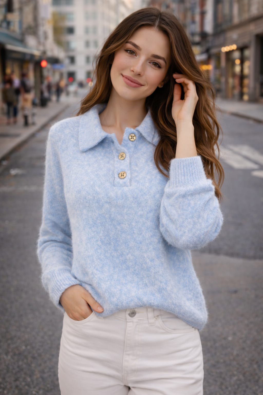 Jersey suave tipo polo con cuello camisero y tres botones decorativos. Tejido gustoso y ligero, ideal para el día a día. Un básico cómodo con un toque especial.