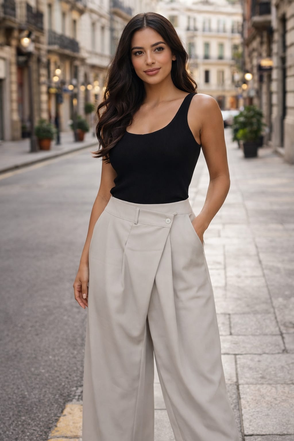 Pantalón fluido de pernera ancha con diseño cruzado y botón lateral. Cinturilla lisa por delante y elástico trasero para un ajuste cómodo. Elegante, ligero y muy fácil de combinar para looks diarios o más arreglados.