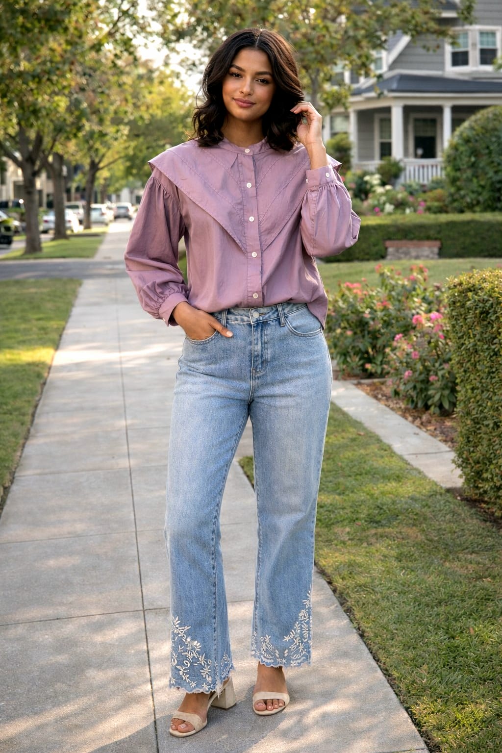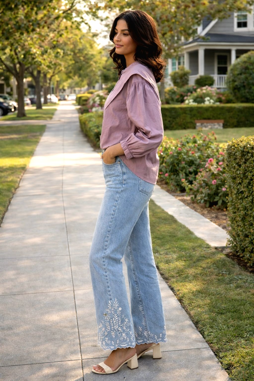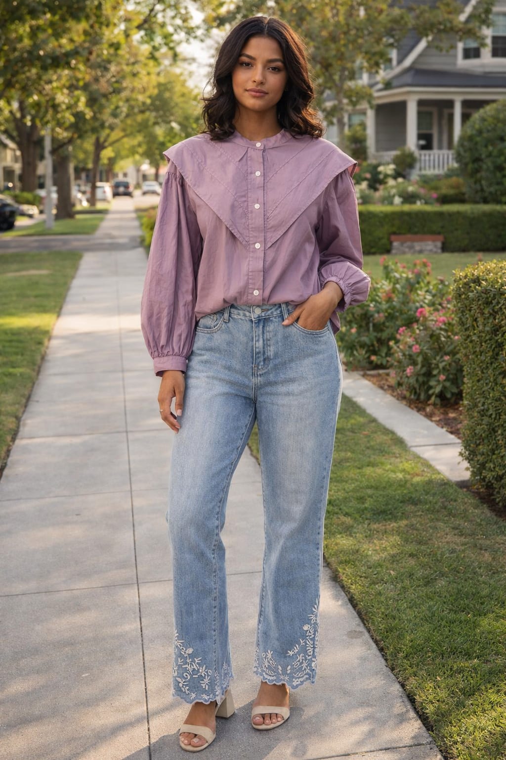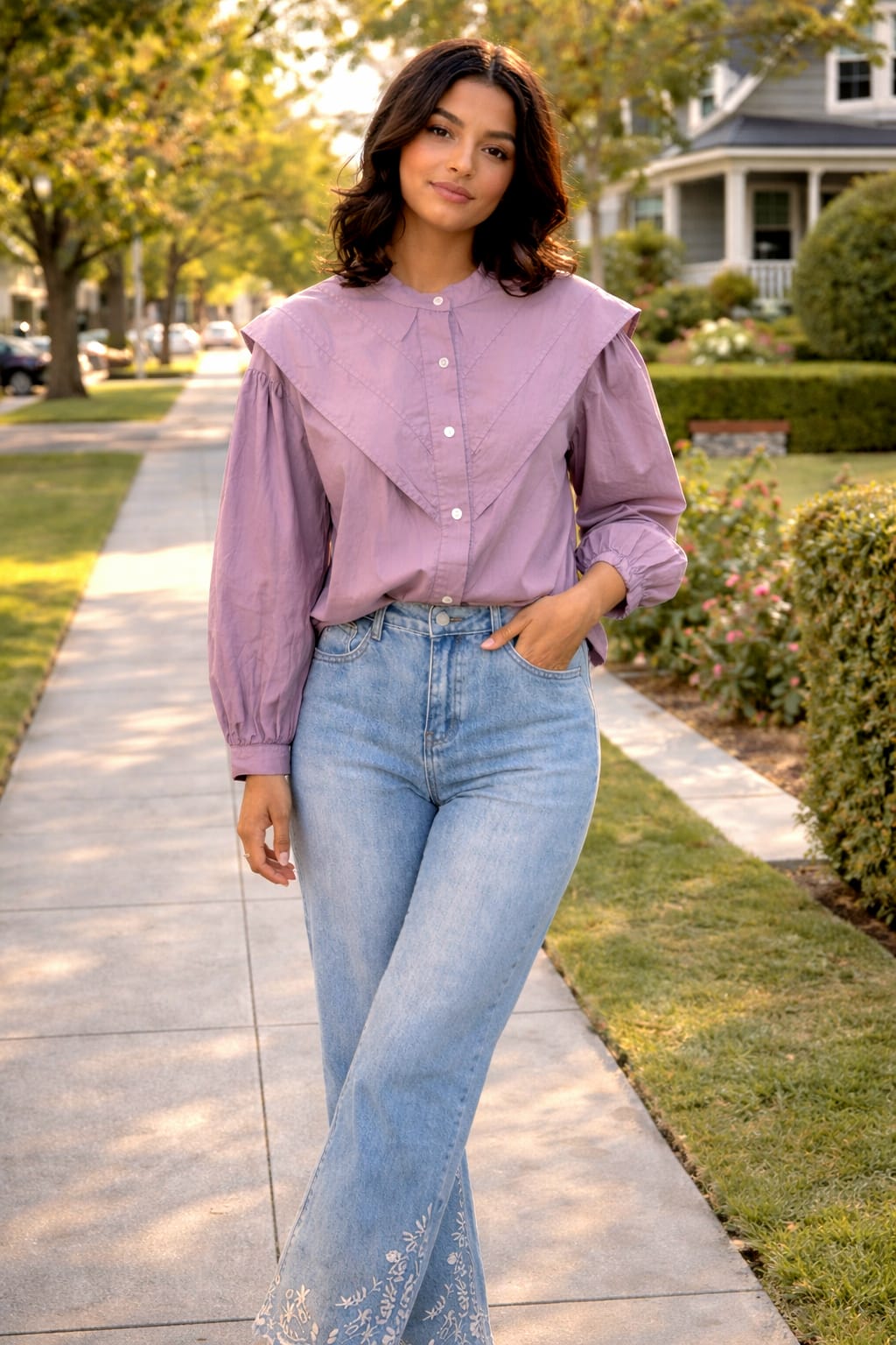 Blusa malva de algodón con cuello amplio y manga larga abullonada. Diseño ligero y elegante para un look natural y actual.
