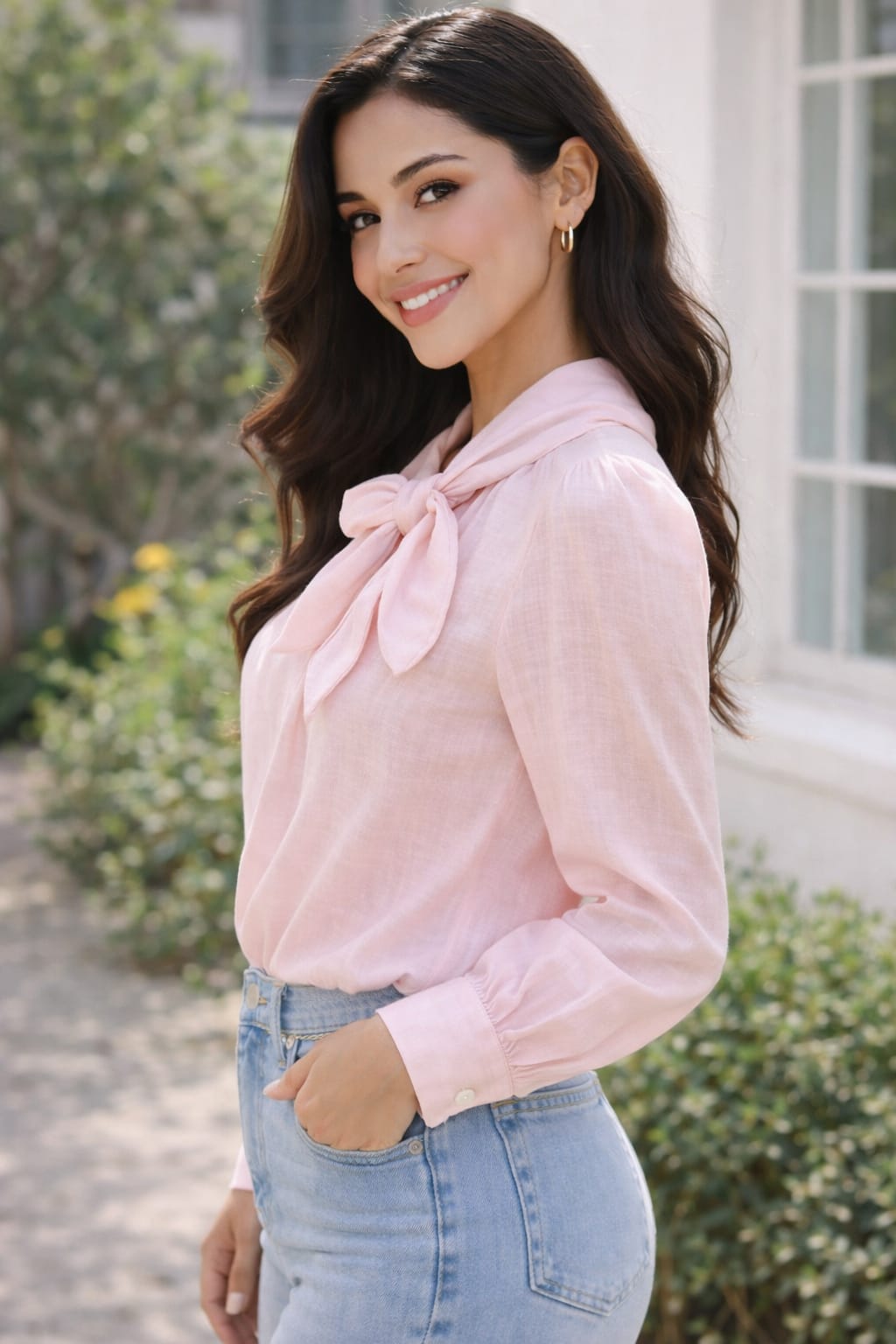 Blusa rosa de tejido ligero con lazada frontal y puño clásico. Un diseño femenino y delicado, ideal para aportar un toque romántico a cualquier look, tanto de diario como más arreglado. Cómoda, fluida y muy favorecedora.