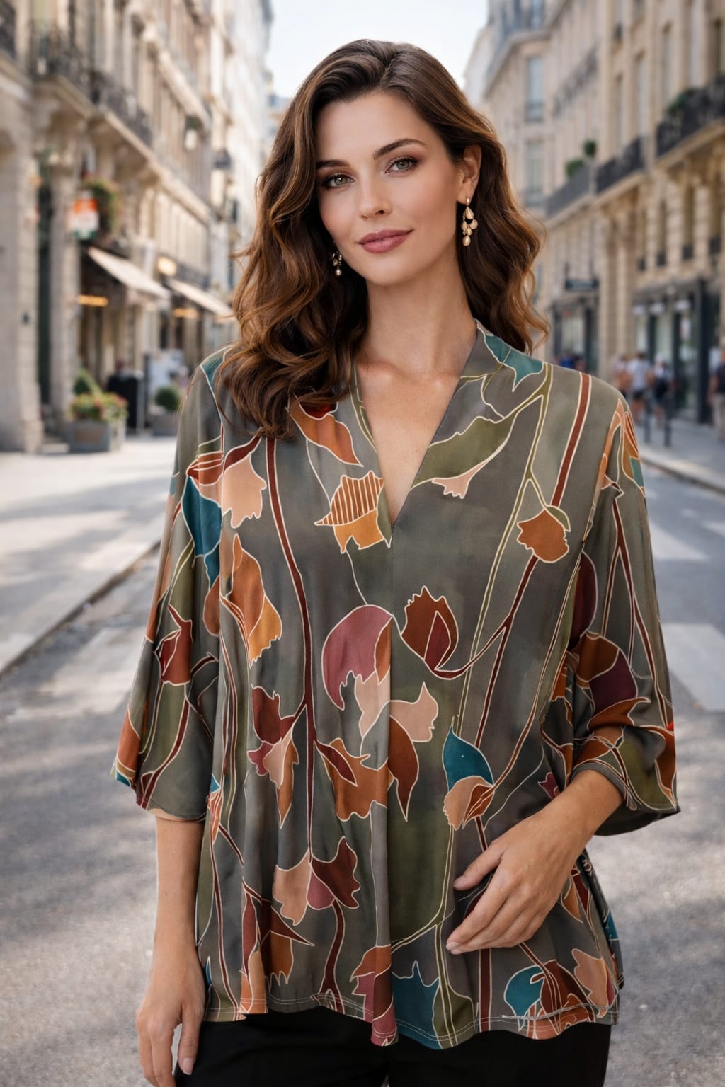 Blusa fluida de corte amplio con escote en pico y manga francesa, confeccionada en tejido ligero y suave. Destaca por su estampado floral en tonos otoñales sobre fondo verde, ideal para aportar elegancia y estilo a looks casuales o de vestir.