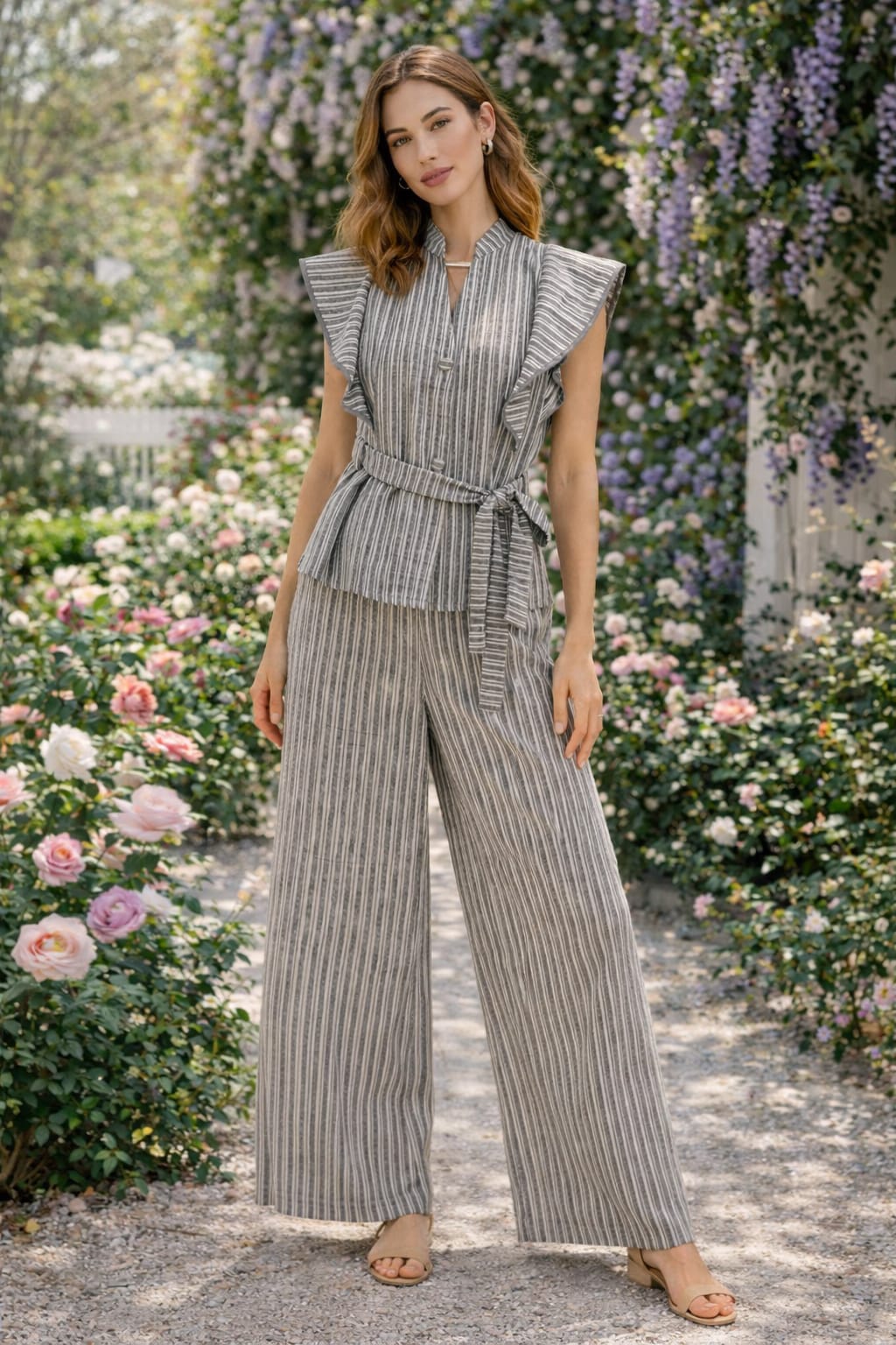 Chaqueta sin mangas de estilo elegante en tejido ligero con finas rayas verticales en tonos neutros. Destaca por sus hombros con volante estructurado, escote en pico y cierre frontal con botones, además de un cinturón del mismo tejido que estiliza la silueta. Una prenda sofisticada y muy favorecedora para looks de entretiempo. ✨