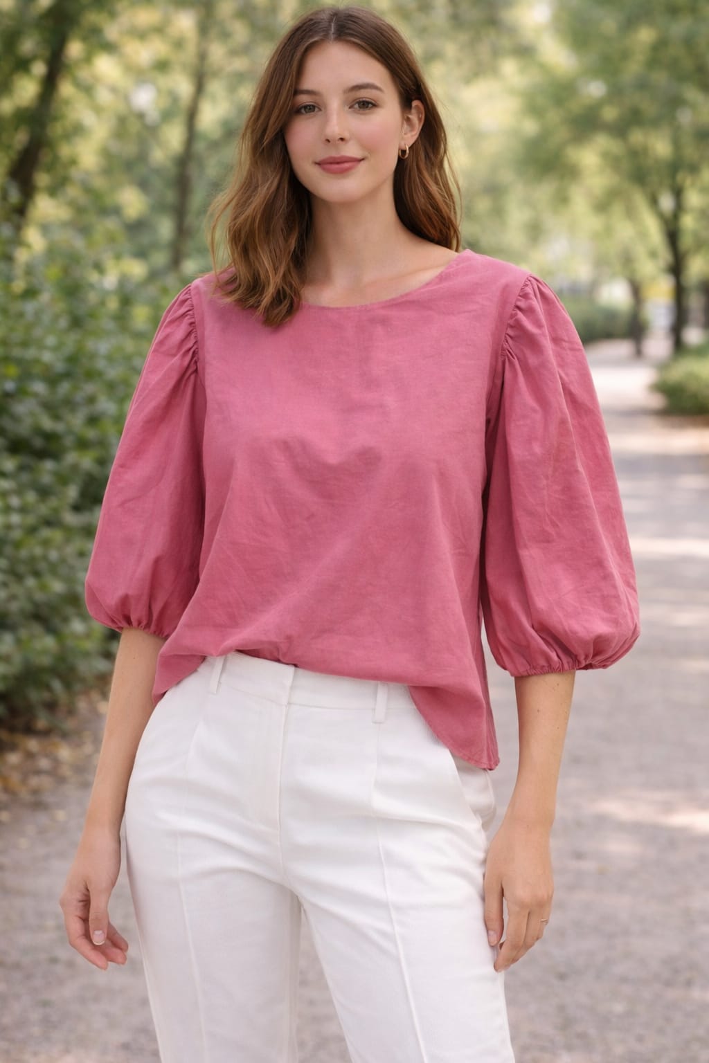 Blusa en tono rosa empolvado de tejido ligero y tacto suave, con escote redondo y mangas abullonadas tres cuartos que aportan volumen y un aire femenino. Su diseño sencillo y elegante la convierte en una prenda versátil, ideal para combinar con pantalones o faldas tanto en looks casuales como más arreglados.