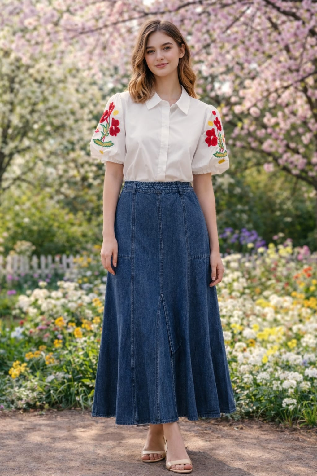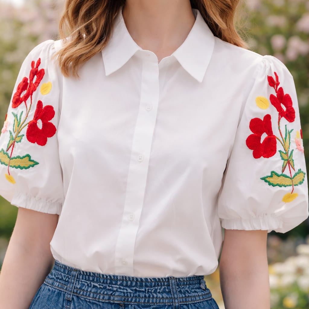 Camisa blanca de corte clásico con manga corta abullonada y delicados bordados florales en rojo, amarillo y verde en las mangas. Confeccionada en tejido ligero y fresco, es una prenda femenina y versátil, perfecta para looks primaverales y veraniegos, ideal para combinar con vaqueros o faldas y aportar un toque alegre y elegante.