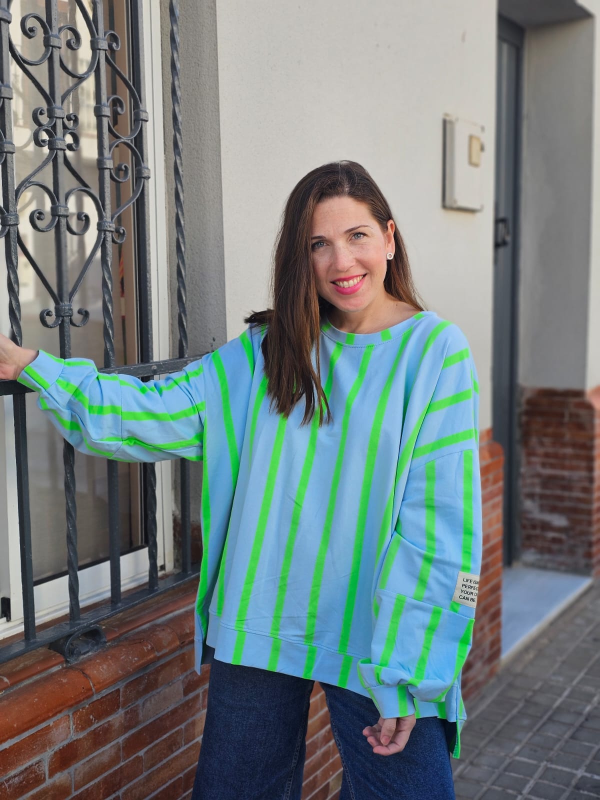 Sudadera oversize de estilo casual en color celeste con rayas verticales en tono más intenso en lima. Diseño de cuello redondo, hombros caídos y mangas amplias con puños ajustados, que aporta comodidad y un aire moderno. Incluye pequeño parche decorativo en la manga. Ideal para looks urbanos combinada con vaqueros o prendas básicas.