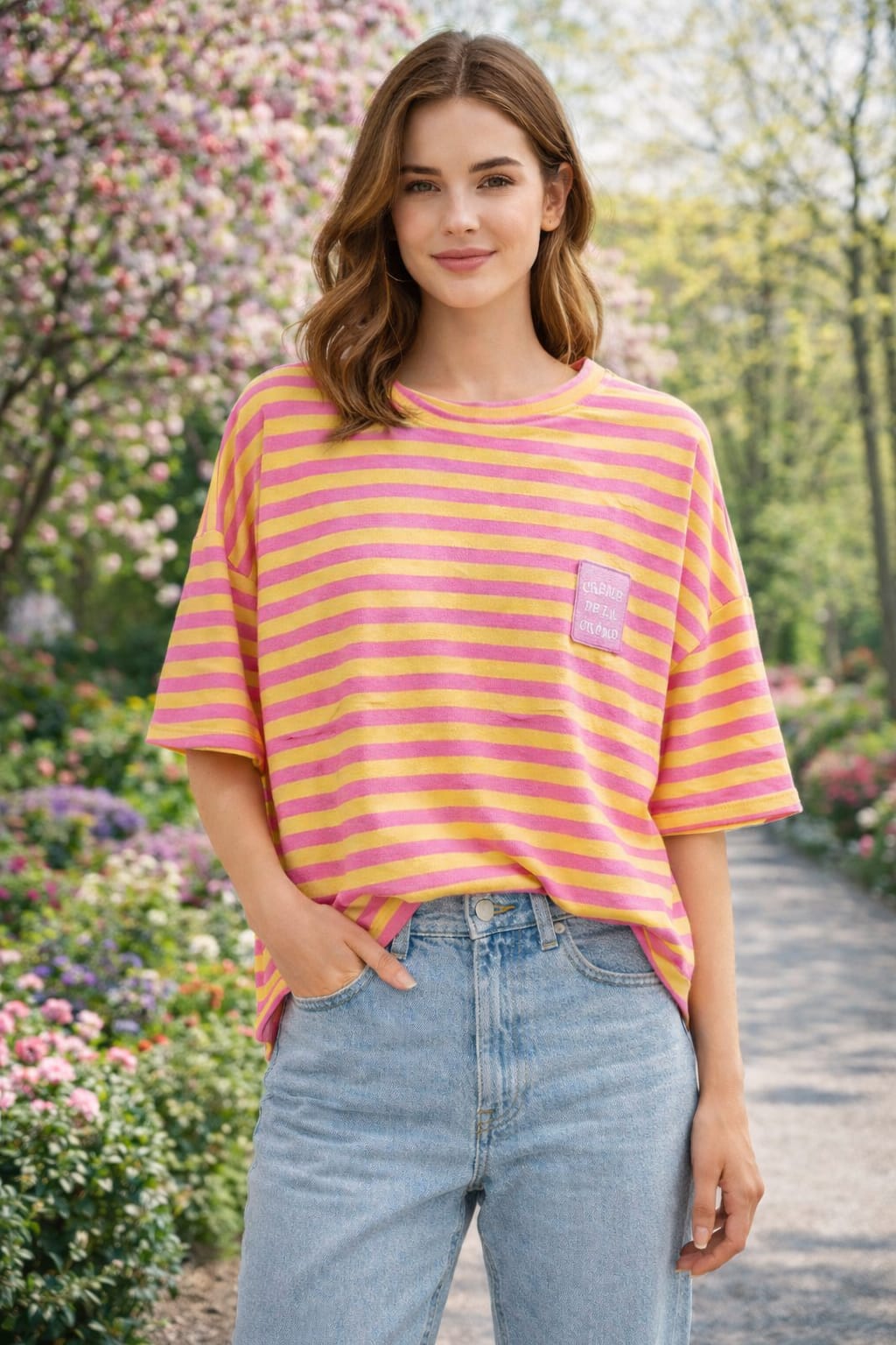 Camiseta oversize de rayas en tonos amarillo y rosa, con manga corta amplia y tejido suave muy cómodo. Diseño juvenil y llamativo con parche decorativo en el pecho, ideal para combinar con vaqueros claros esta primavera.