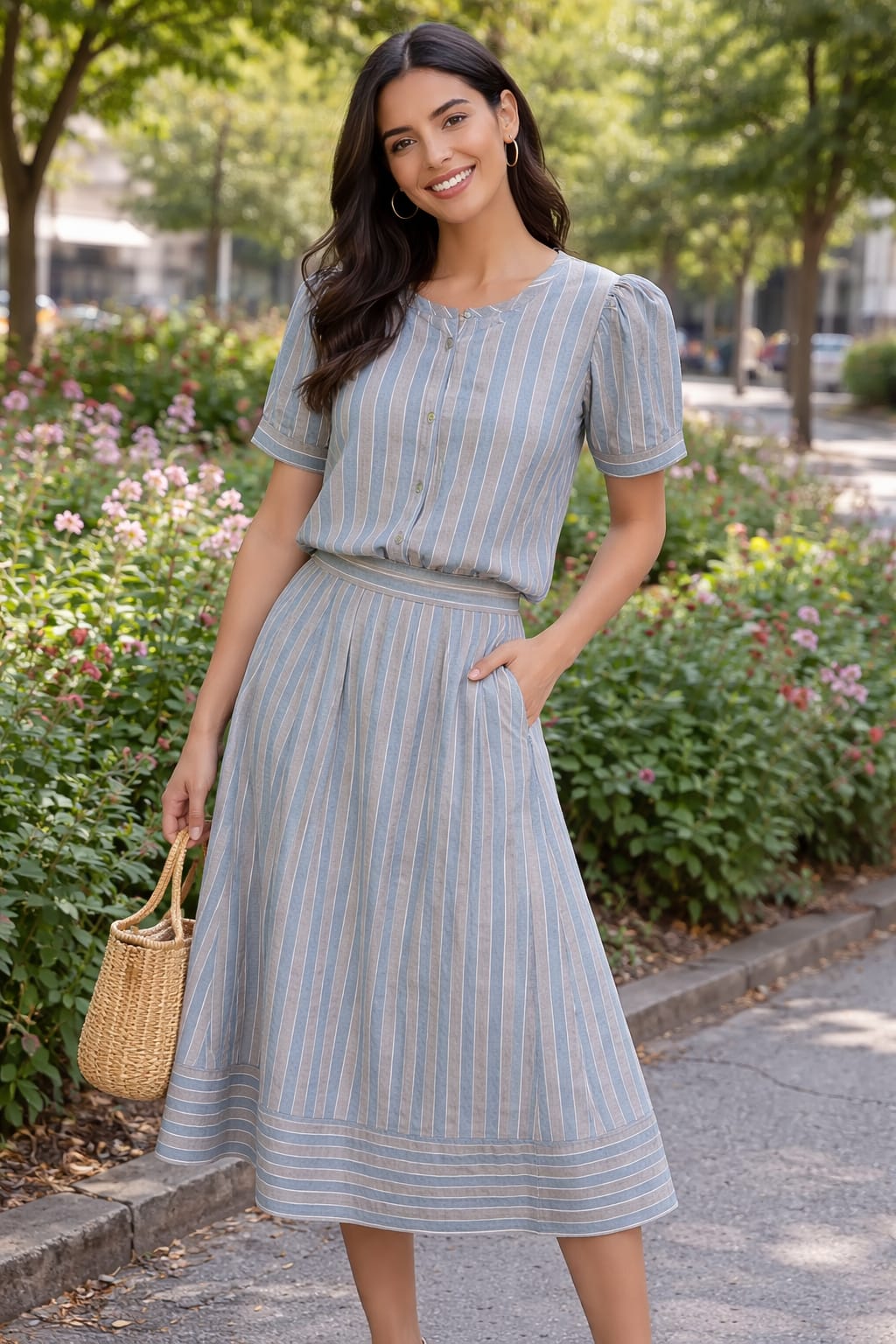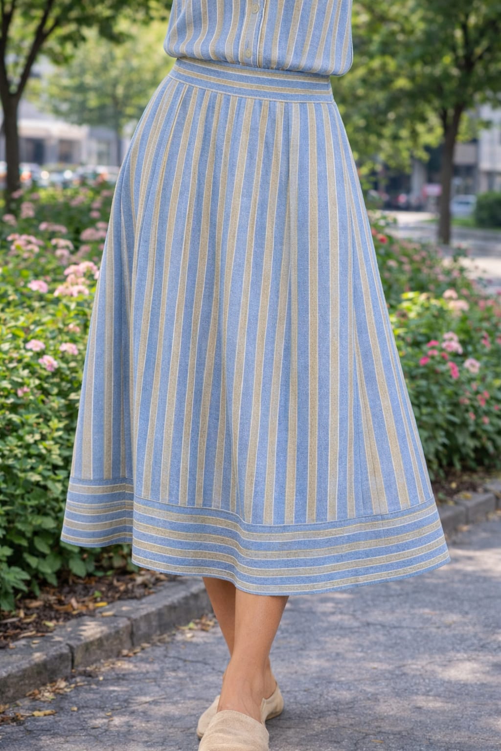 Falda midi de corte evasé con rayas verticales en tonos suaves y cinturilla marcada que estiliza la silueta. Ligera y fluida, ideal para looks femeninos y frescos de primavera-verano.