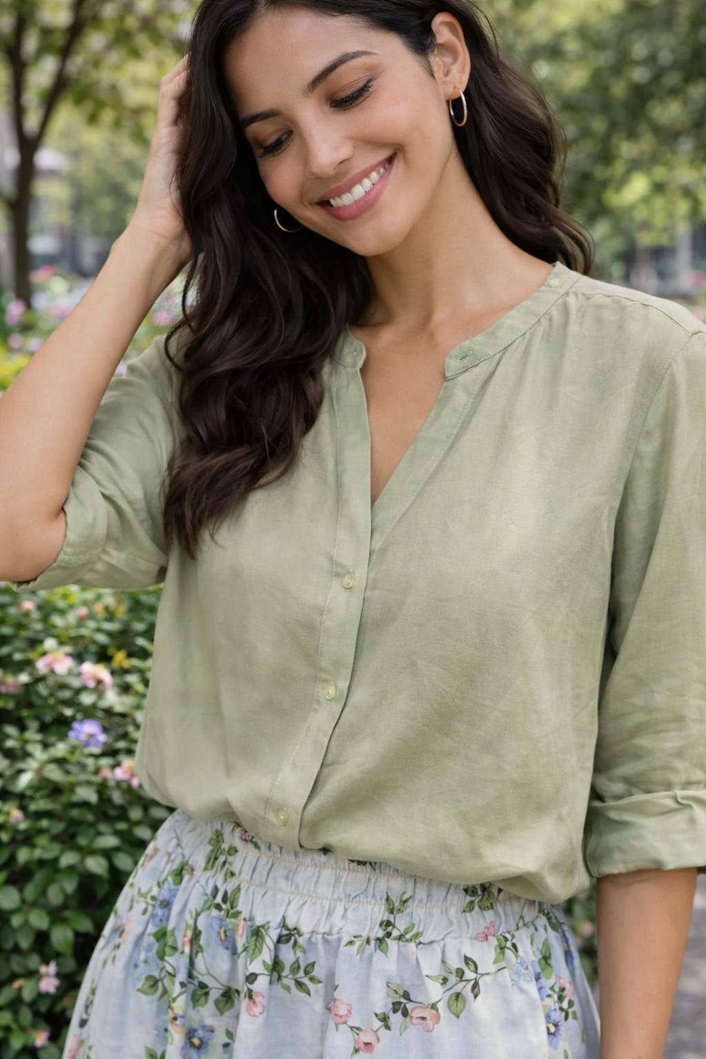 Blusa lisa de manga larga remangable en tono verde suave, con cuello mao y botonadura frontal. Ligera, cómoda y muy versátil, perfecta para looks frescos y elegantes de diario.