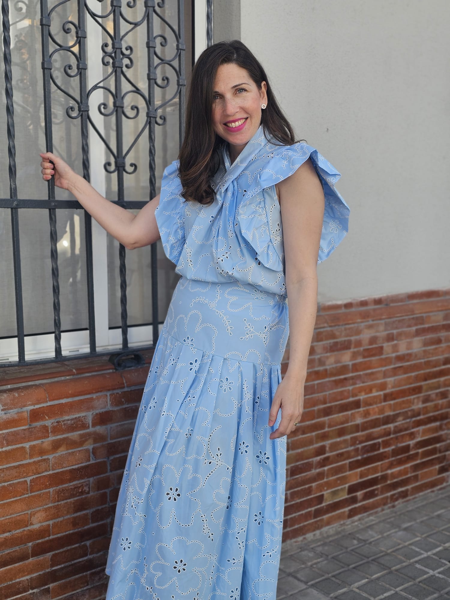 Conjunto celeste de dos piezas en tejido bordado tipo calado, muy ligero y elegante. Blusa con cuello envolvente y mangas con volante que aportan un toque sofisticado, combinada con falda midi de caída fluida y cintura alta que estiliza la figura. Ideal para looks de primavera-verano, tanto para eventos como para el día a día con un aire fresco y femenino.
