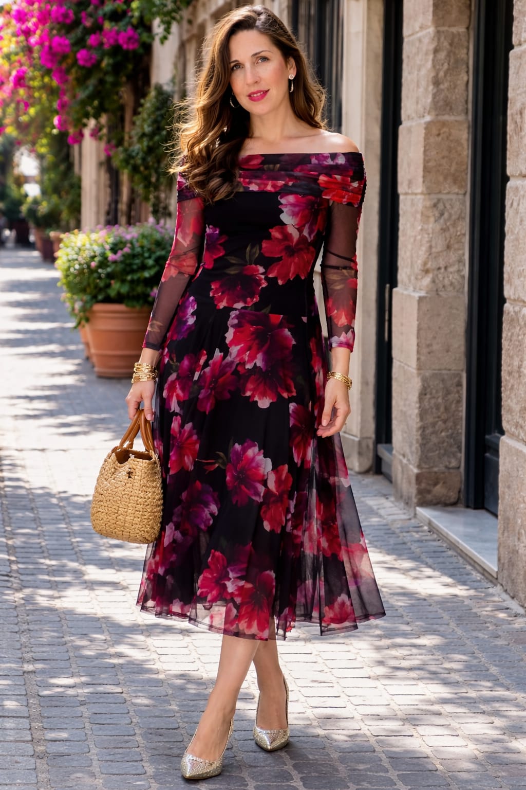 Vestido midi elegante con escote bardot que deja los hombros al descubierto, confeccionado en tejido fluido con estampado floral en tonos rojos sobre fondo negro. Incorpora mangas largas semitransparentes y falda con caída ligera que aporta movimiento y sofisticación. Ideal para eventos, celebraciones o looks especiales con un toque femenino y distinguido. 💐