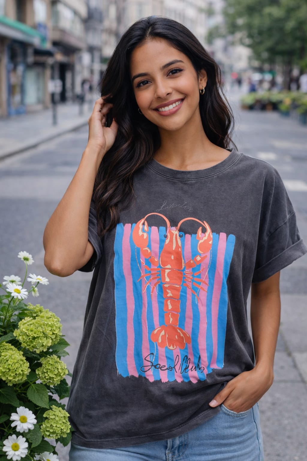 Camiseta gris de estilo casual con estampado frontal de una langosta en tonos coral sobre franjas verticales azules y rosas. Un diseño moderno y llamativo que aporta un toque veraniego y desenfadado al conjunto.