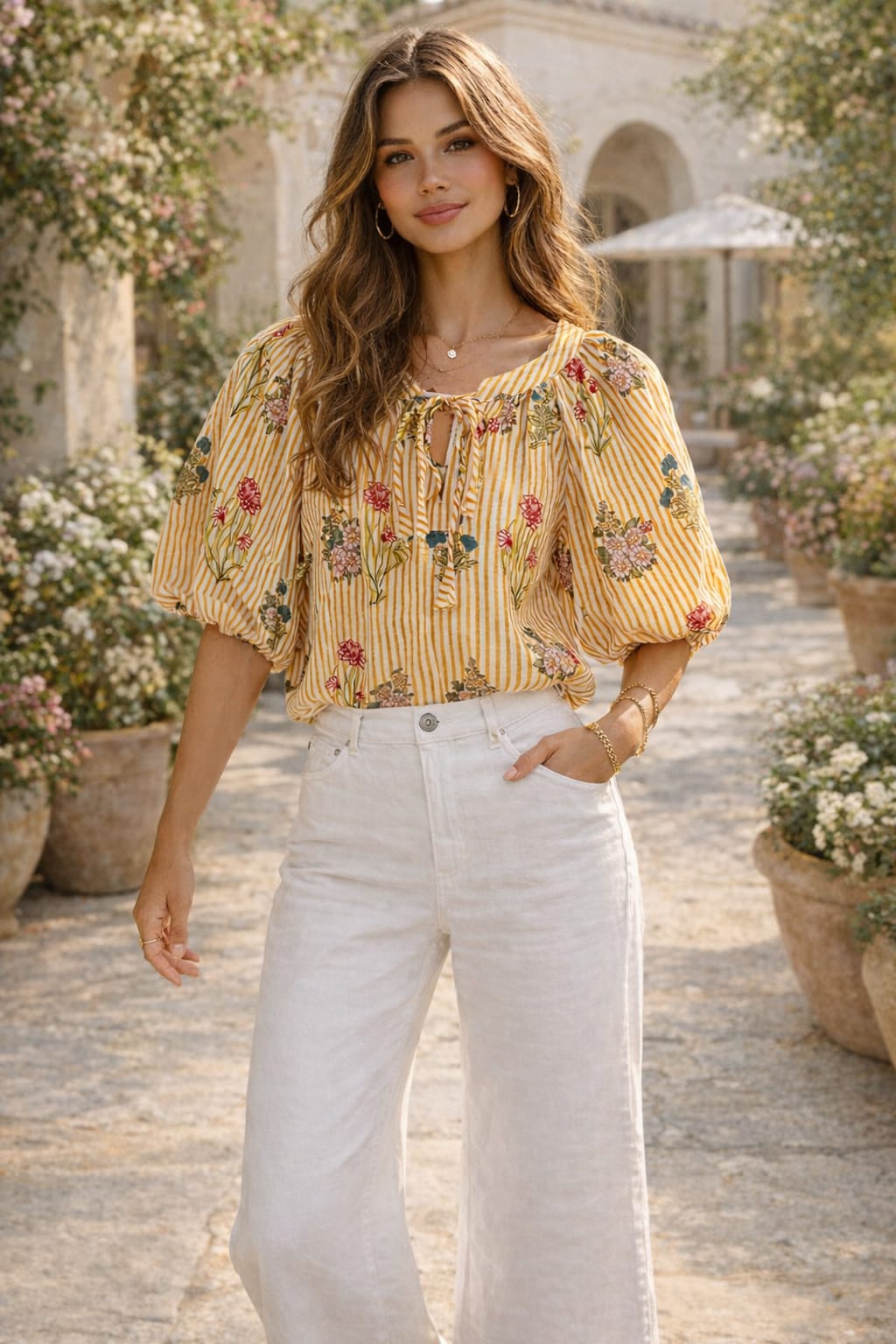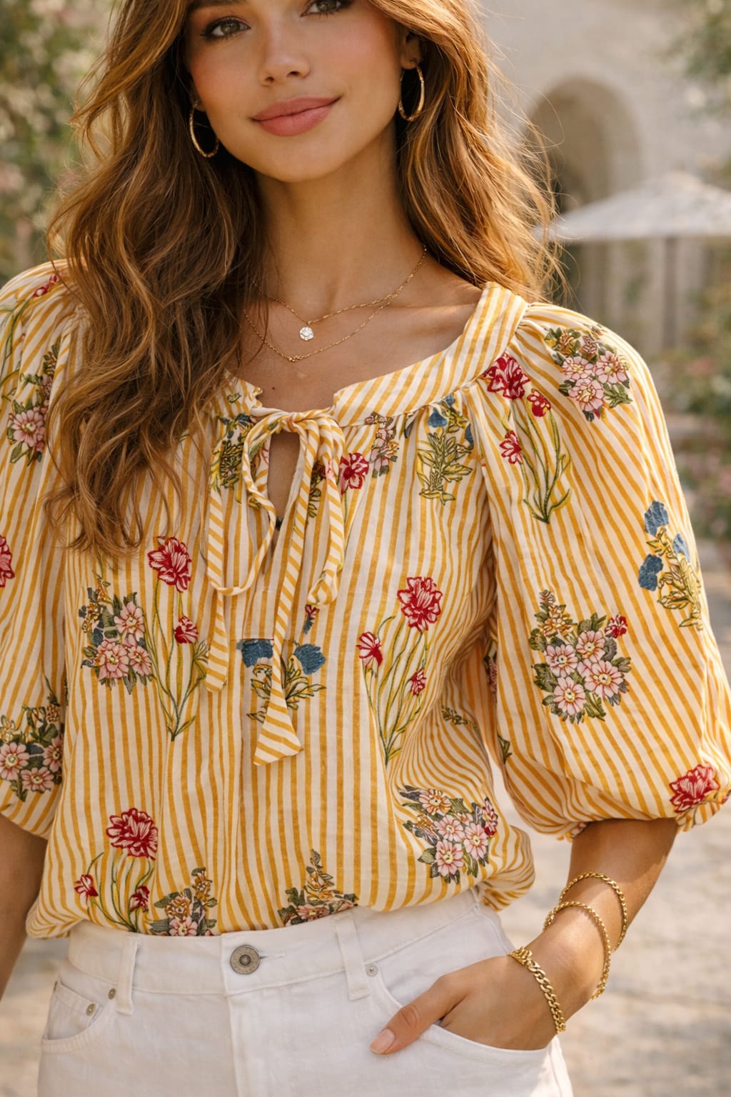 Blusa de rayas en tonos mostaza con estampado floral, manga abullonada y escote con lazada. Ligera, femenina y perfecta para looks de primavera 🌸